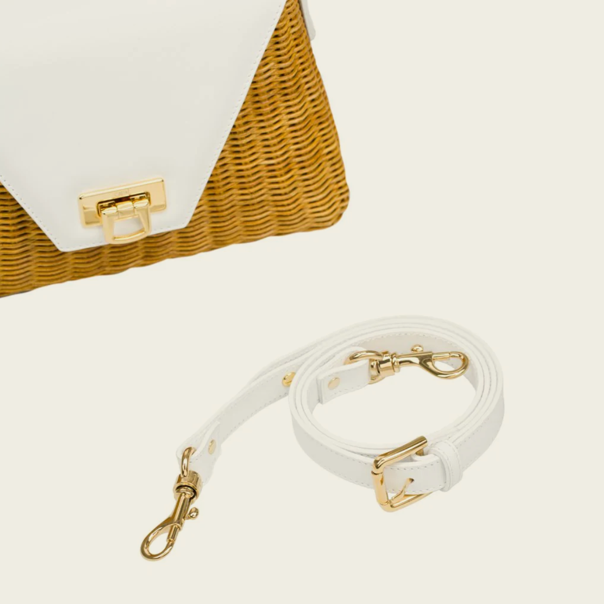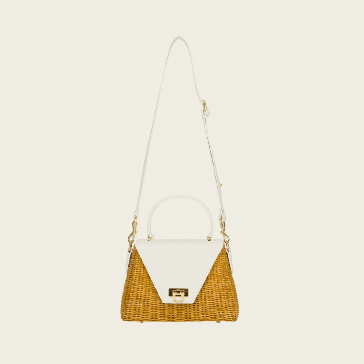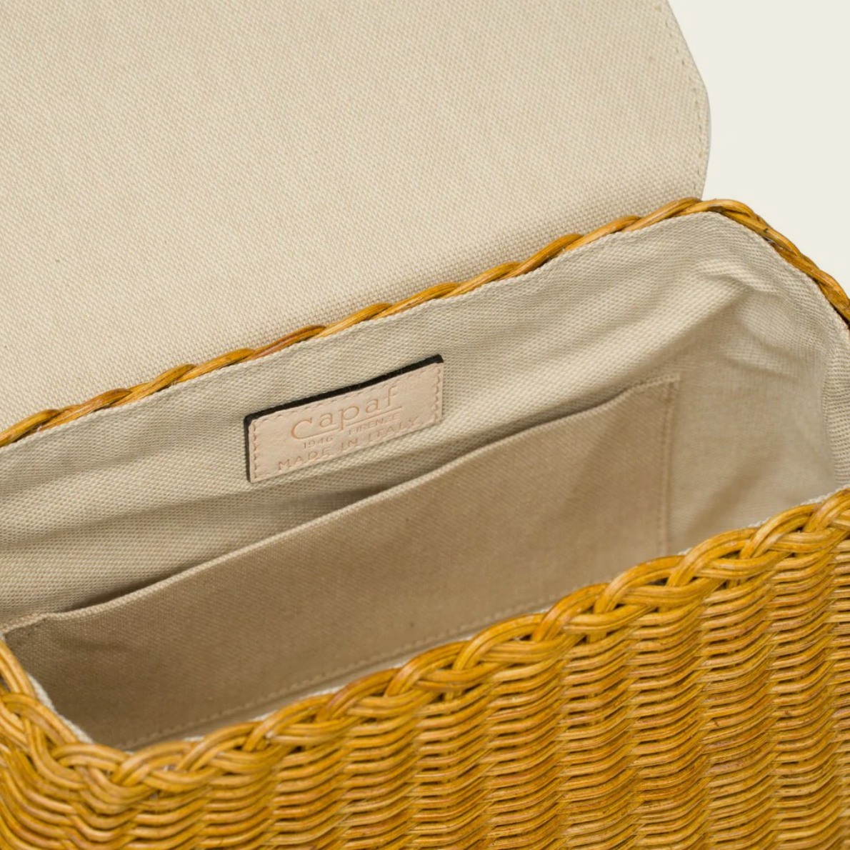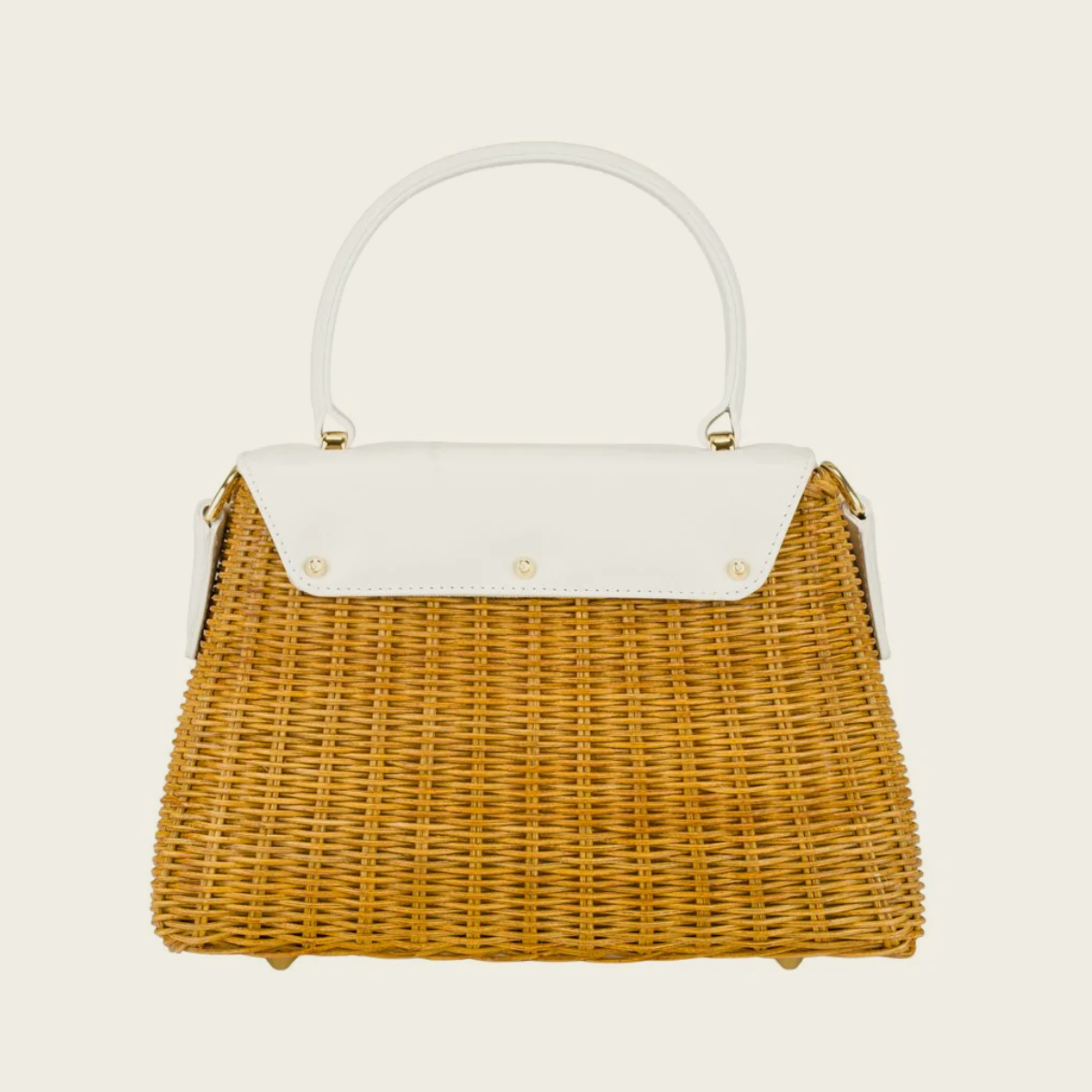 Fortuna is a top handle bag crafted by the artisans of historic Capaf in Florence, Tuscany. Giuliano Bonechi and his wife, Marina, created this stunning bag using rattan and calfskin leather. With this fun contrast in texture, elegant silhouette and detachable leather strap, Fortuna deserves to be in the spotlight!