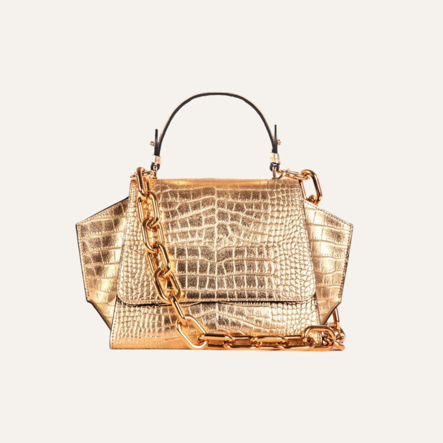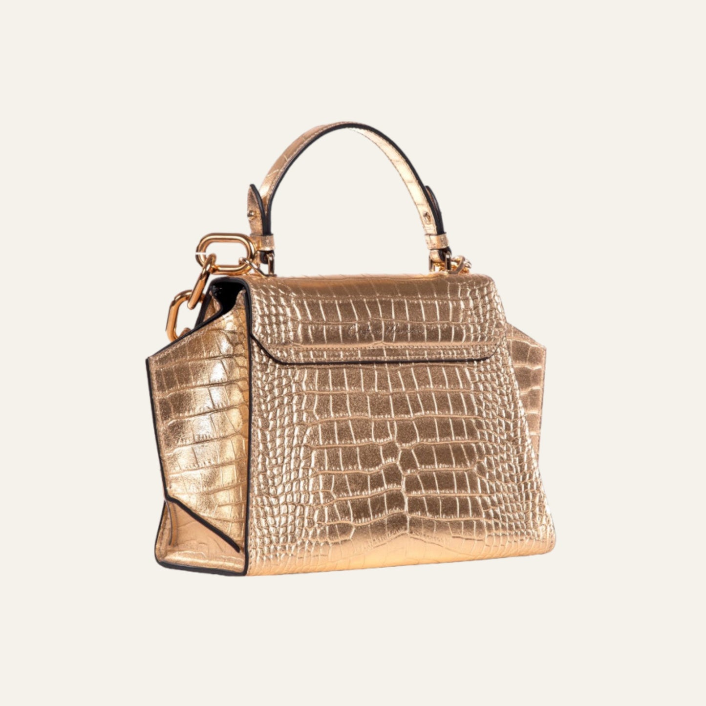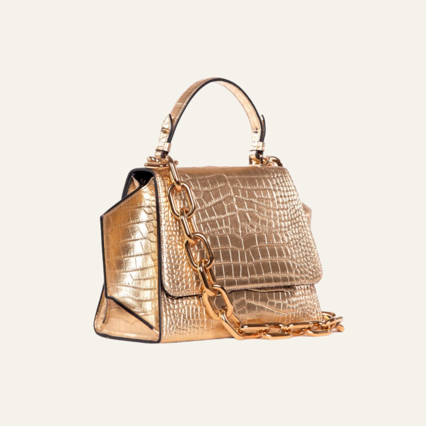 Gemma Mini is a small and elegant flap bag made of high quality crocodile printed calfskin. It has an inside pockets with a zip and a plastic chain strap. It can be carried by hand or over the shoulder, a fresh, young and exquisite solution. Elegance and quality made in Italy.