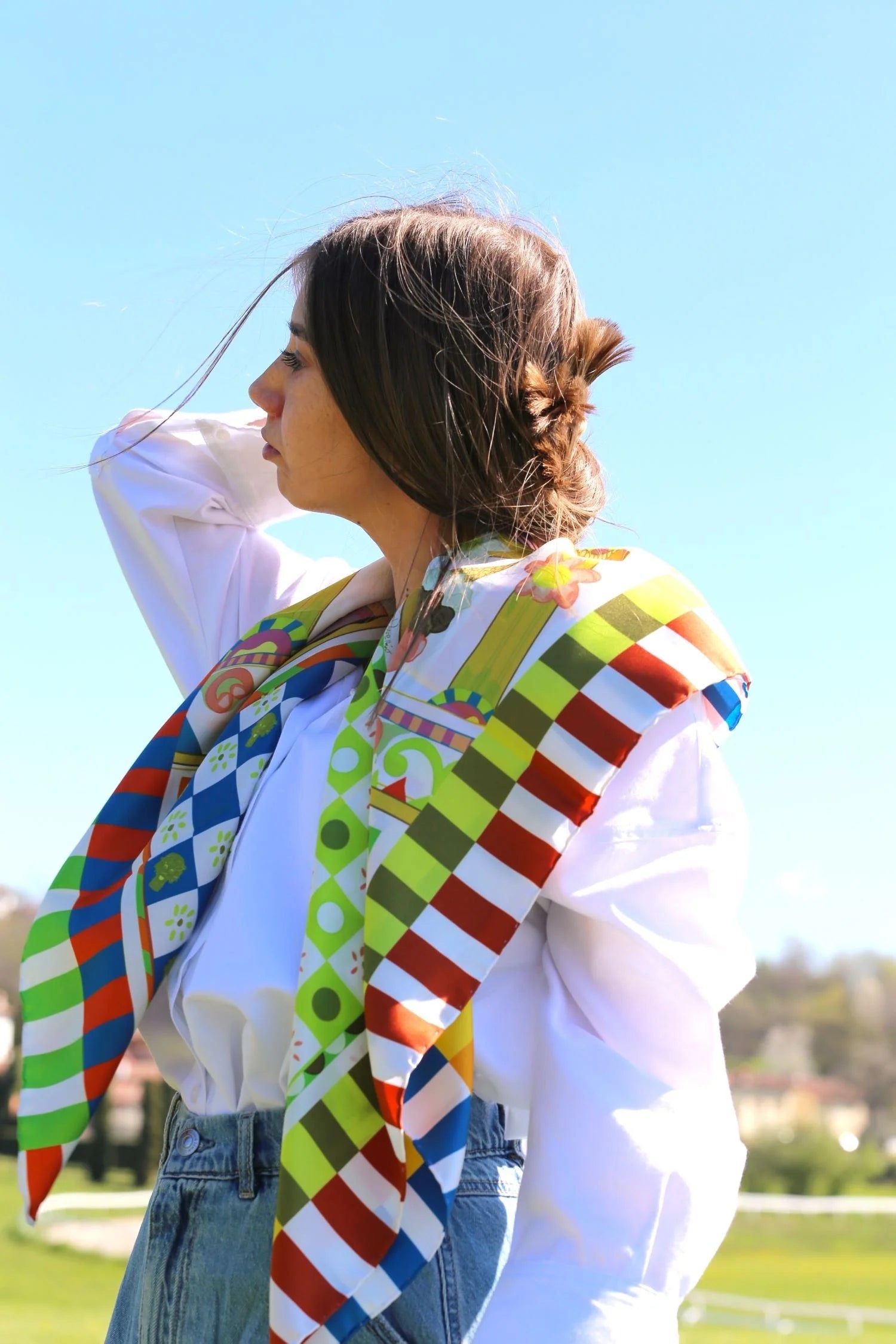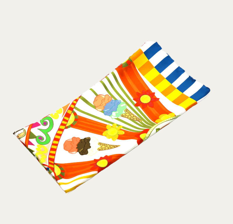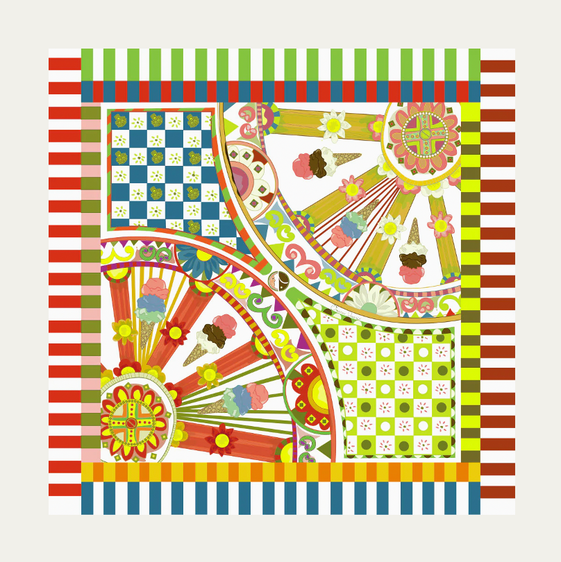 Carré in 100% silk twill created by the Designer Chiara Daverio. This design contains the joy of Sicily, colors, geometric shapes and designs. Chiara, after her first trip to the island, wanted to pay homage to Sicilian art and these real two-wheeled works of art made by the best Sicilian craftsmen since ancient times ...Summer is filled with colors, village festivals and starry nights with the moon shining in the middle of the sky; and it is there that among the geometries of the buildings you can also feel observed, but don't worry, they are only the typical ceramic Moorish heads! And why not… in this heat, a nice ice cream fits perfectly!