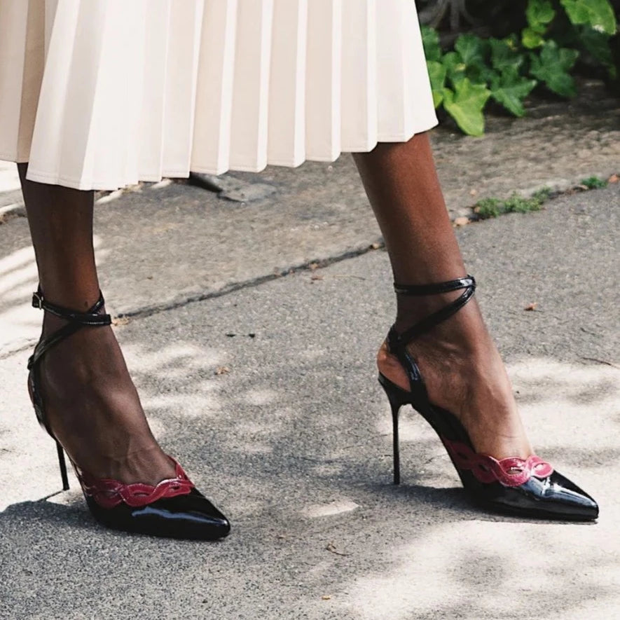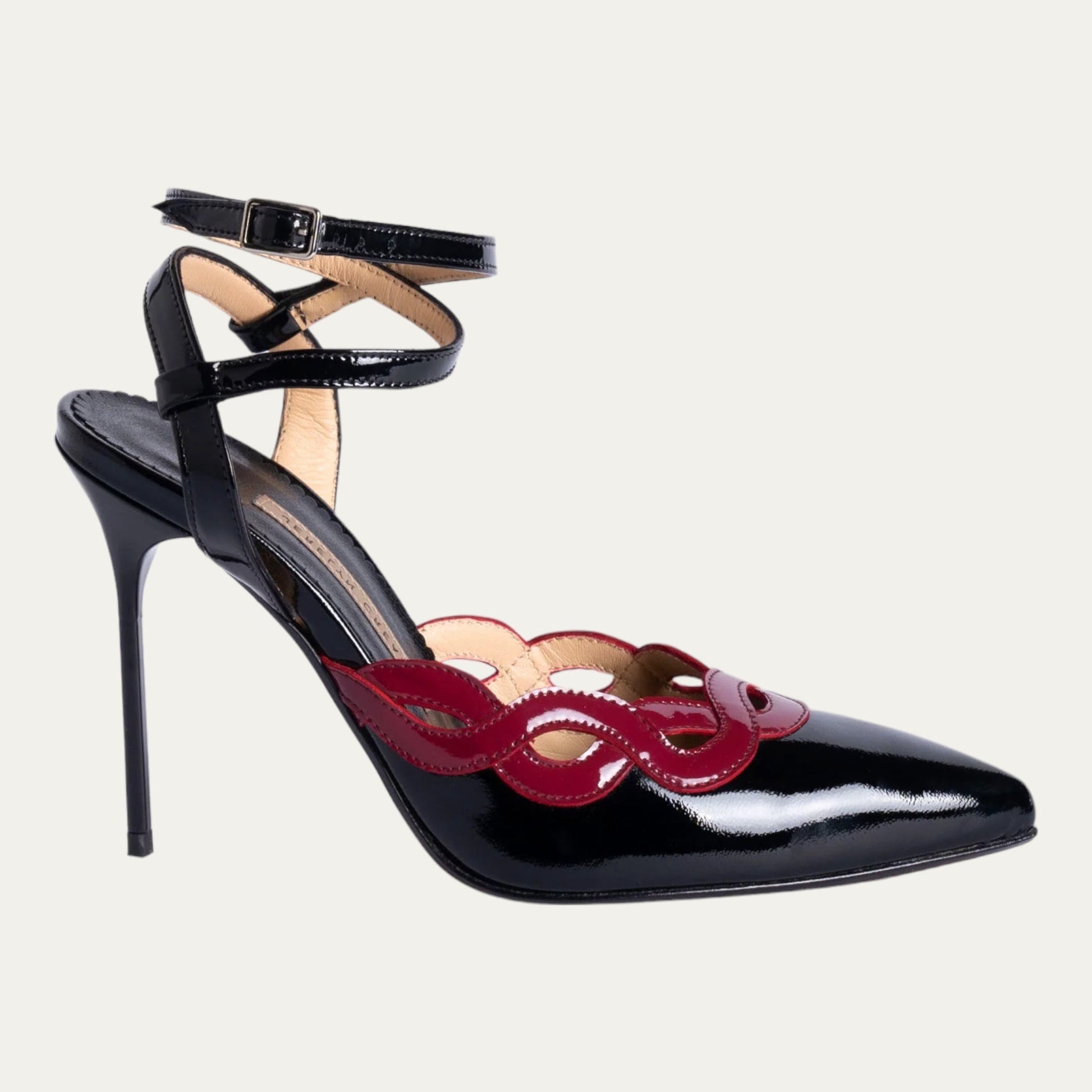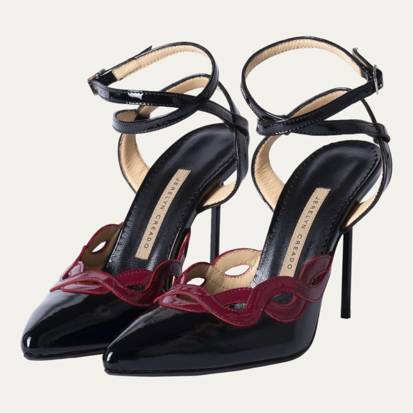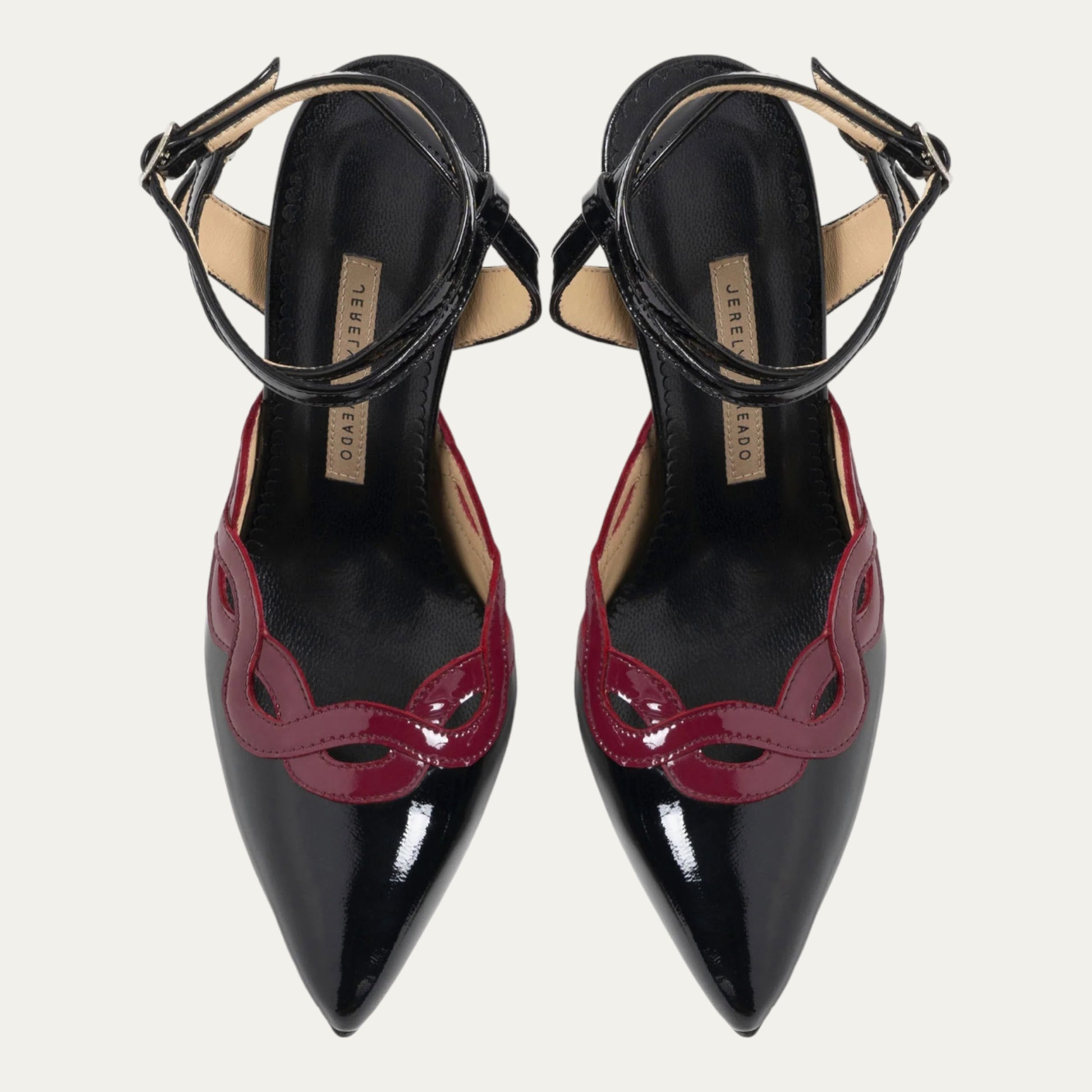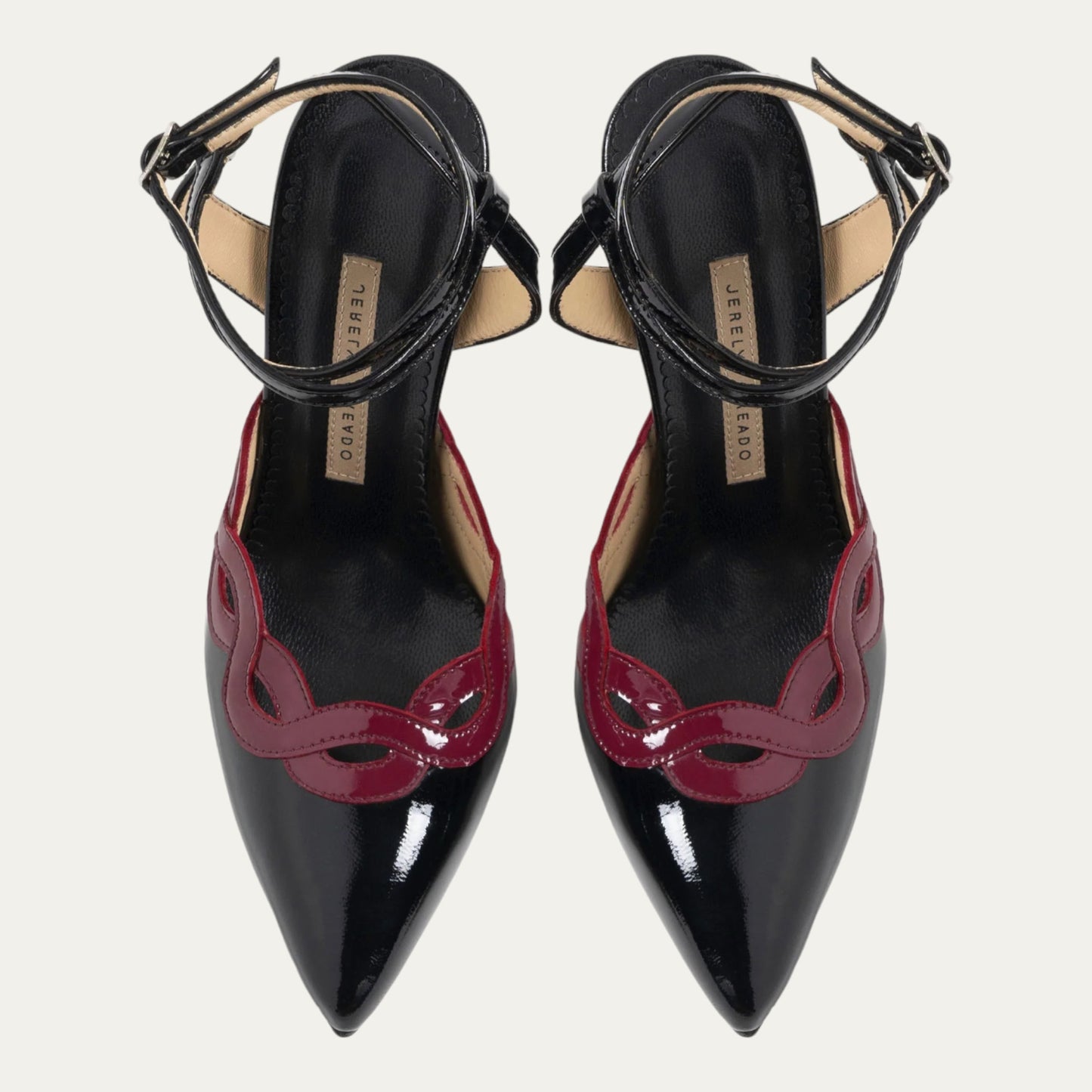The Lola women's shoe in elegant black and burgundy combination captures the essence of family and cultural ties, inspired by the deep connection between people in Indian culture. This handcrafted shoe model gracefully represents the importance of family ties through a refined and sophisticated design. The black and burgundy hue lends a touch of understated sophistication and versatility, adapting to a variety of styles and occasions. The woven pattern adorning the shoe symbolizes the strength and beauty of family ties, while the 9.5-cm stiletto heel enhances the silhouette.