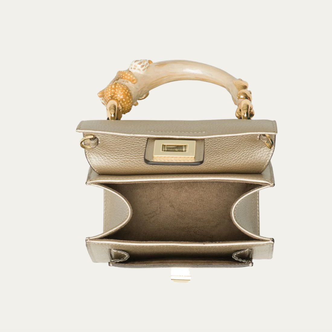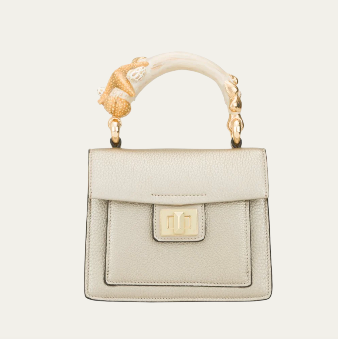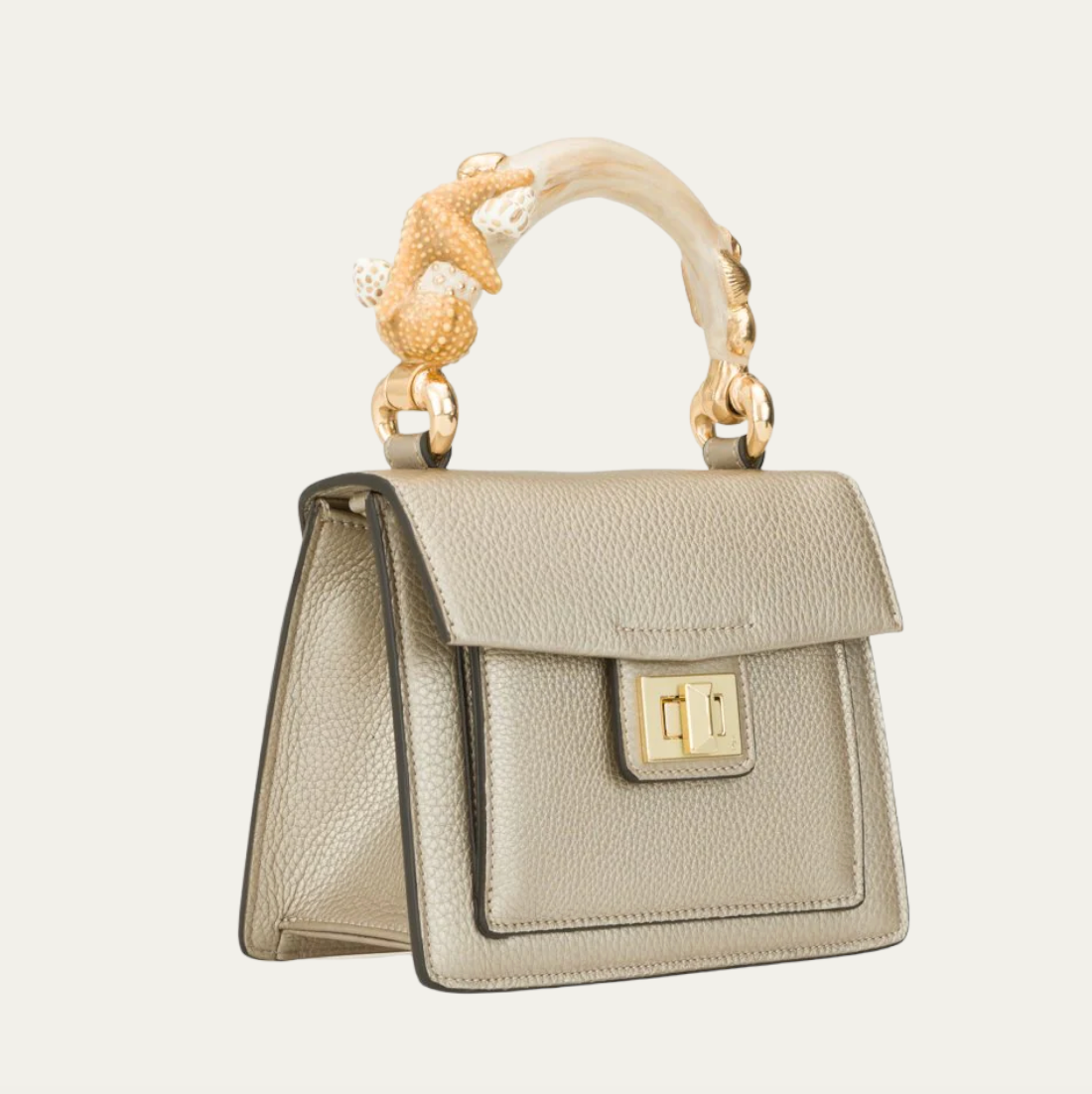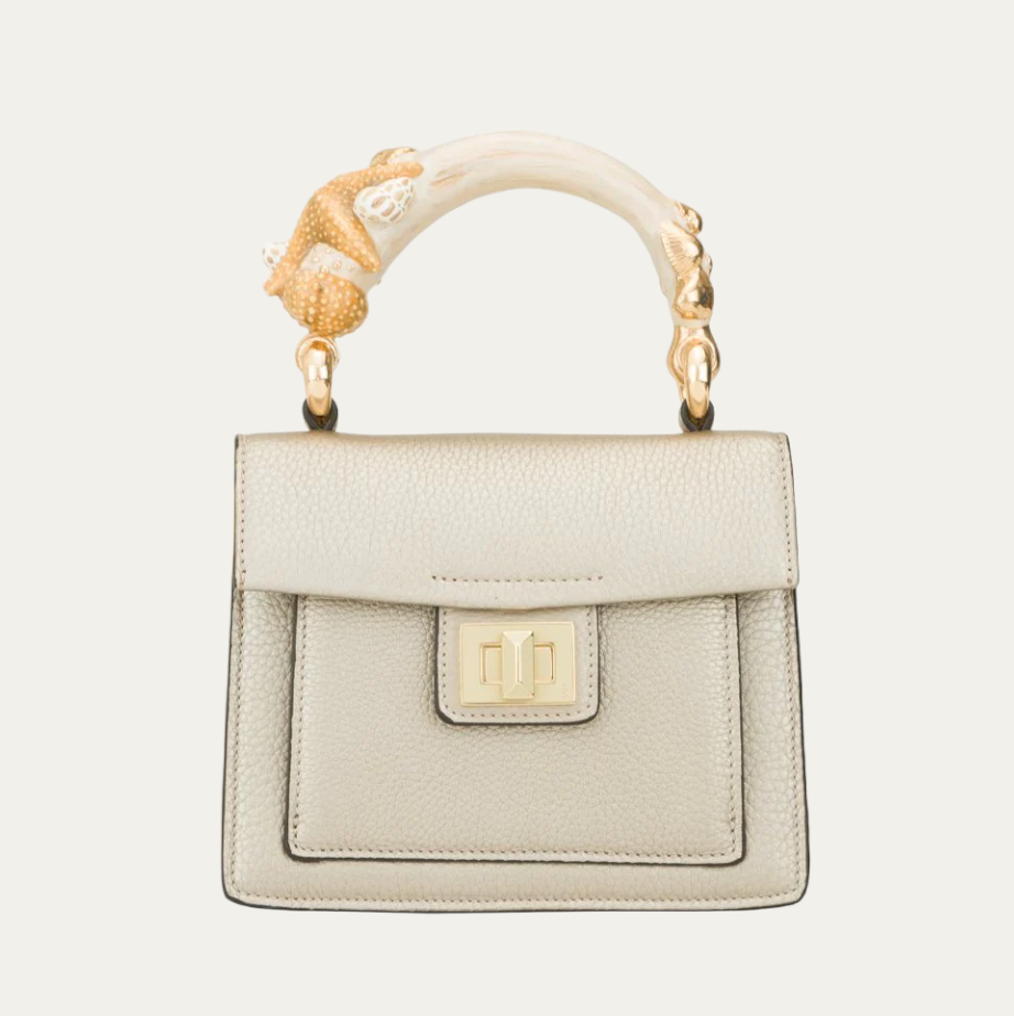 Stella Marina is a calfskin top handle bag crafted by the master artisans of Biagini in Modena, Emilia-Romagna. This fun and unique bag comes with a hand-painted enamel brass handle in the shape of an animal. Stella Marina is elegant, lightweight and can be easily transformed into a crossbody with the detachable strap.