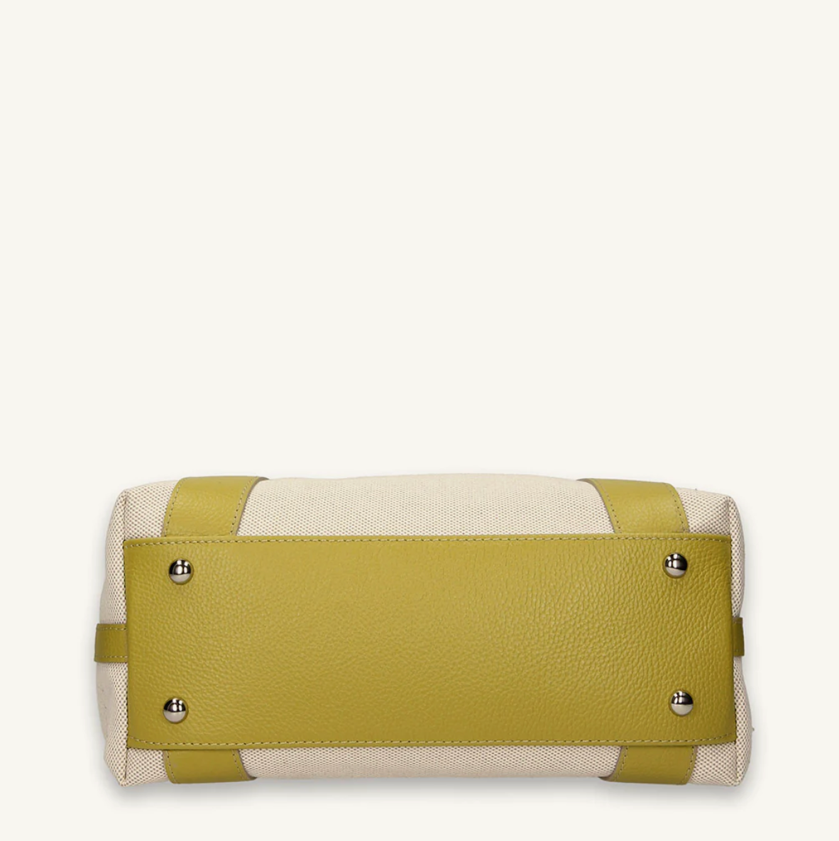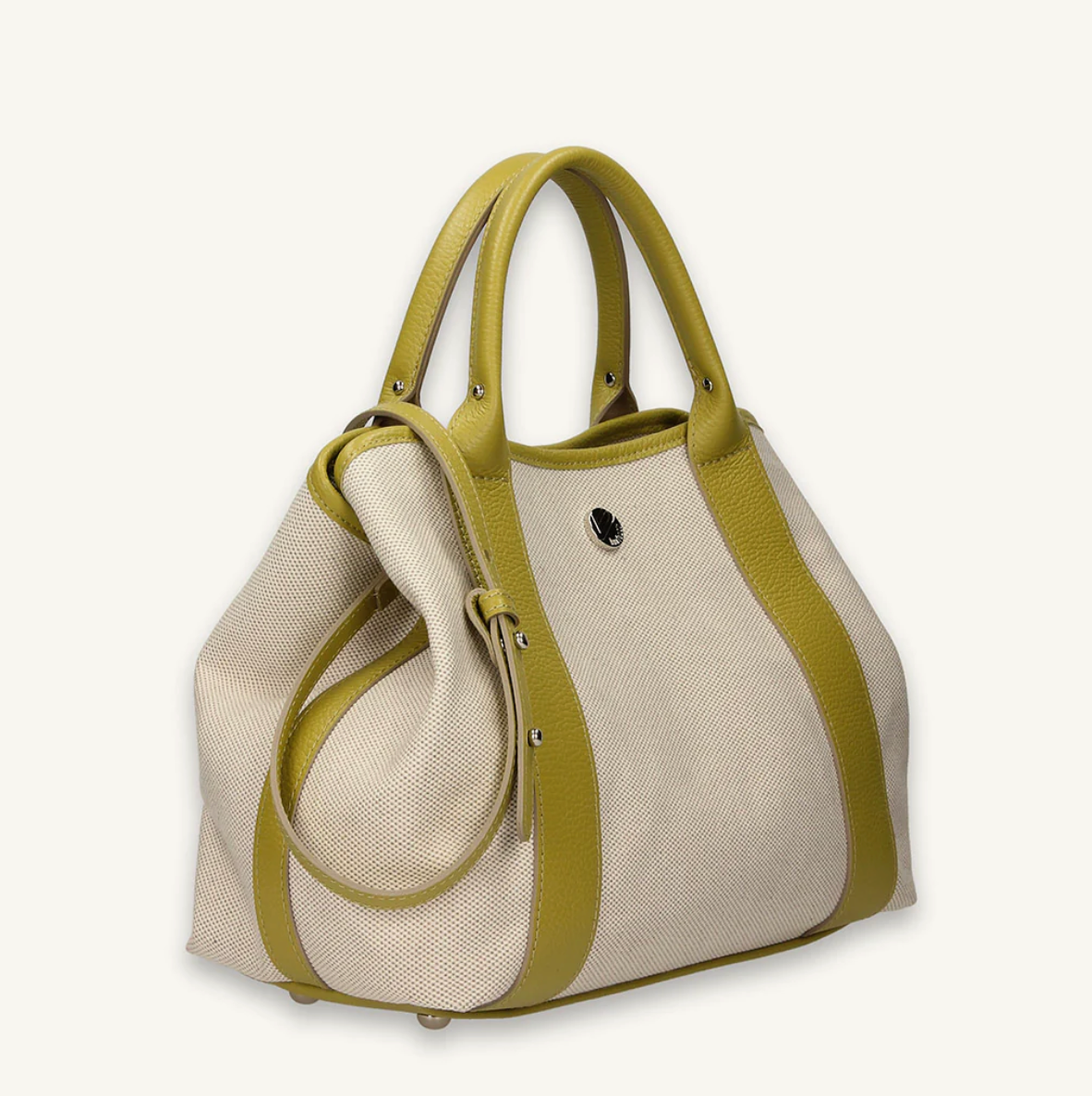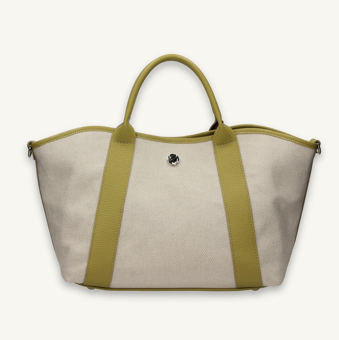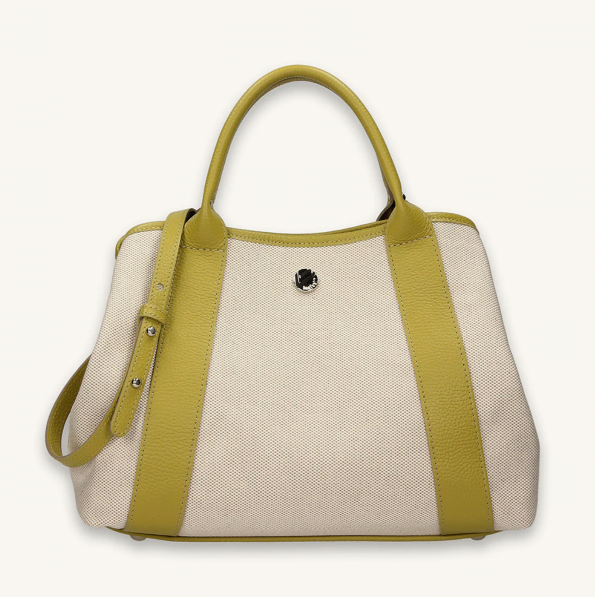 Onda B is a top handle bag composed of cotton canvas and calfskin made by Bonfanti.