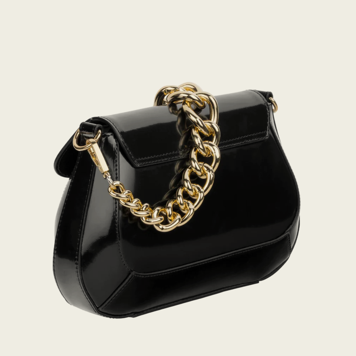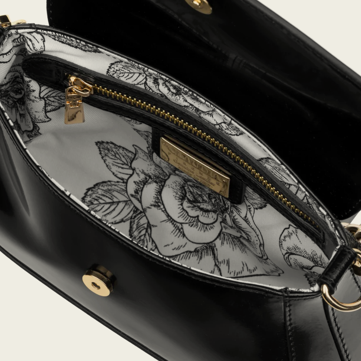 Camilla is a bag in high polished calf with black and white roses patterned lining. It is an ergonomic bag with a chunky rich chain and a comfortable detachable and adjustable strap. The bag is available in an elegant black and warm cognac.