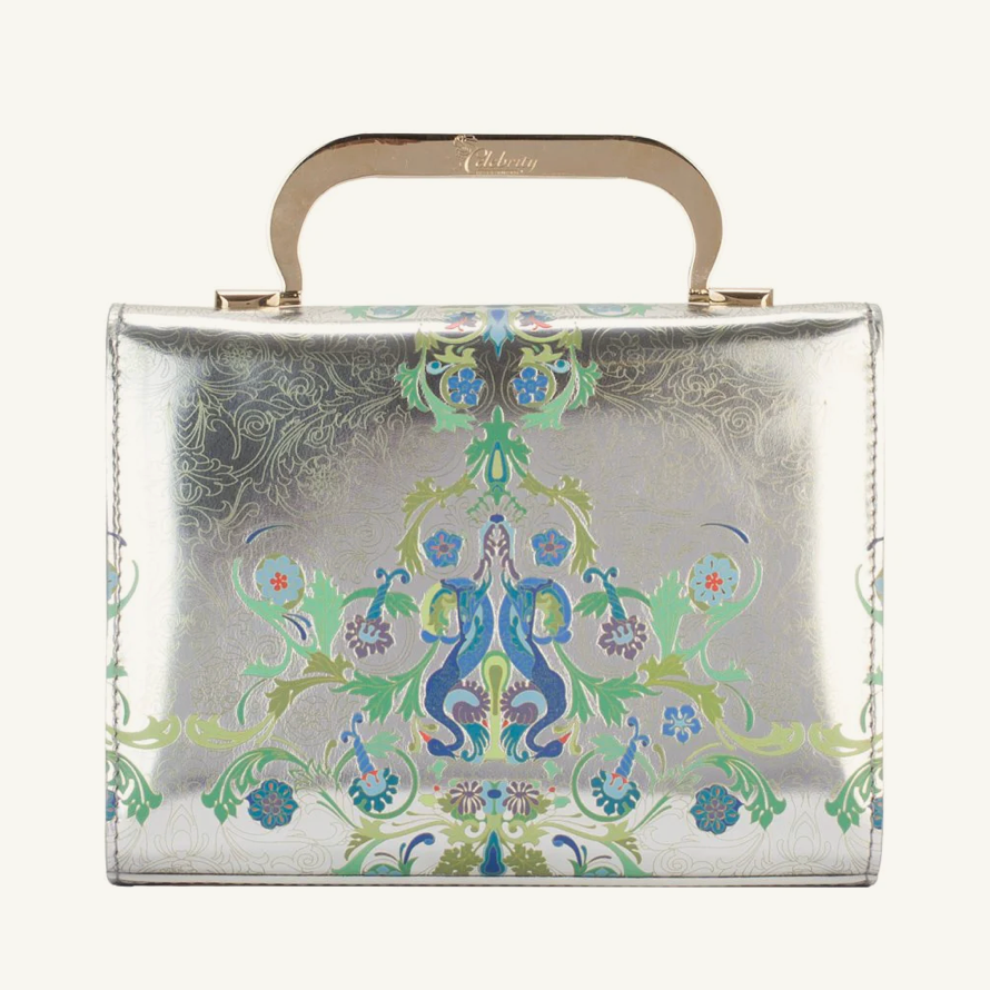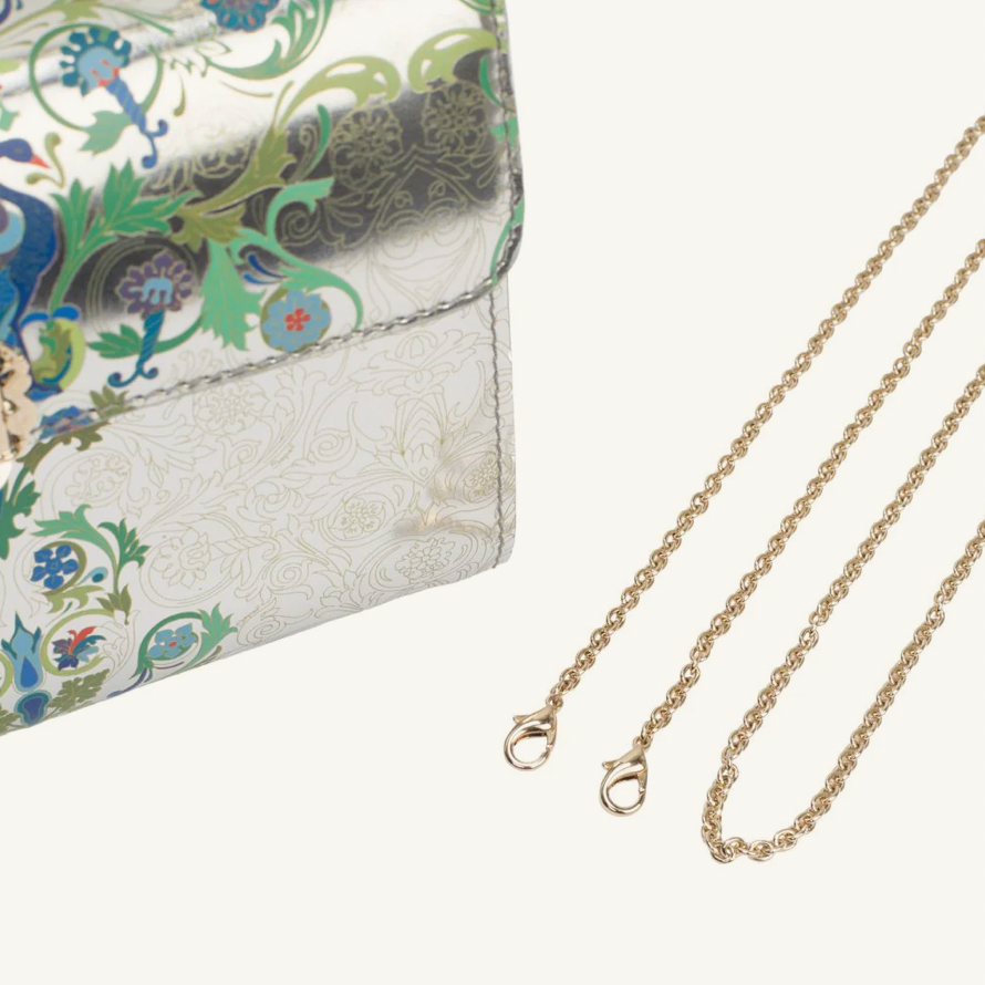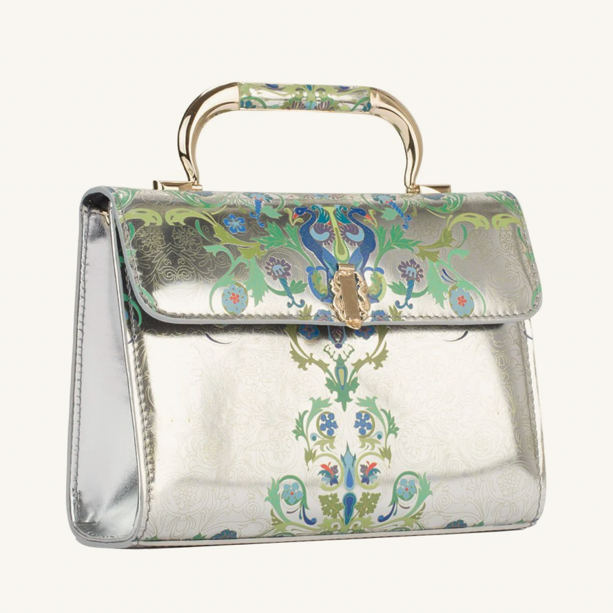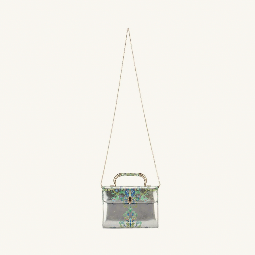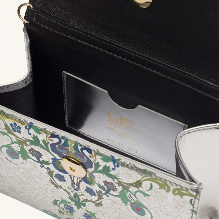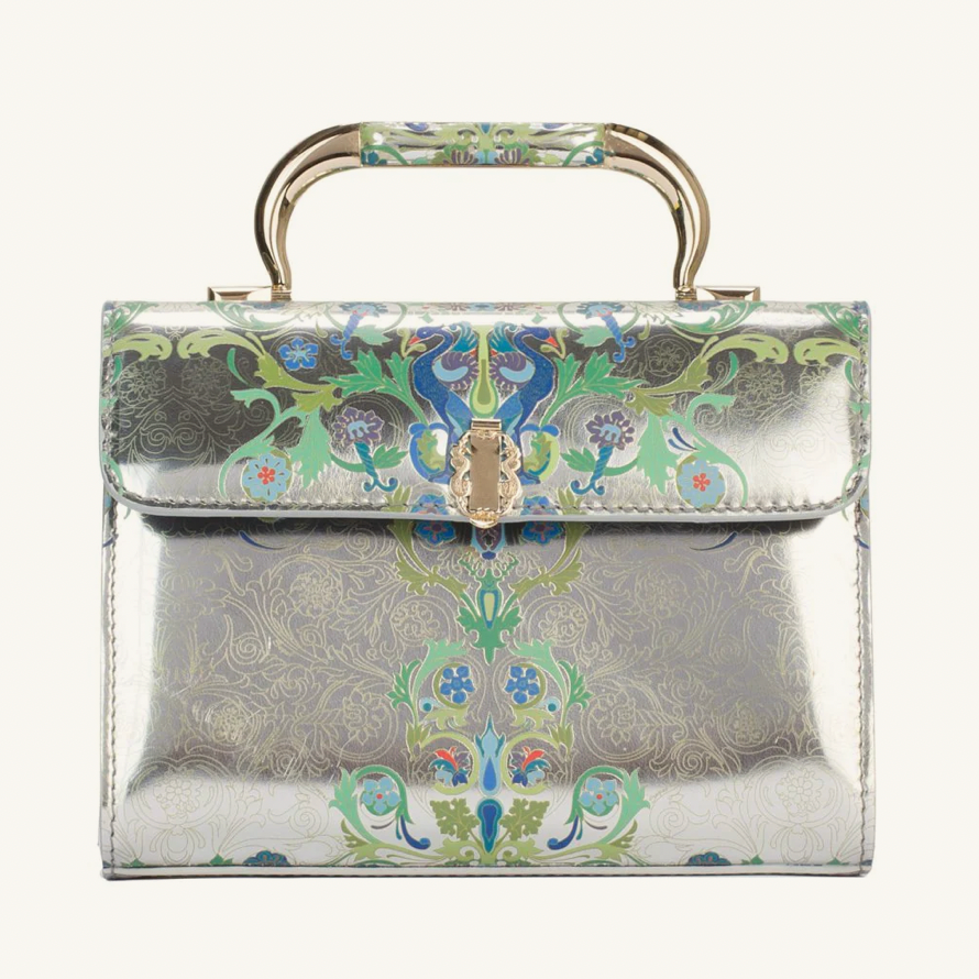 Celebrity is a top handle bag crafted by Sapaf Atelier in Florence, Tuscany. A stunning display of Italian craftsmanship, this bag features an intricate multicolor floral pattern and rose gold-toned hardware. For a hands-free option, simply attach the chain strap and sling across your shoulder. Perfect for either a casual lunch or fancy night out, Celebrity will definitely steal the show no matter the occasion!
