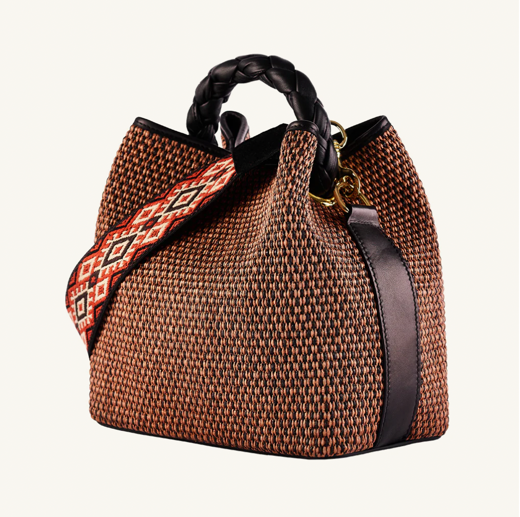 Coral is a top handle Italian bag crafted by ViaMailBag in Empoli. Made of raffia, it is a sleek style that can take you through the day with ease. Coral features a leather handle but also a detachable shoulder strap for hands-free convenience. The bag boasts a spacious compartment equipped with a small zipper pocket to keep your valuables in place.