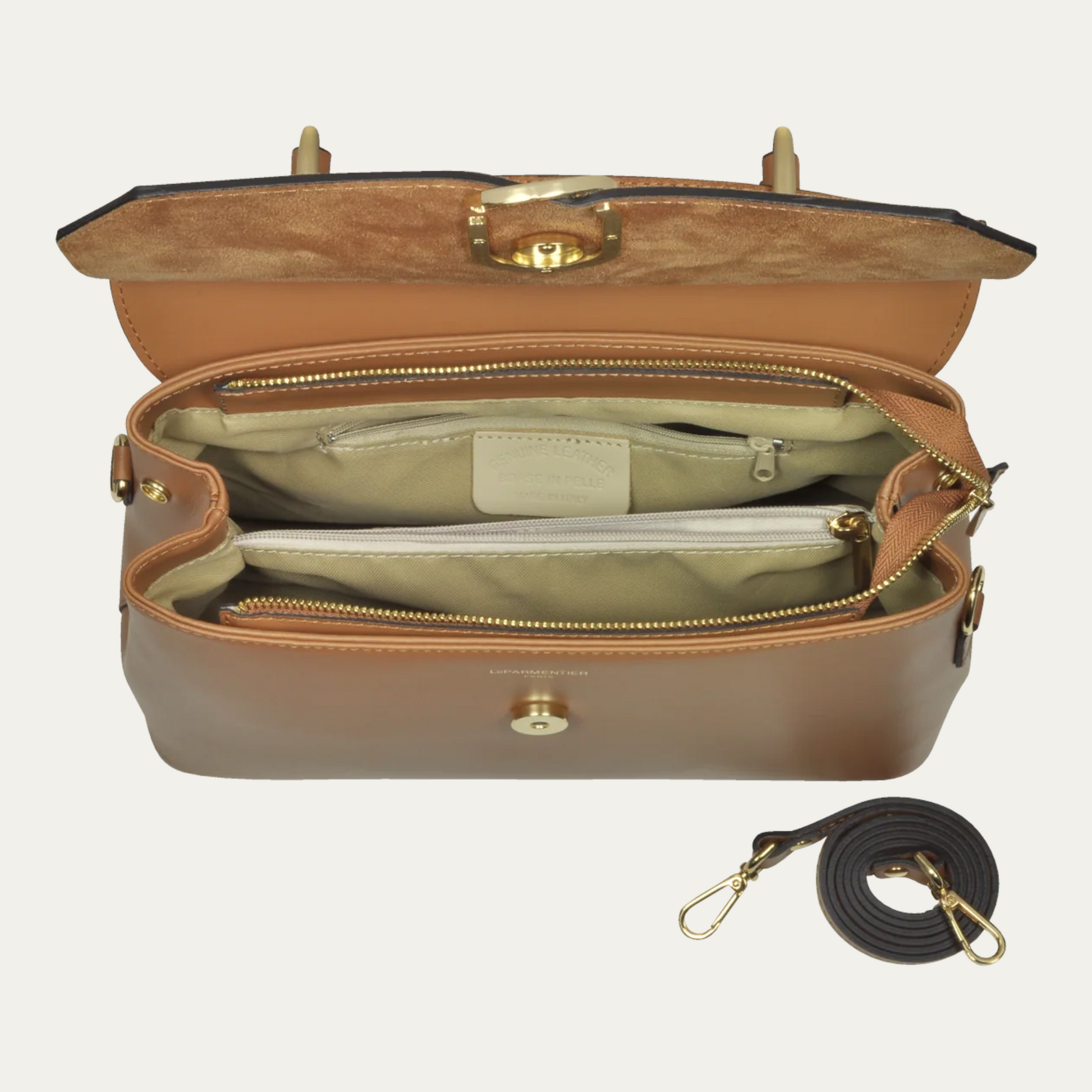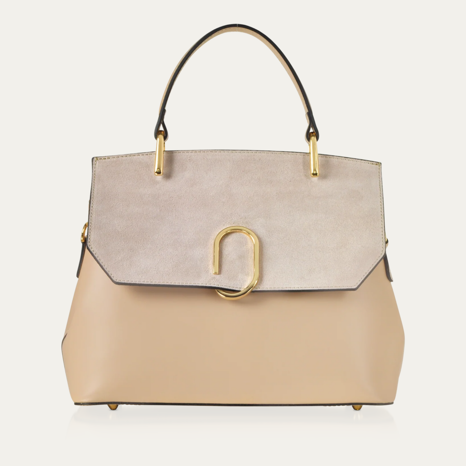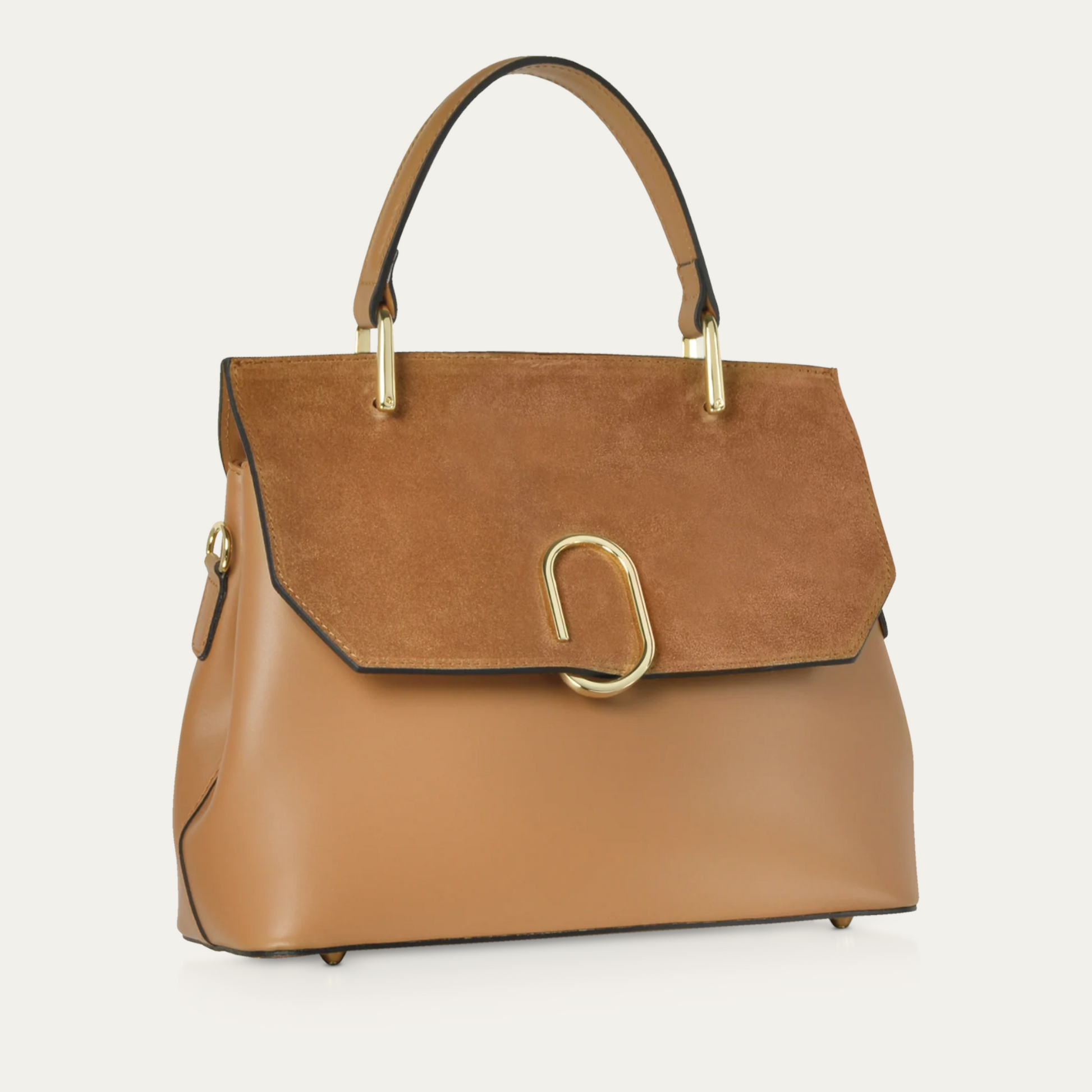Thais Satchel Bag crafted in smooth genuine Italian calf leather and velvety suede, has a classic structured silhouette with a contemporary design that keeps you discreetly organized day to night. Featuring flap top magnetic snap closure with bold hardware detail, single top handle, zip top and open pocket under flap, two compartments with center zip divider pocket, walled zip pocket, detachable shoulder strap, tonal protective feet, and gold tone hardware detail.