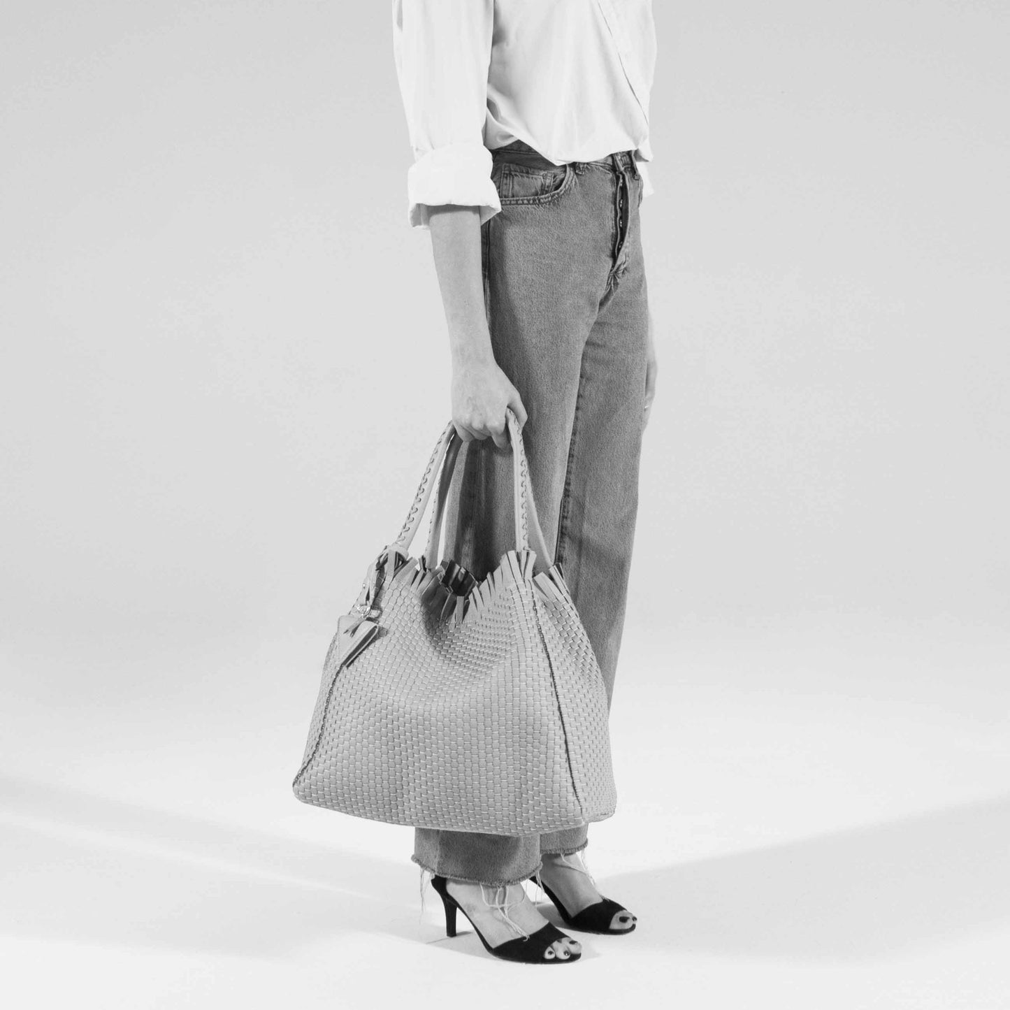 Iconic. It is the most desired bag. Elegant or casual, it depends on your mood. And once you fill it with everyday essentials, you never change it again.  It's an handmade in Italy using a 18th-century wooden looms. Sack design, with two handles characterized by “infilatura” (threading) and upper edge with leather fringes. It has been thought to be worn on the arm, but the height of the handle allows it to be worn on the shoulder as well.  It is available in two different sizes: this is the larger version.