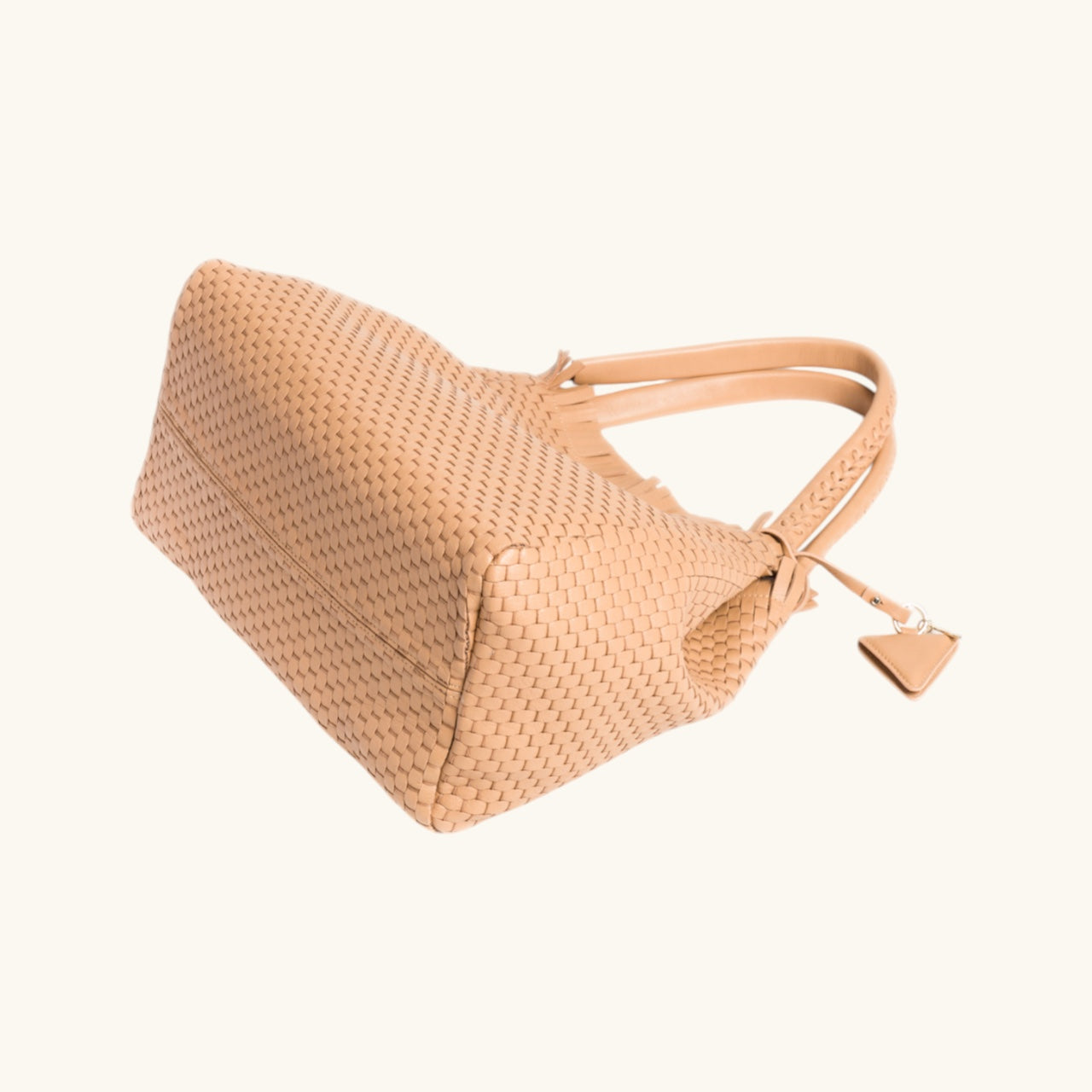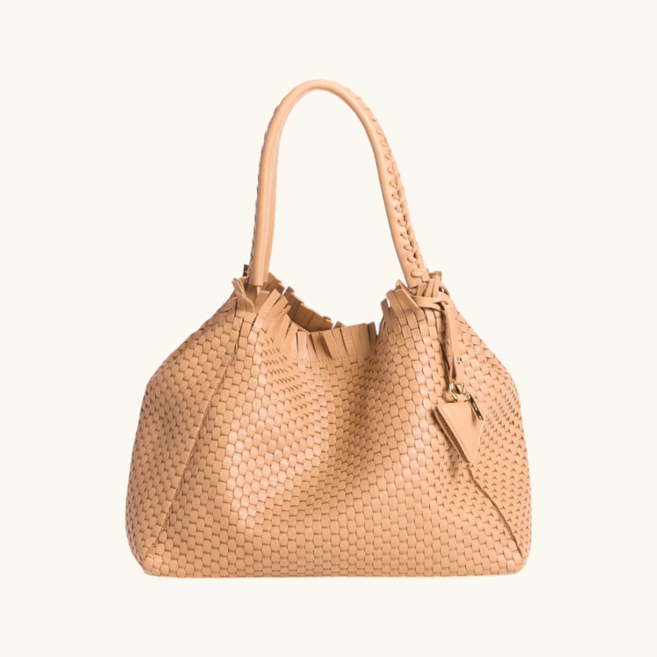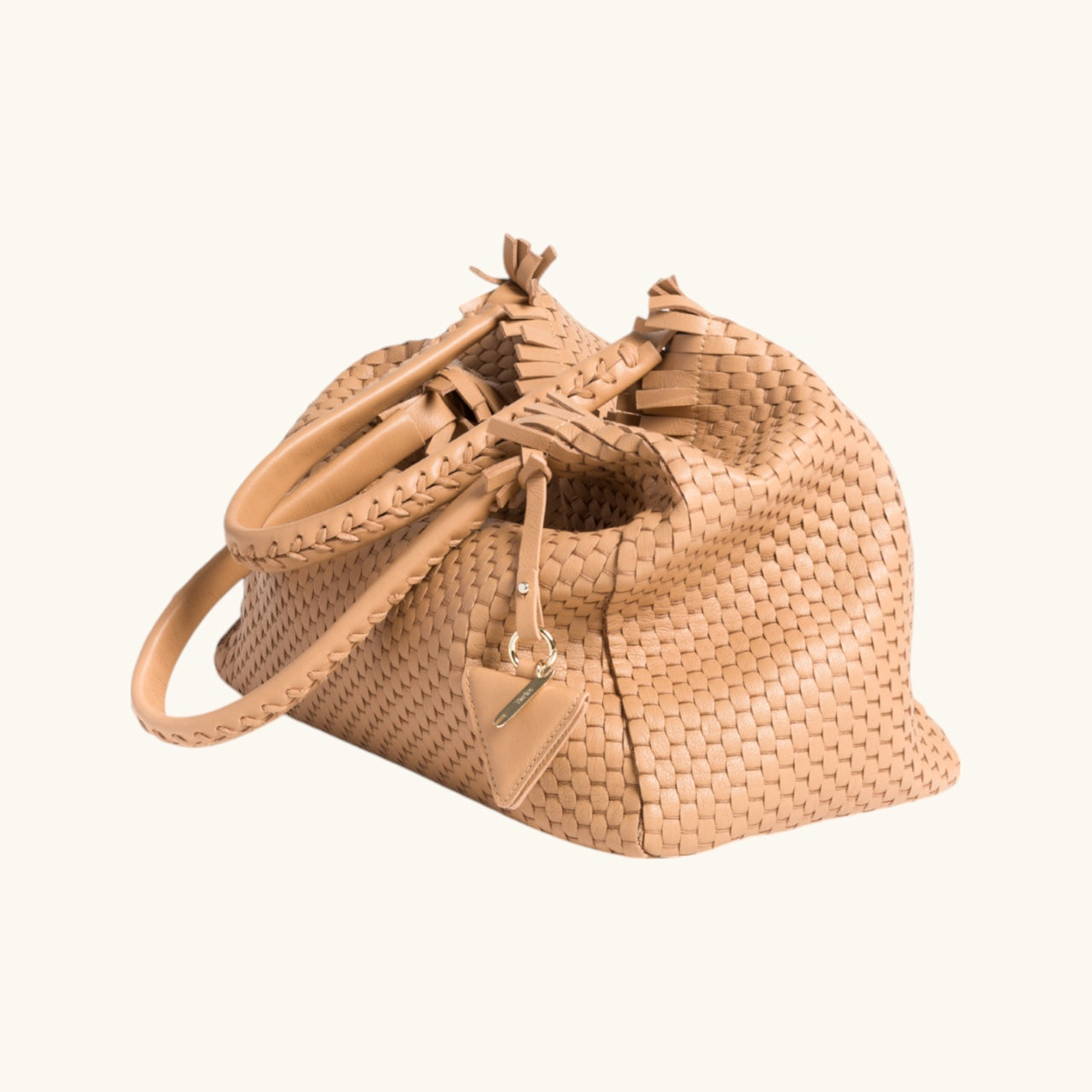 Iconic. It is the most desired bag. Elegant or casual, it depends on your mood. And once you fill it with everyday essentials, you never change it again.  It's an handmade in Italy using a 18th-century wooden looms. Sack design, with two handles characterized by “infilatura” (threading) and upper edge with leather fringes. It has been thought to be worn on the arm, but the height of the handle allows it to be worn on the shoulder as well.  It is available in two different sizes: this is the larger version.