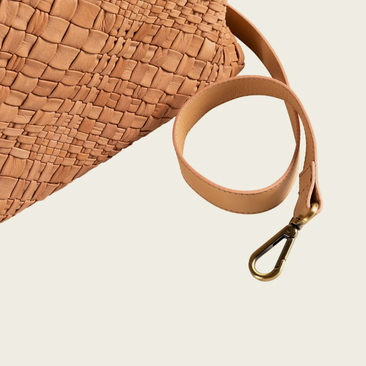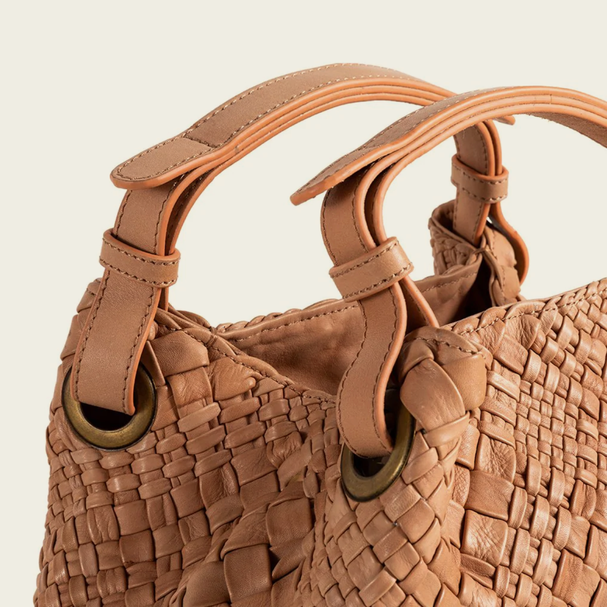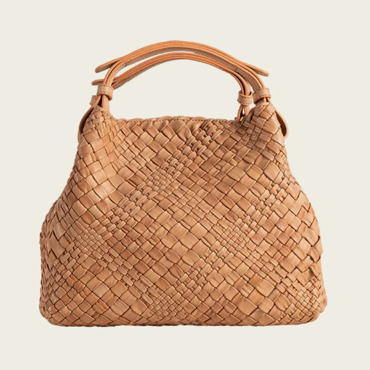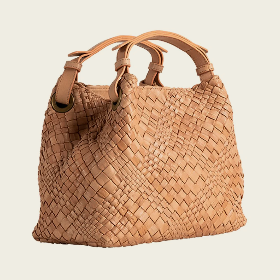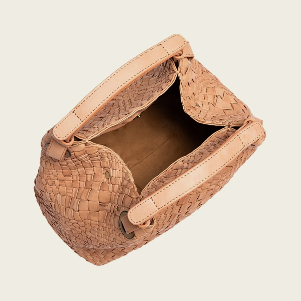 Esmeralda is a woven bag crafted by Plinio Visonà in Vicenza. Made of calfskin leather with the "white chrome" treatment, the bag is woven on white leather then dyed and washed. This gives Esmeralda a natural, yet luxurious look. With a narrow opening and magnetic closure at the top, your belongings will remain secure throughout the day.