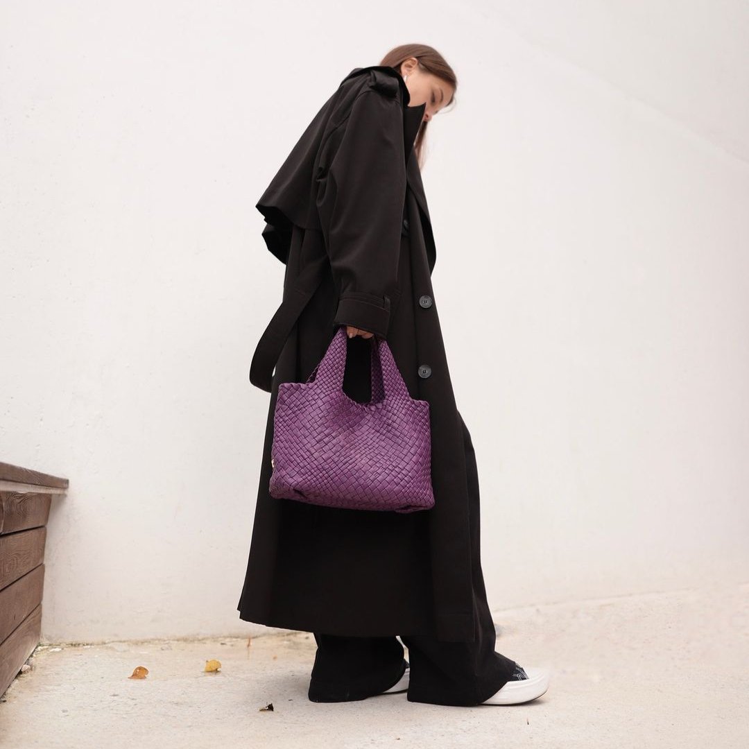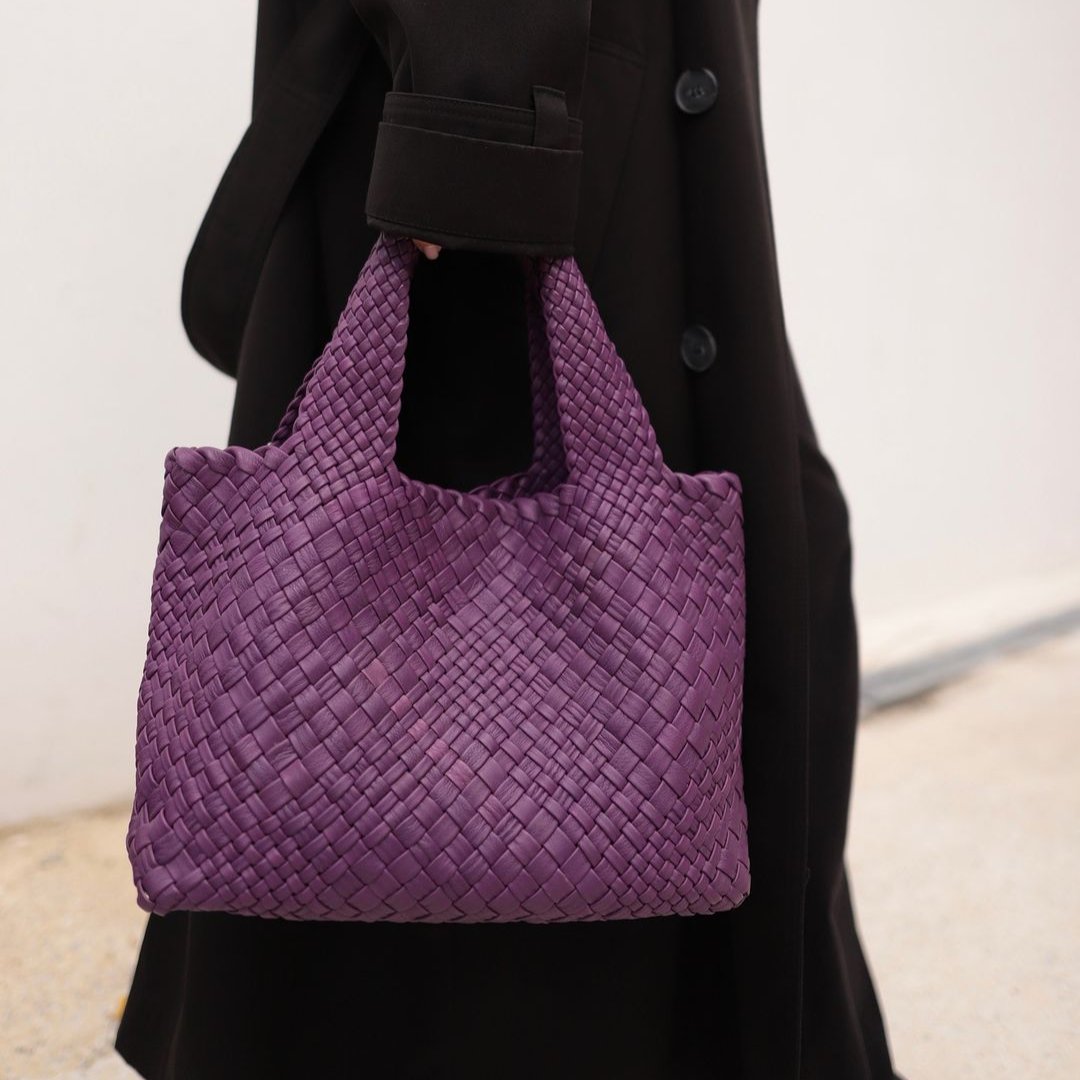 This leather woven tote bag is just the right size for daily essentials, offering structure without feeling bulky. Strips of fine Italian leather are handwoven into an optical, geometric pattern using the intrecciato method, a meticulous process that requires no stitching.