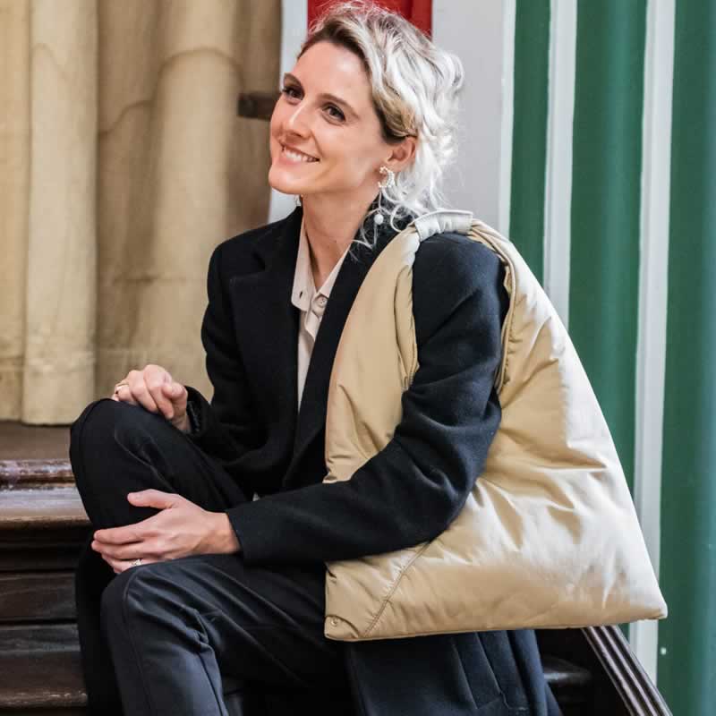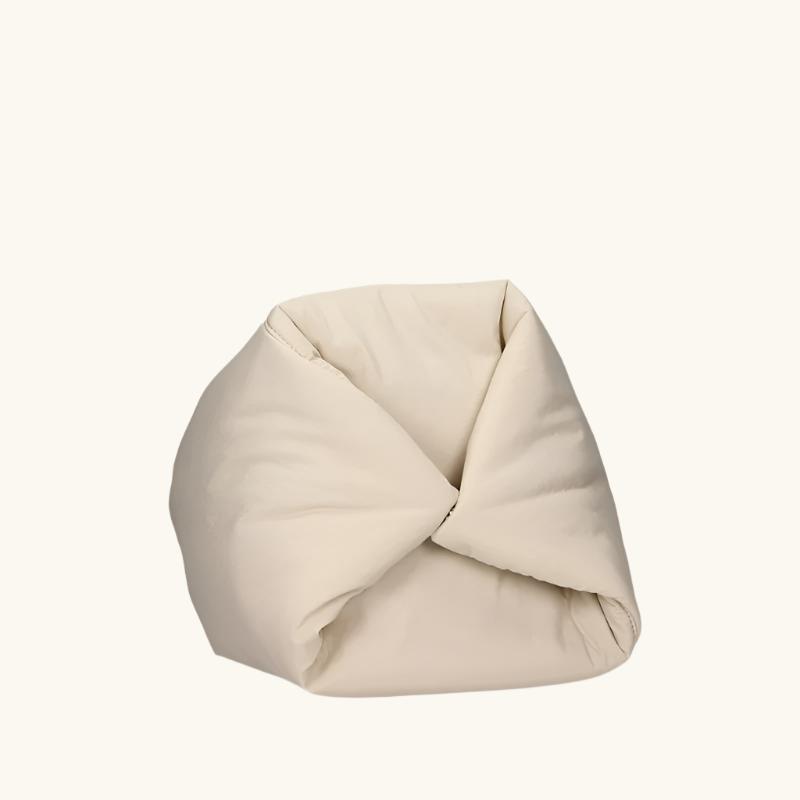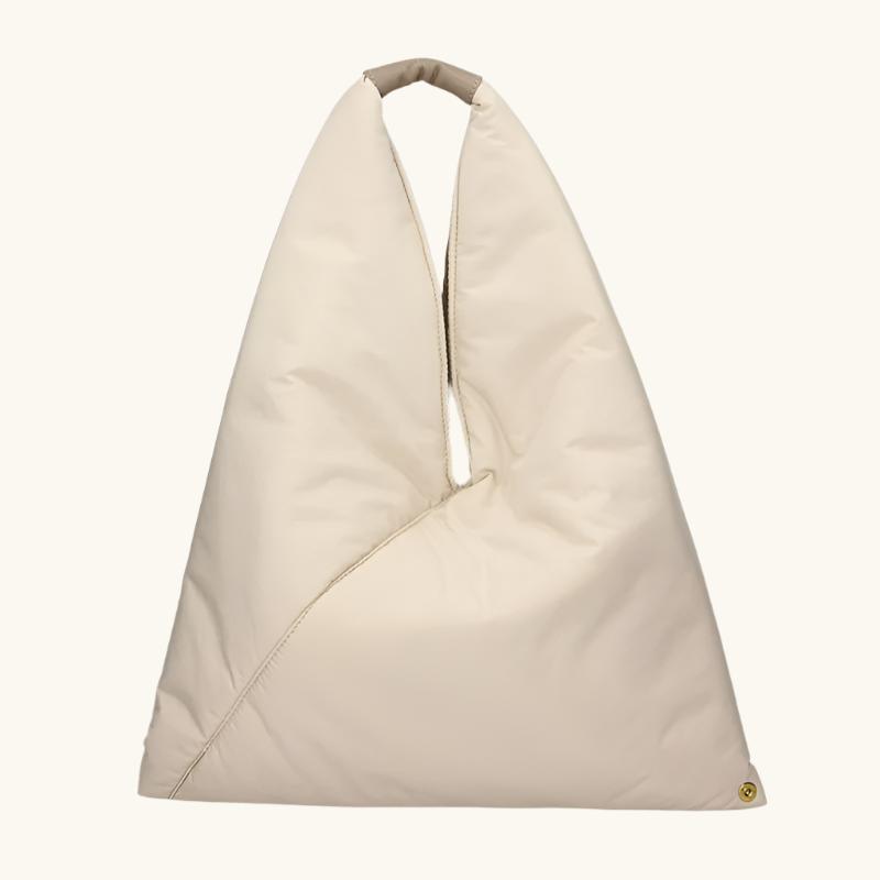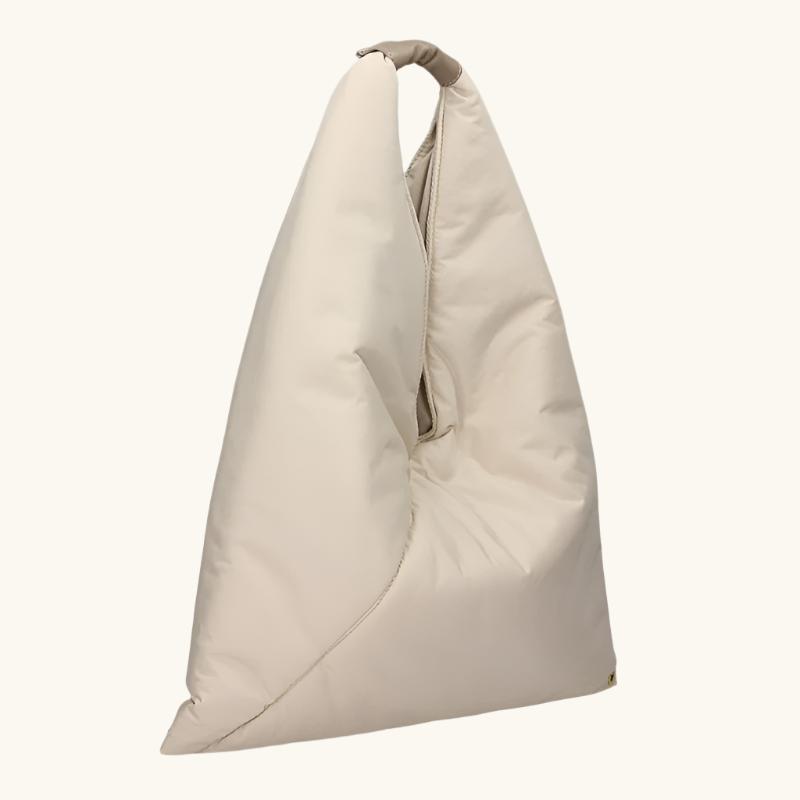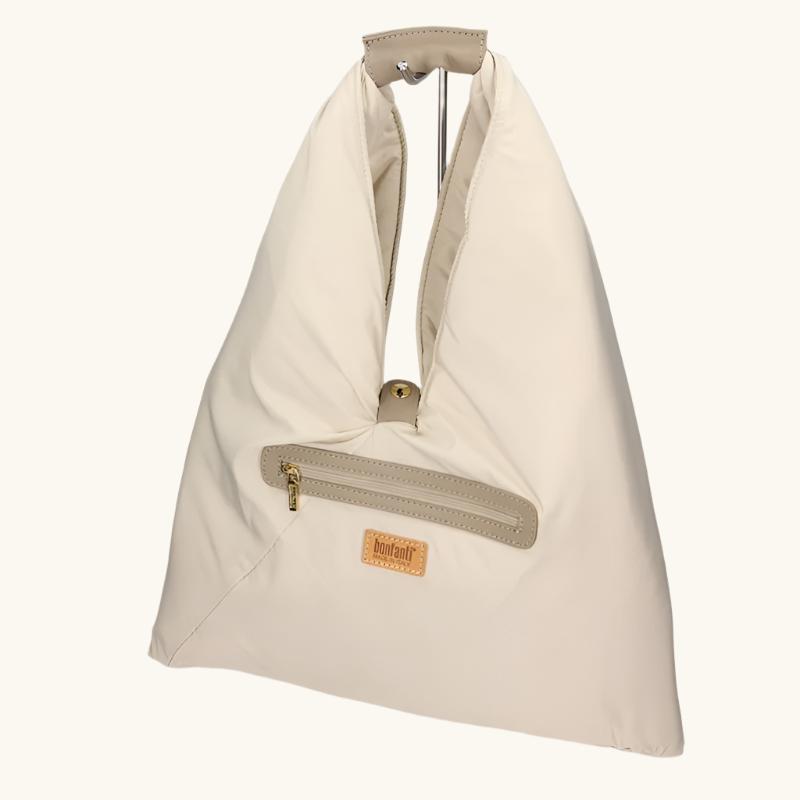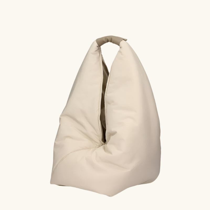 Flared shoulder bag developed in a soft padded satin touch fabrics. Tone sur tone suede and nappa calf trimmings Transformable bag at bottom with clips on the corners. Handbag closed with a top magnetic. Gold metal accessories.