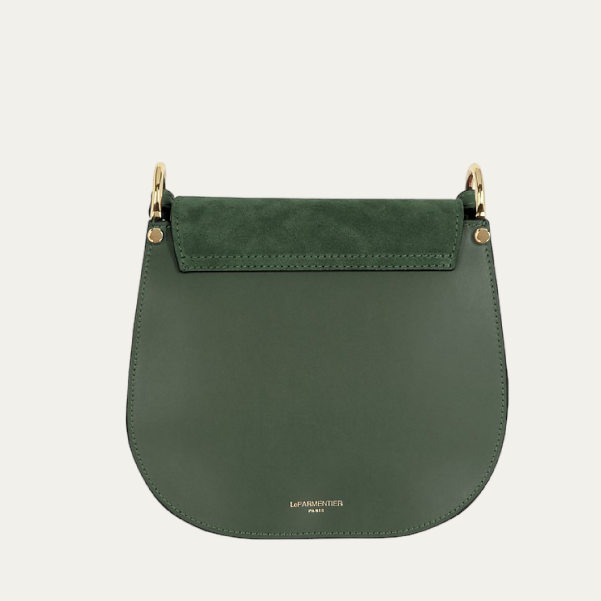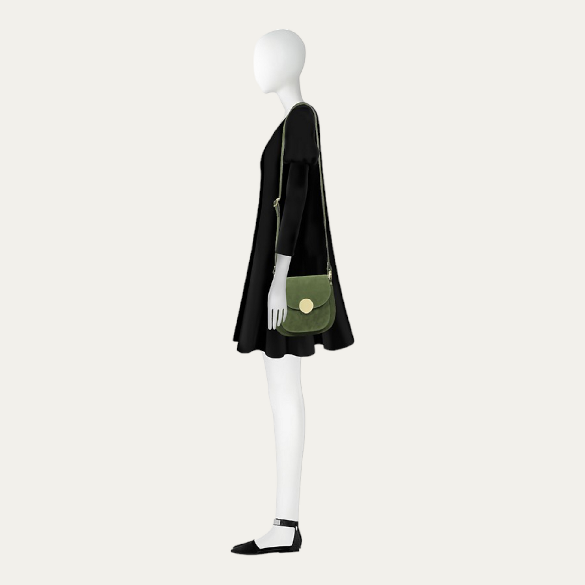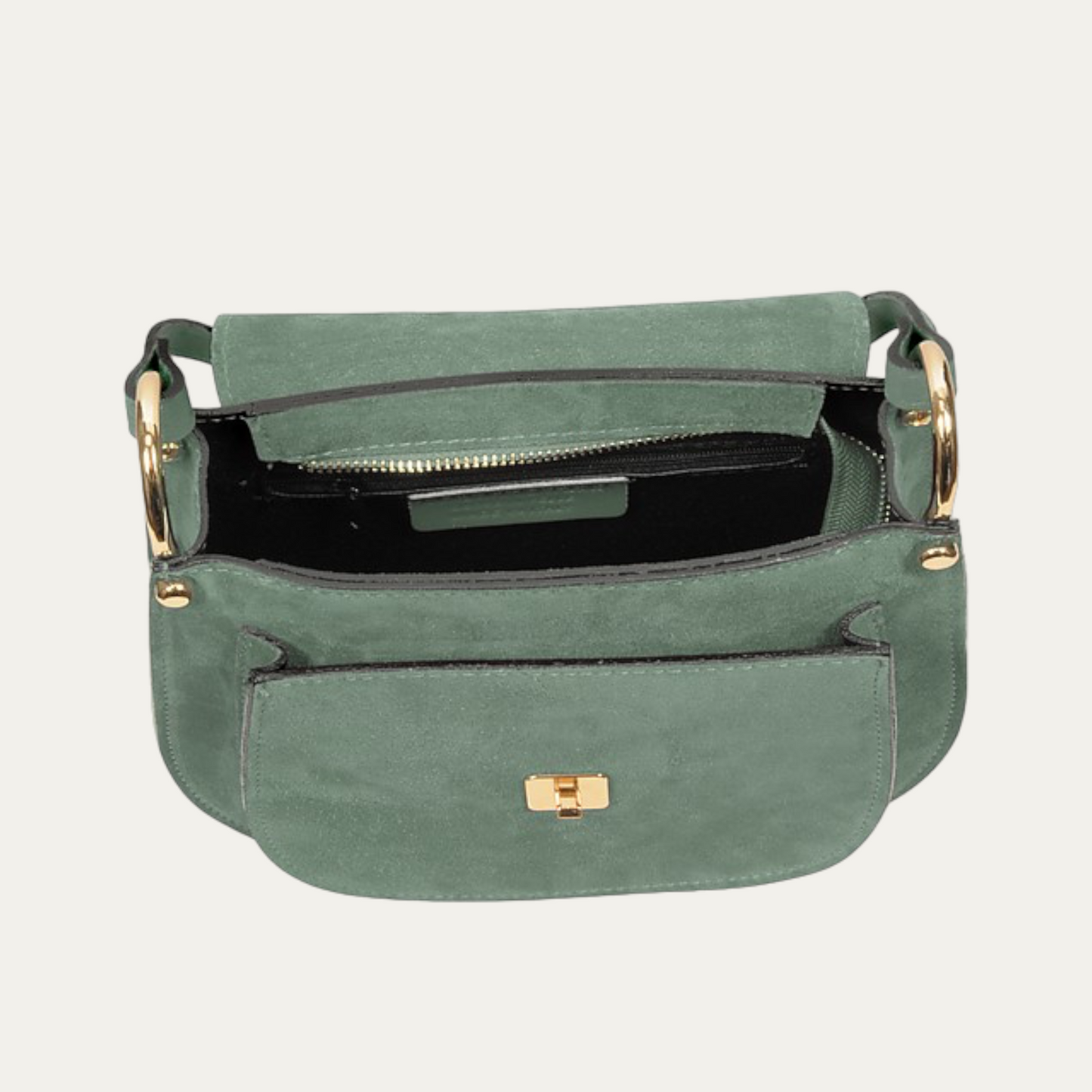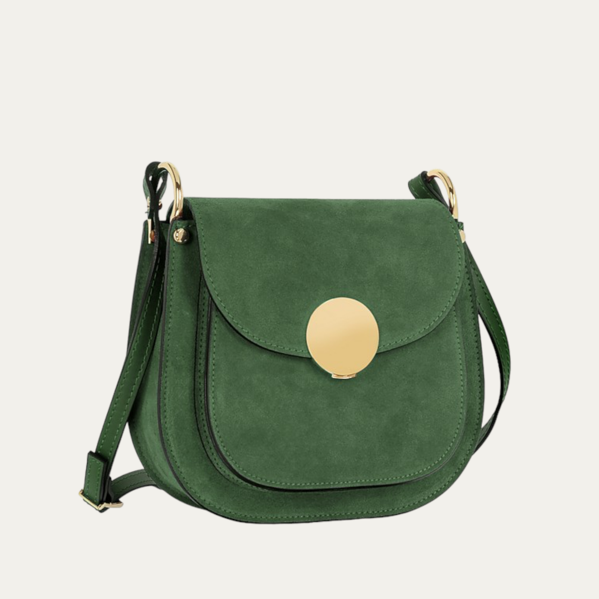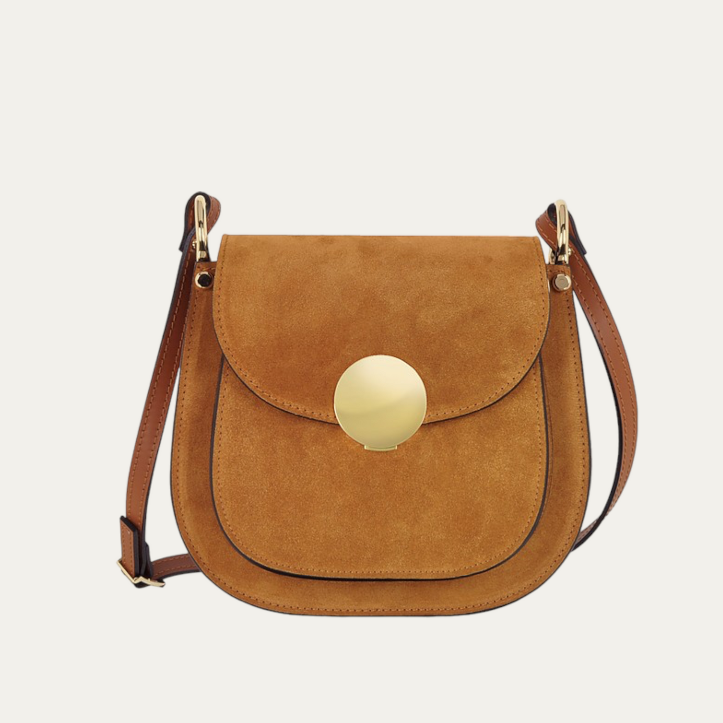 Agave Shoulder Bag crafted in smooth genuine Italian calf leather and velvety suede, pulls out all the stops with its updated take on the classic saddle silhouette that keeps you discreetly organized all the day through to casual fun nights. Featuring flap top magnetic snap closure with bold hardware detail, adjustable shoulder strap, open pocket under flap, walled zip pocket, and gold tone hardware detail. Handmade in Italy.