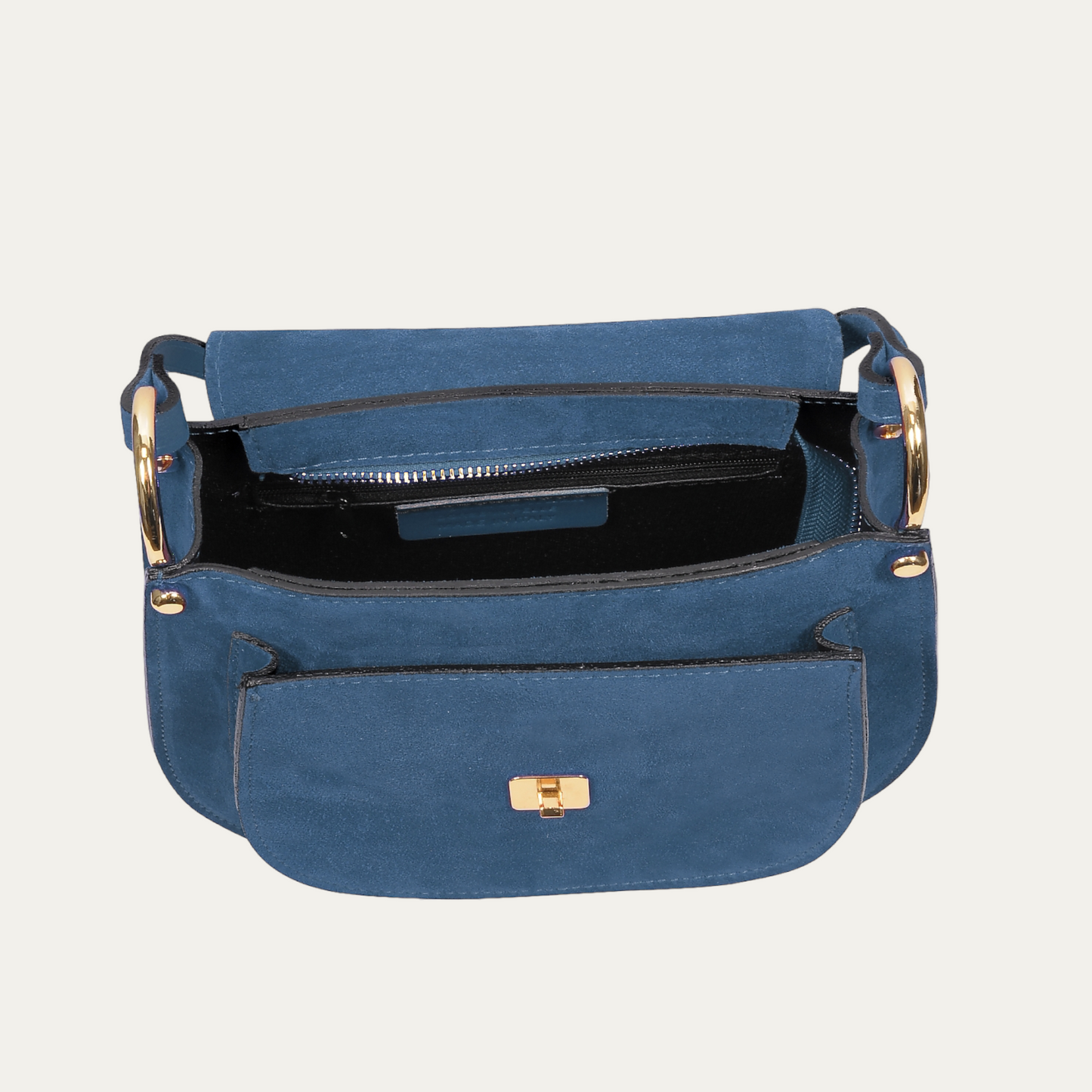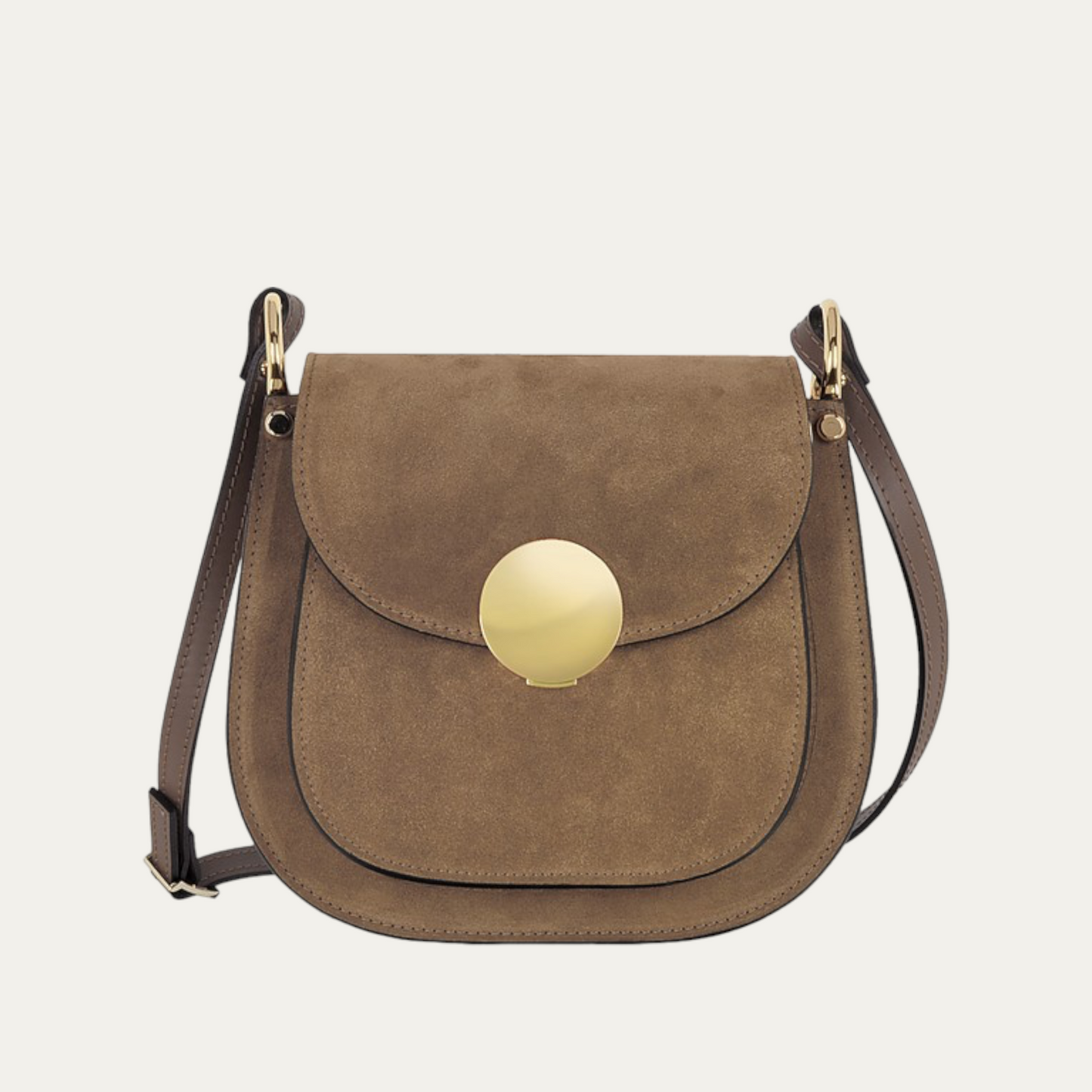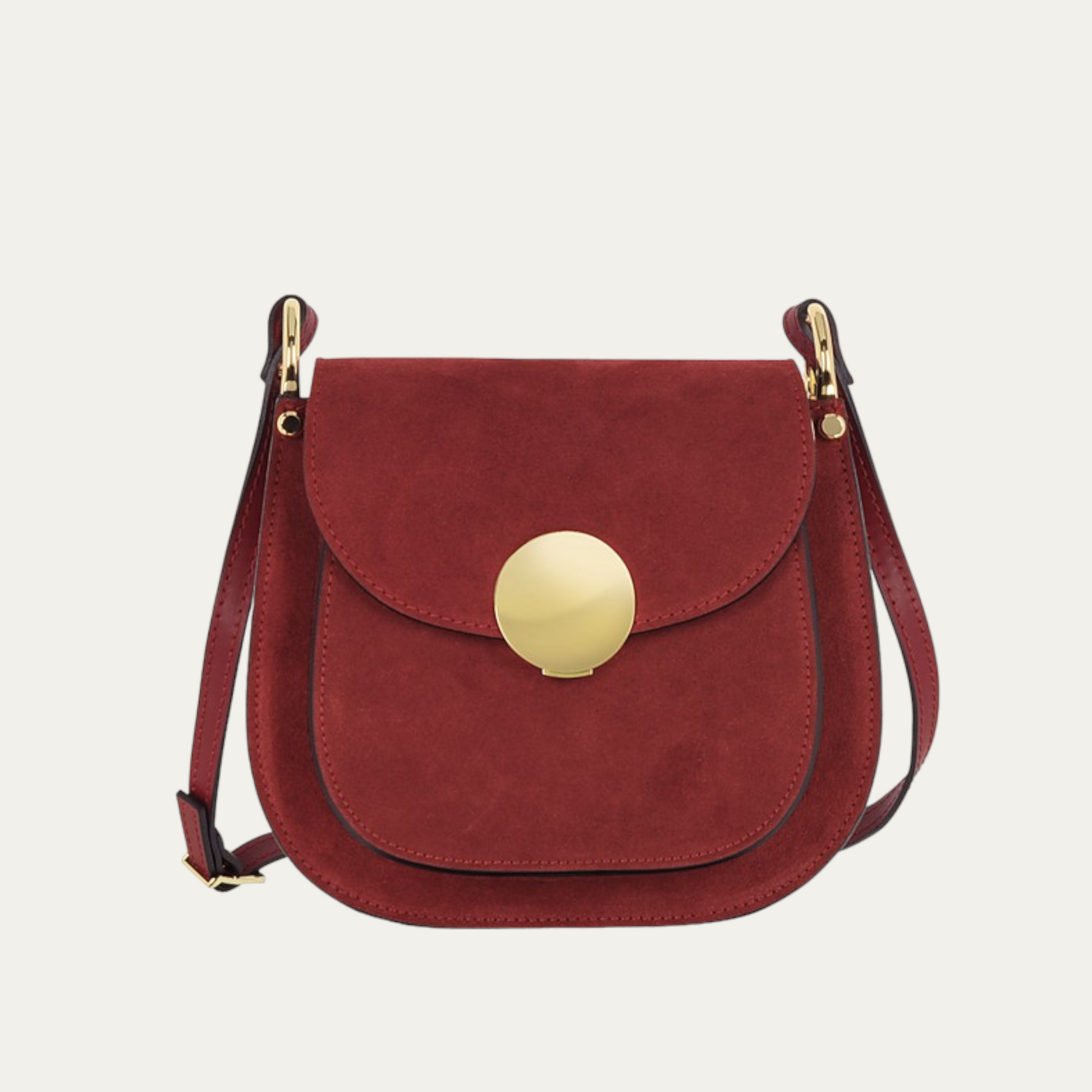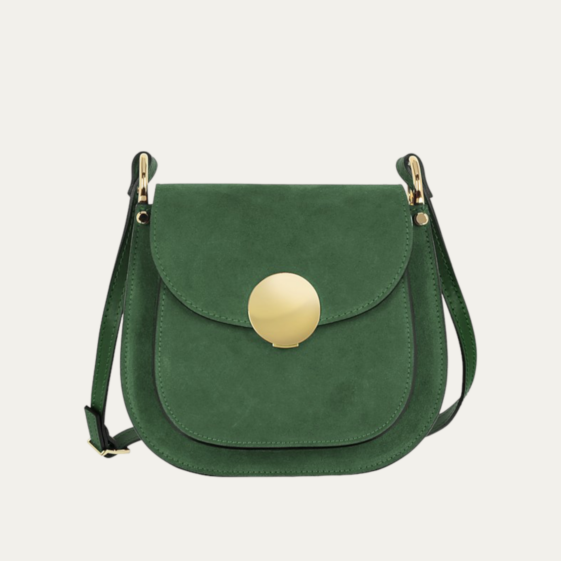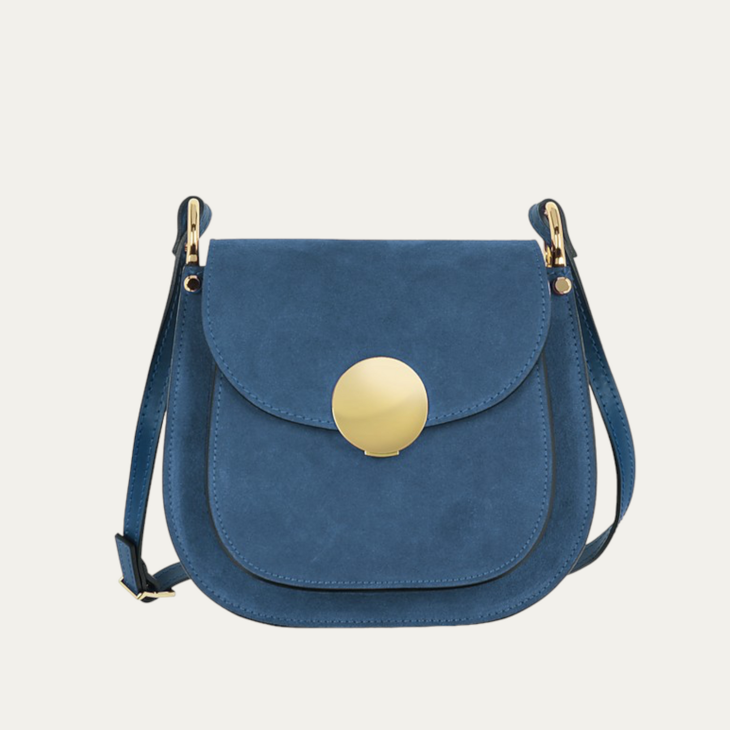Agave Shoulder Bag crafted in smooth genuine Italian calf leather and velvety suede, pulls out all the stops with its updated take on the classic saddle silhouette that keeps you discreetly organized all the day through to casual fun nights. Featuring flap top magnetic snap closure with bold hardware detail, adjustable shoulder strap, open pocket under flap, walled zip pocket, and gold tone hardware detail. Handmade in Italy.