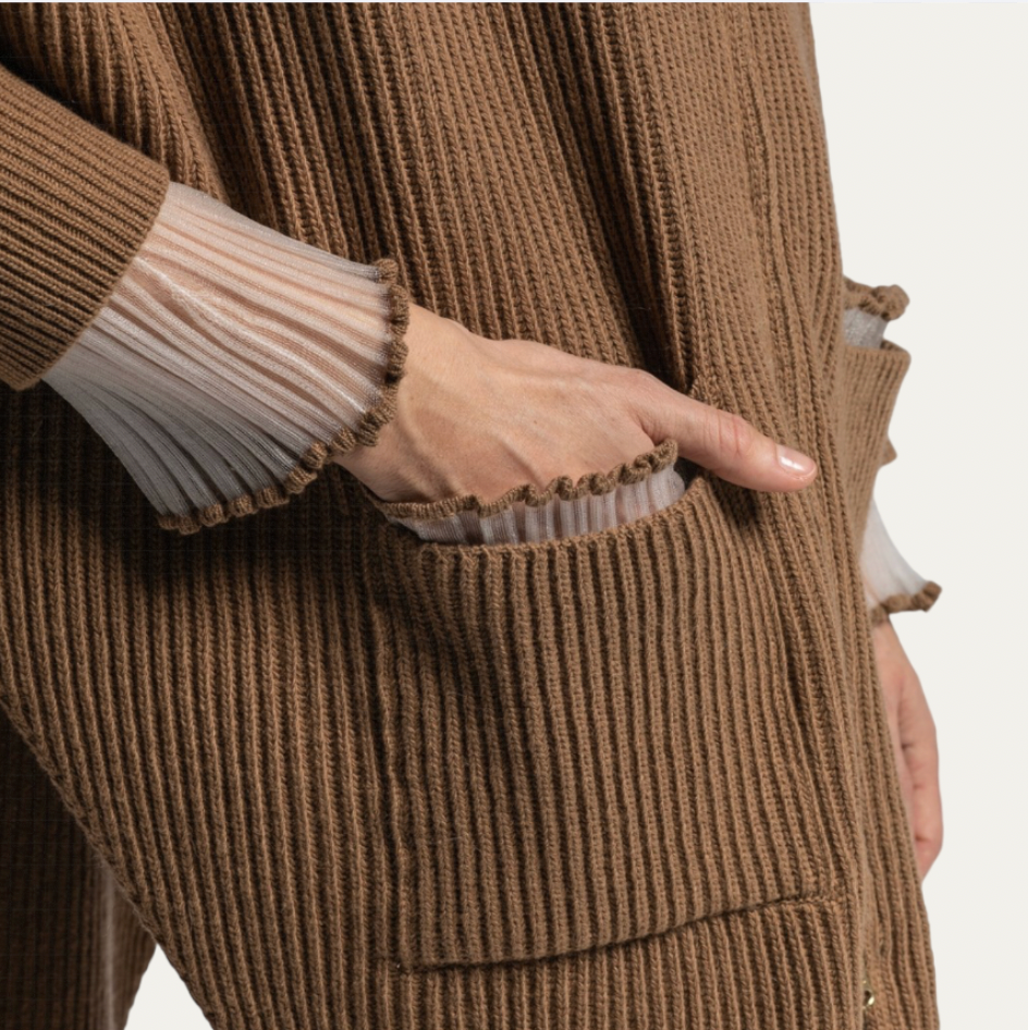 Stay stylishly warm in our luxurious knitted cape, expertly crafted in Mantua, Lombardy. With two convenient pockets and a sleek zip closure, this cape offers convenience and comfort without compromising on style.