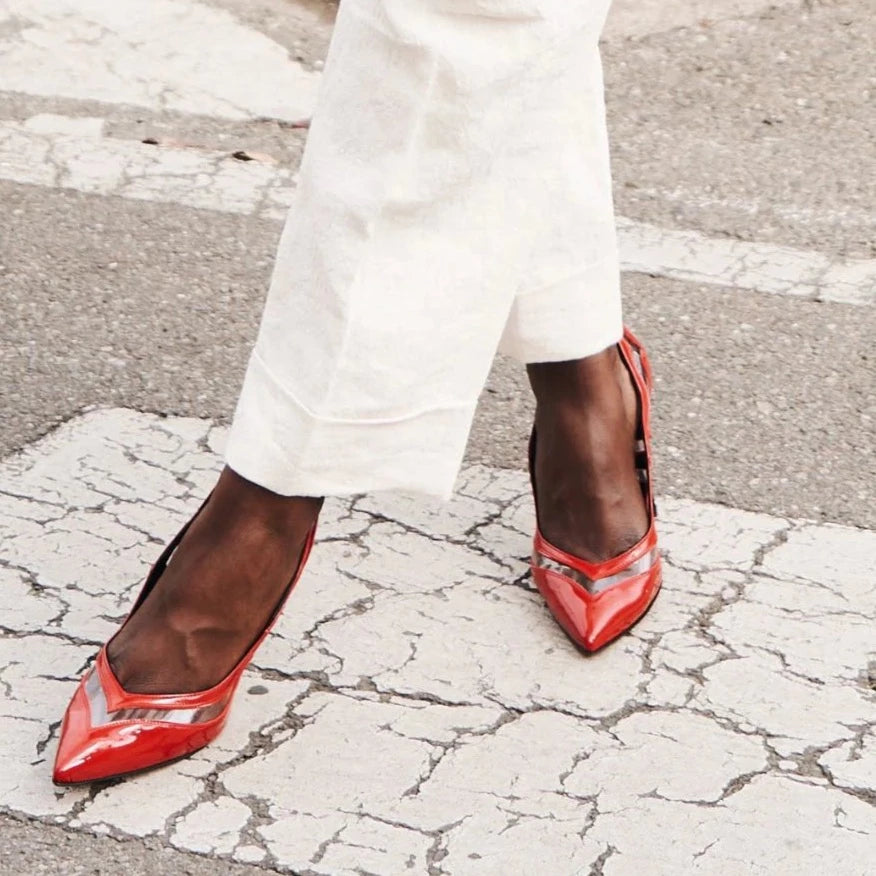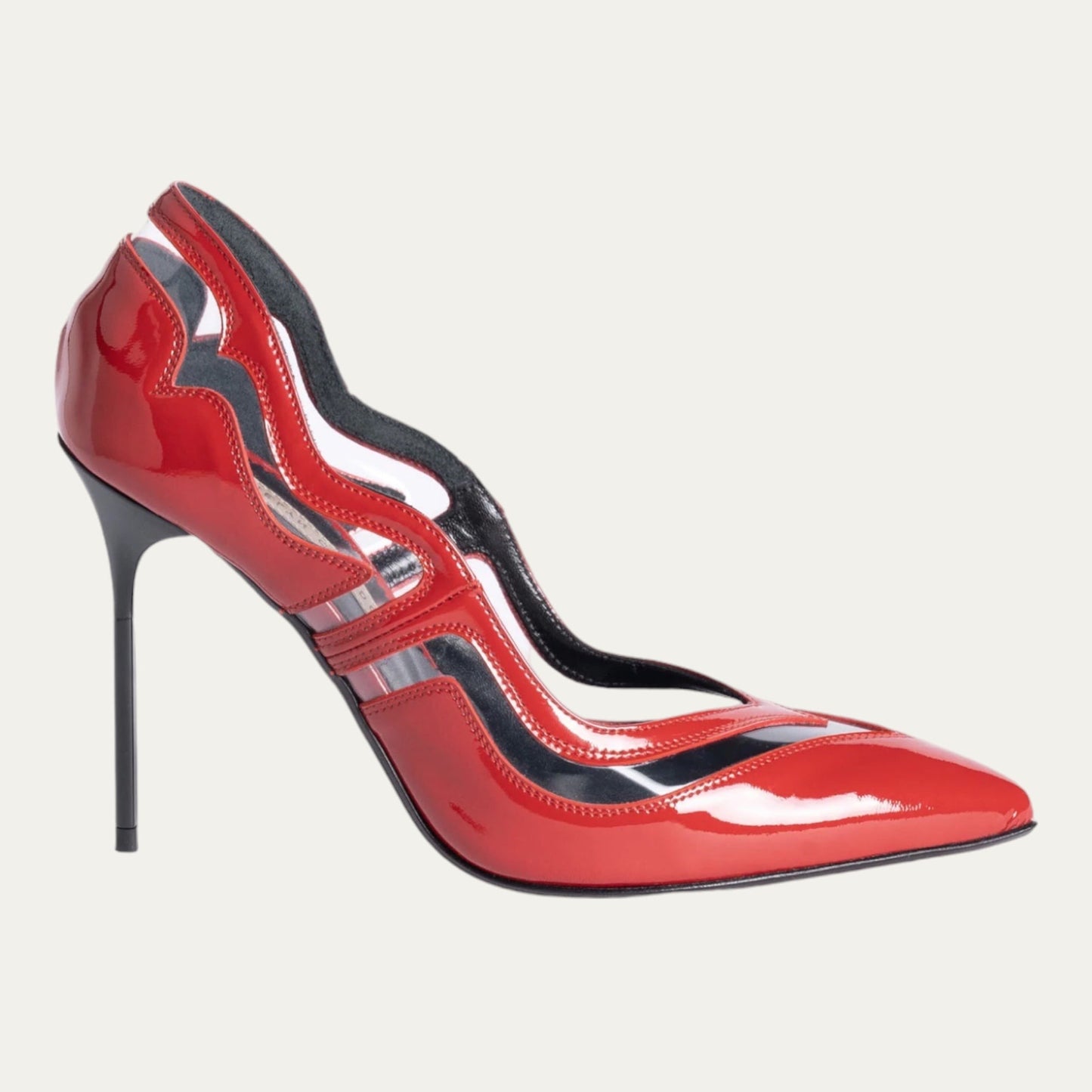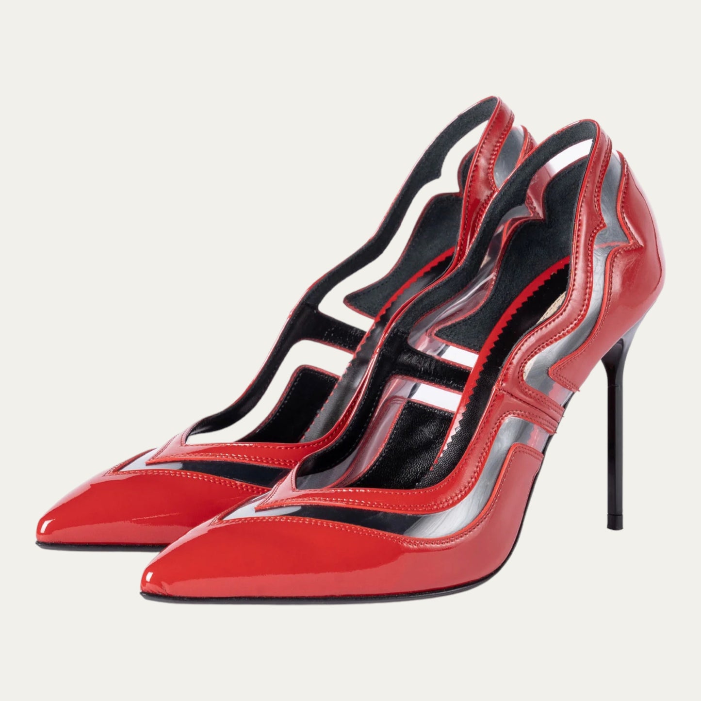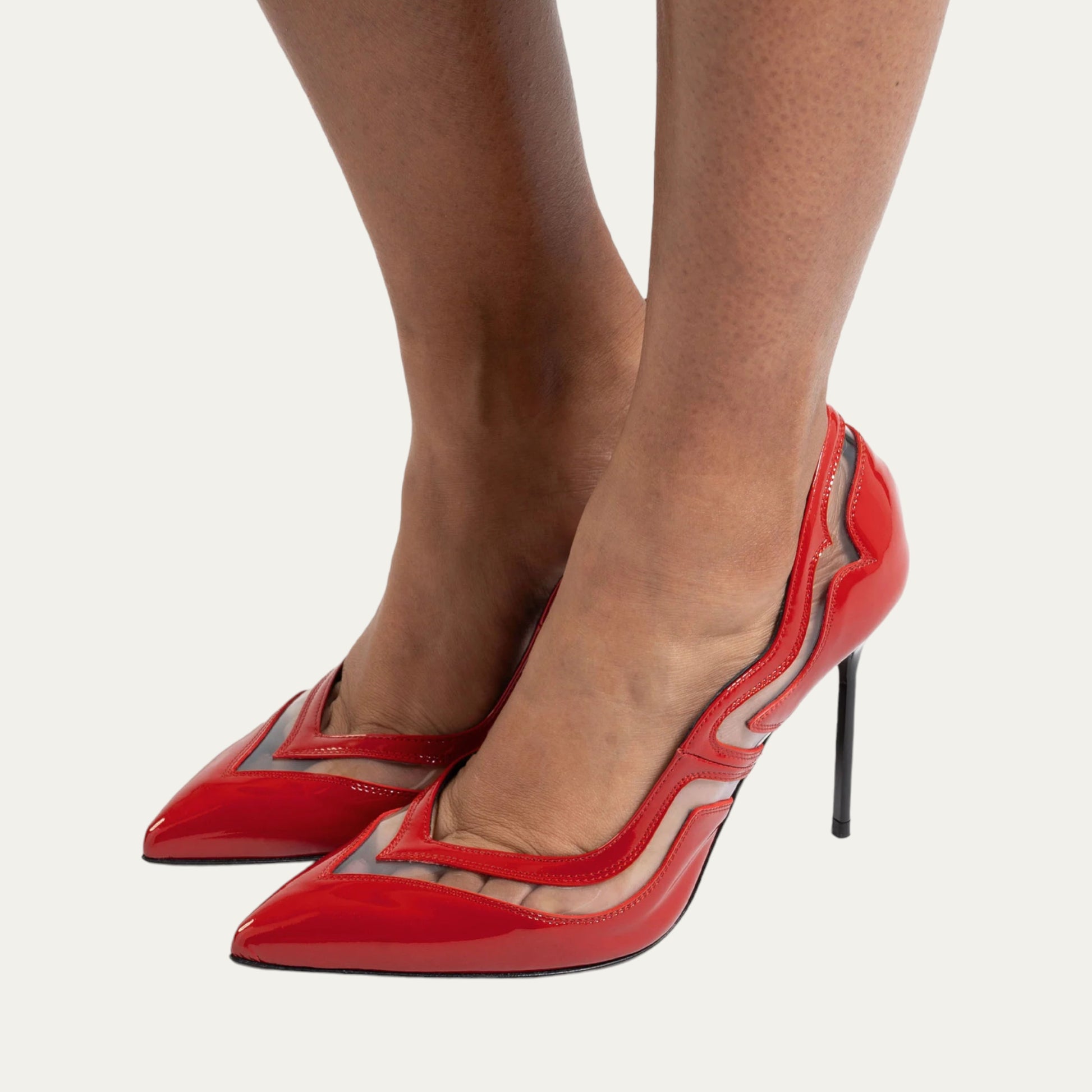 Emily women's heel shoes embody the essence of Italian craftsmanship and the inspiration of Mughal architecture in India, creating a combination of style and sophistication. The pattern of these handcrafted women's shoes reflects the elegant symmetry and delicate geometric shapes that characterize that historical period. Made with care and dedication, Emily shoes are a tribute to Italian craftsmanship, with a harmonious fusion of fine materials. The upper is worked in red patent leather and vinyl, giving the shoe a bright and eye-catching elegance. This combination of fabrics creates a unique and irresistible design.