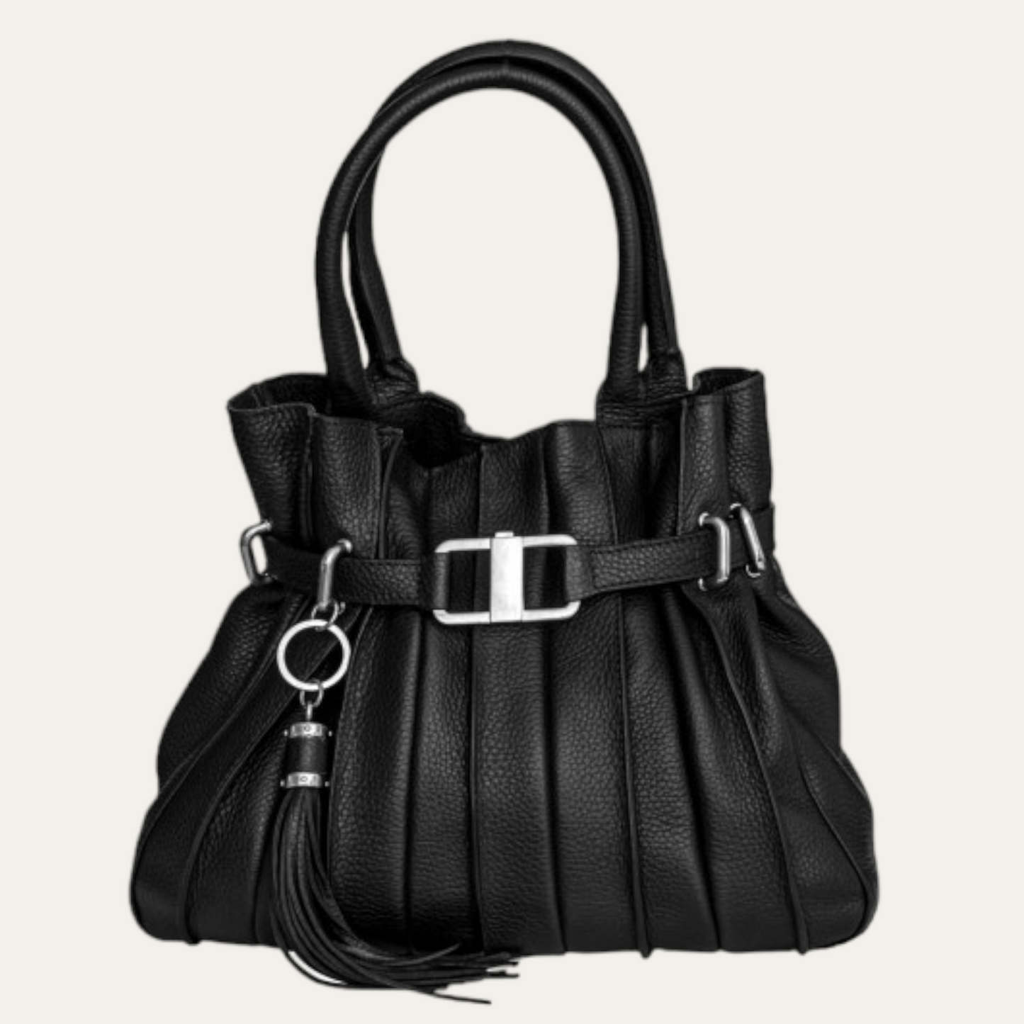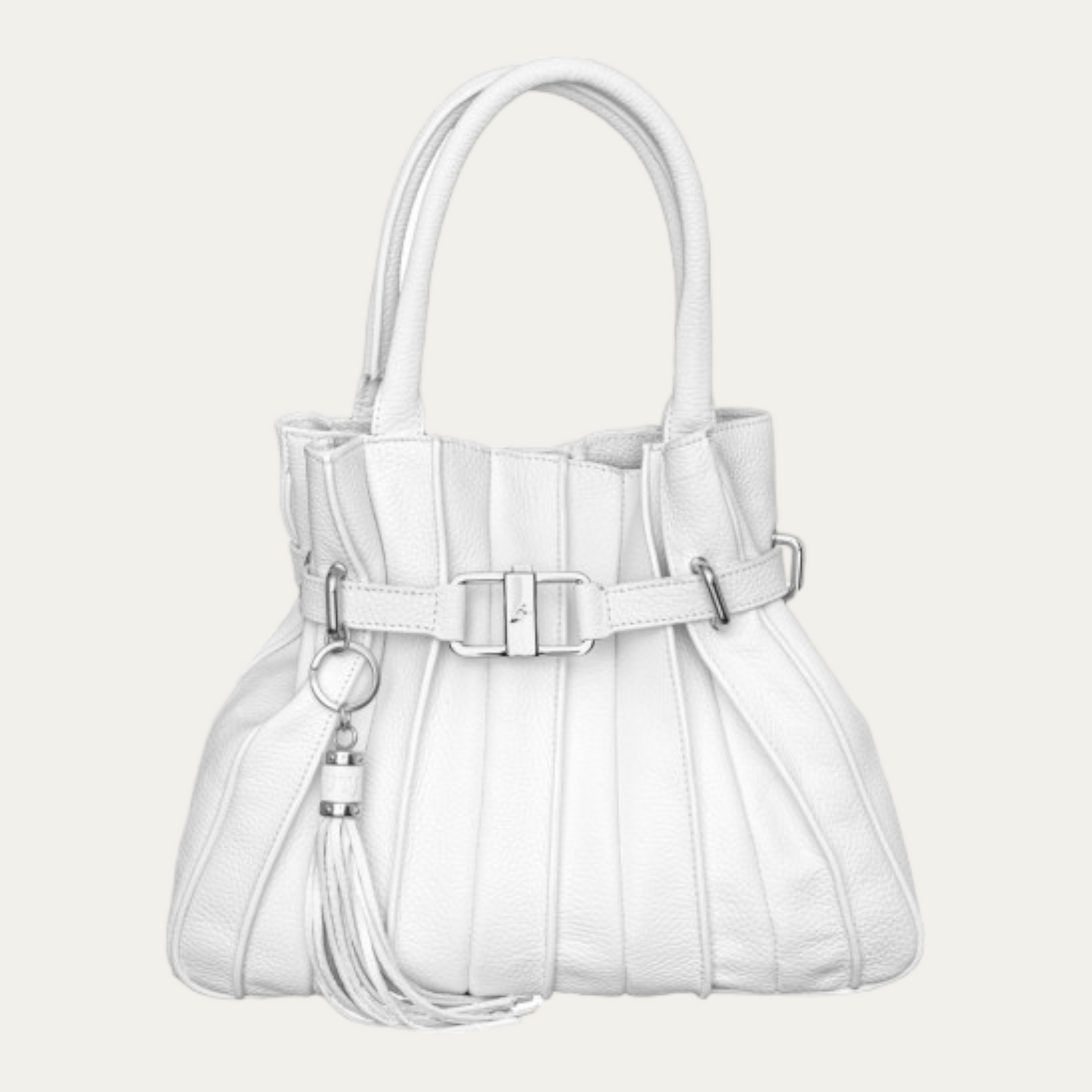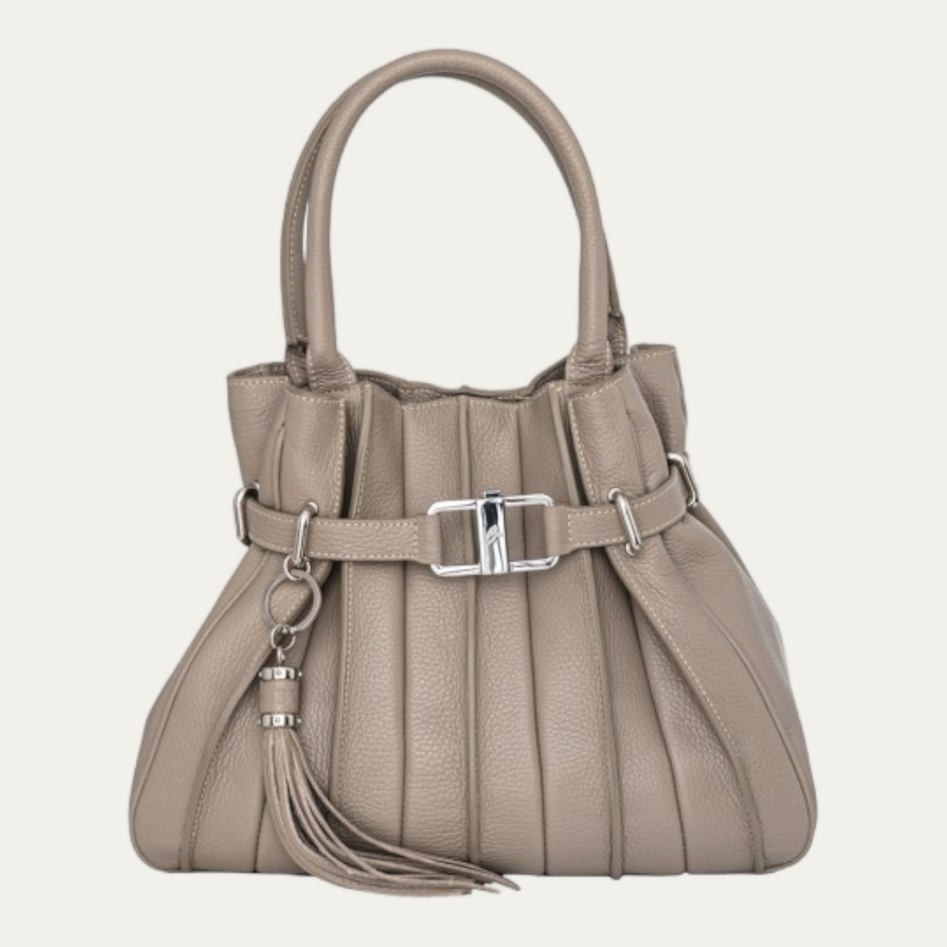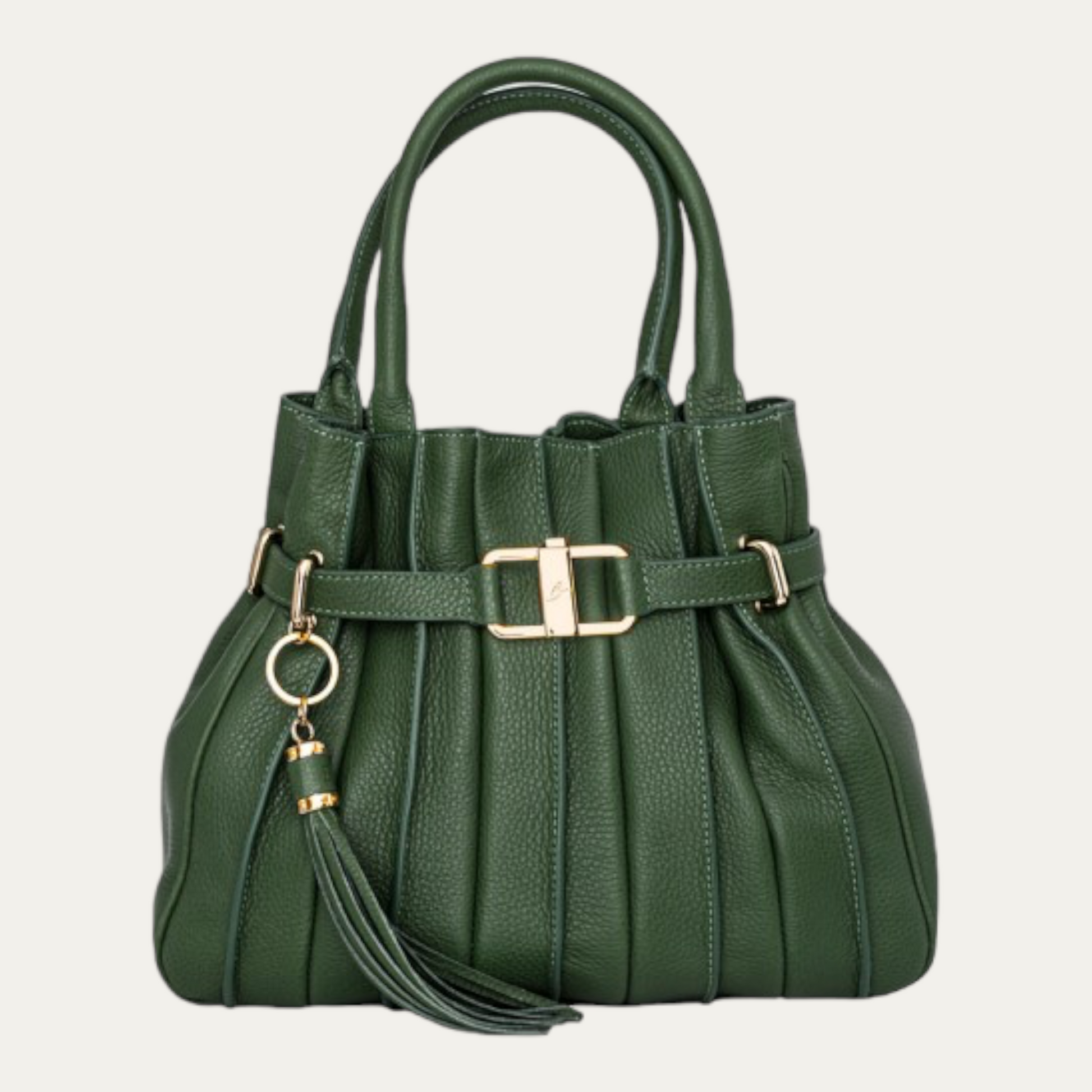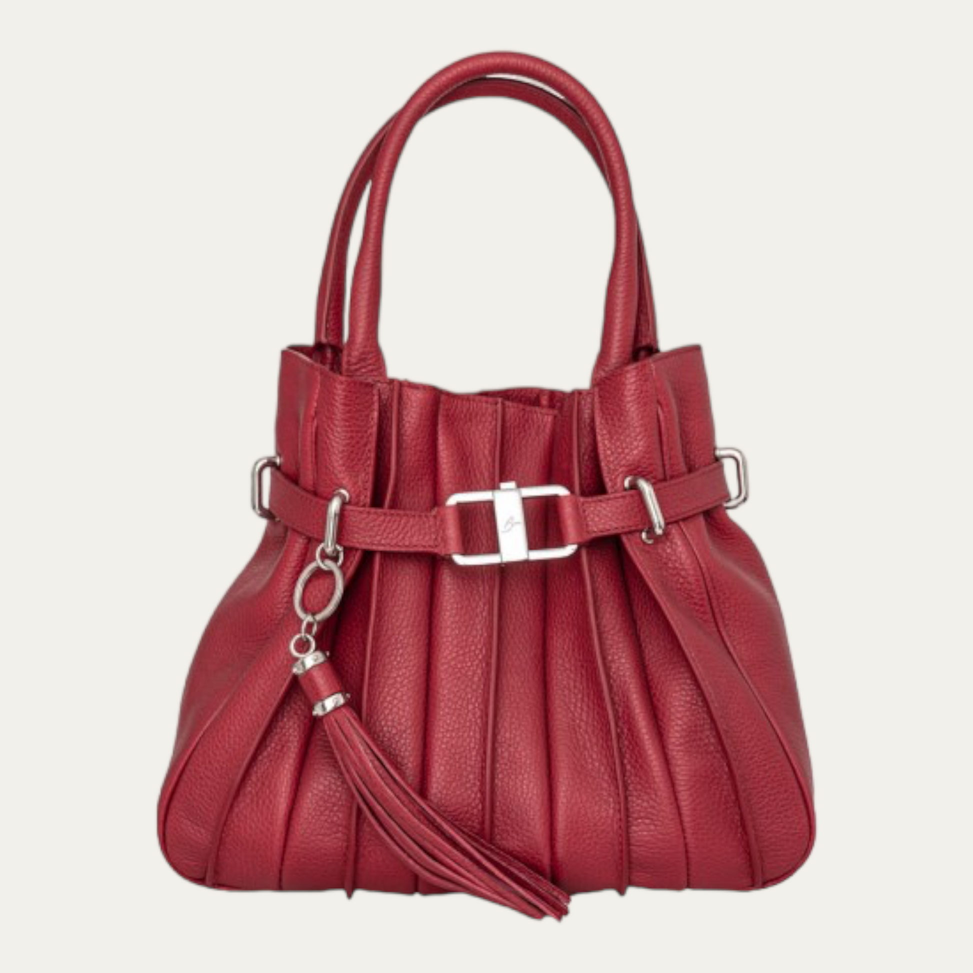 This stylish handbag is handcrafted from vegetable tanned leather with a grained print. It has a pleated design and a leather loop belt with a clasp, as well as top leather handles with a magnetic closure and a statement Buti tassel. The detachable and adjustable strap allows it to be worn cross-body. The spacious interior is plain lined with a side pocket. With a variety of gorgeous colors and textures available, this bag is a must-have accessory for every day. Plus, customizations are available upon request.