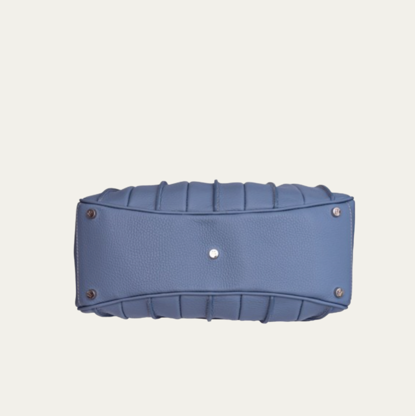 This stylish handbag is handcrafted from vegetable tanned leather with a grained print. It has a pleated design and a leather loop belt with a clasp, as well as top leather handles with a magnetic closure and a statement Buti tassel. The detachable and adjustable strap allows it to be worn cross-body. The spacious interior is plain lined with a side pocket. With a variety of gorgeous colors and textures available, this bag is a must-have accessory for every day. Plus, customizations are available upon request.