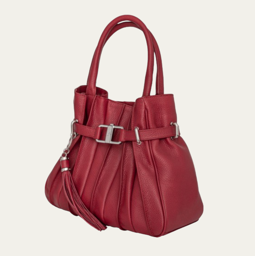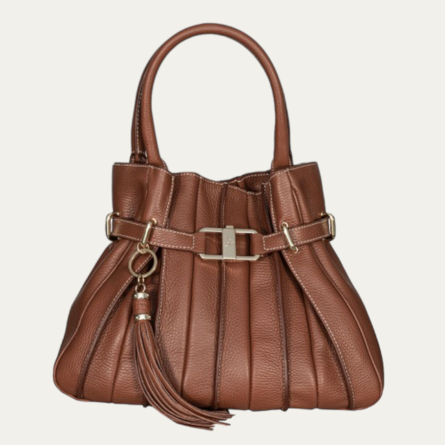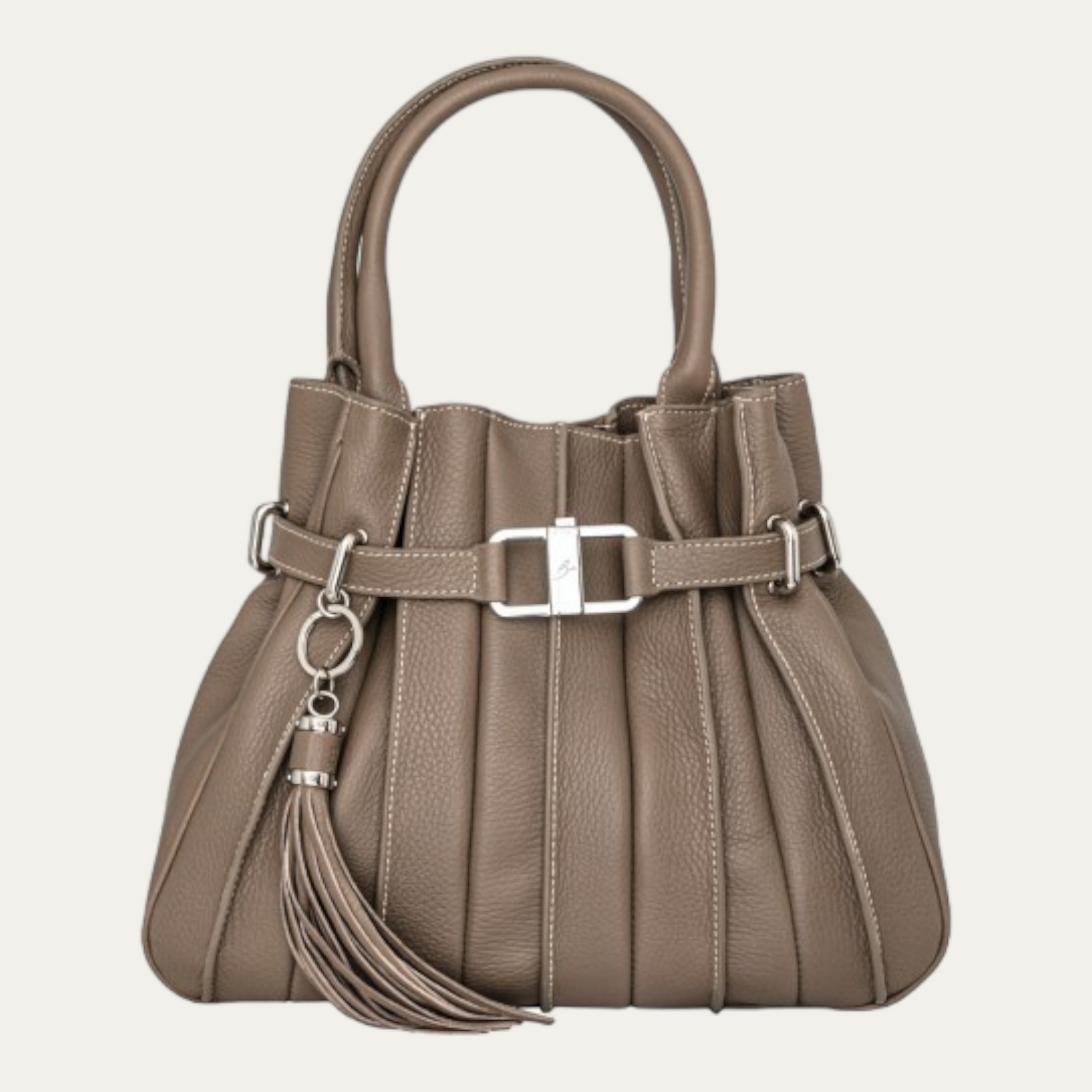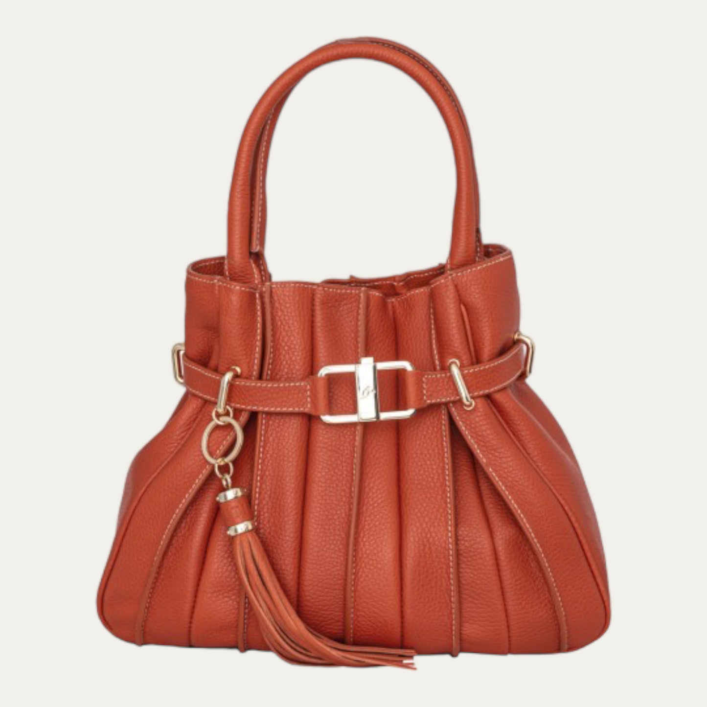 This stylish handbag is handcrafted from vegetable tanned leather with a grained print. It has a pleated design and a leather loop belt with a clasp, as well as top leather handles with a magnetic closure and a statement Buti tassel. The detachable and adjustable strap allows it to be worn cross-body. The spacious interior is plain lined with a side pocket. With a variety of gorgeous colors and textures available, this bag is a must-have accessory for every day. Plus, customizations are available upon request.