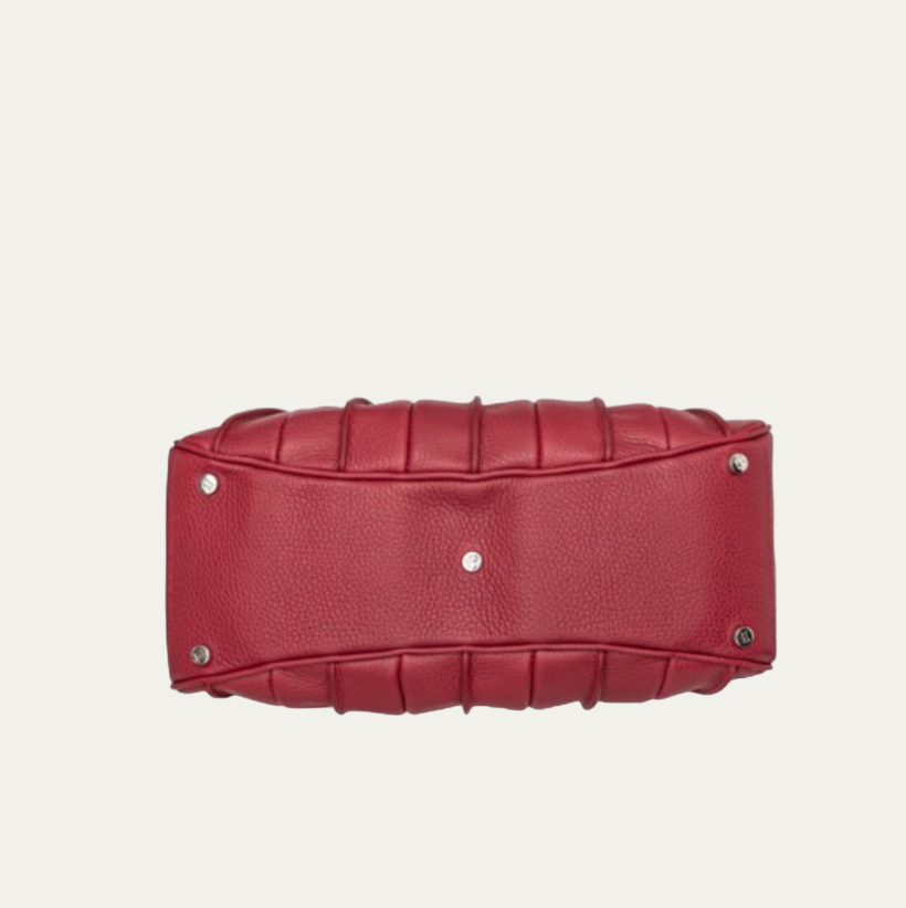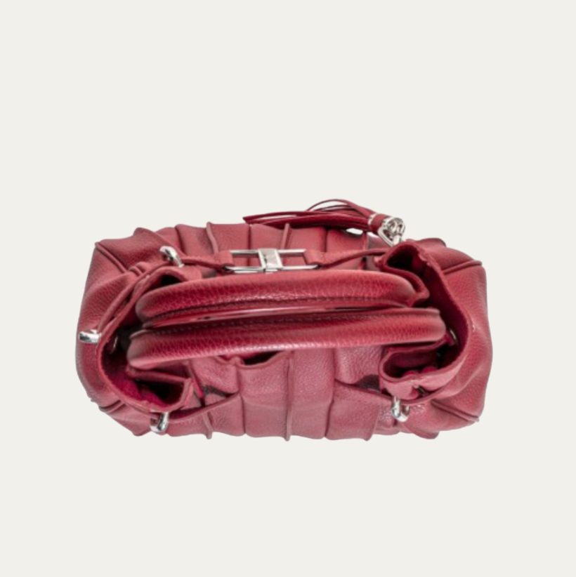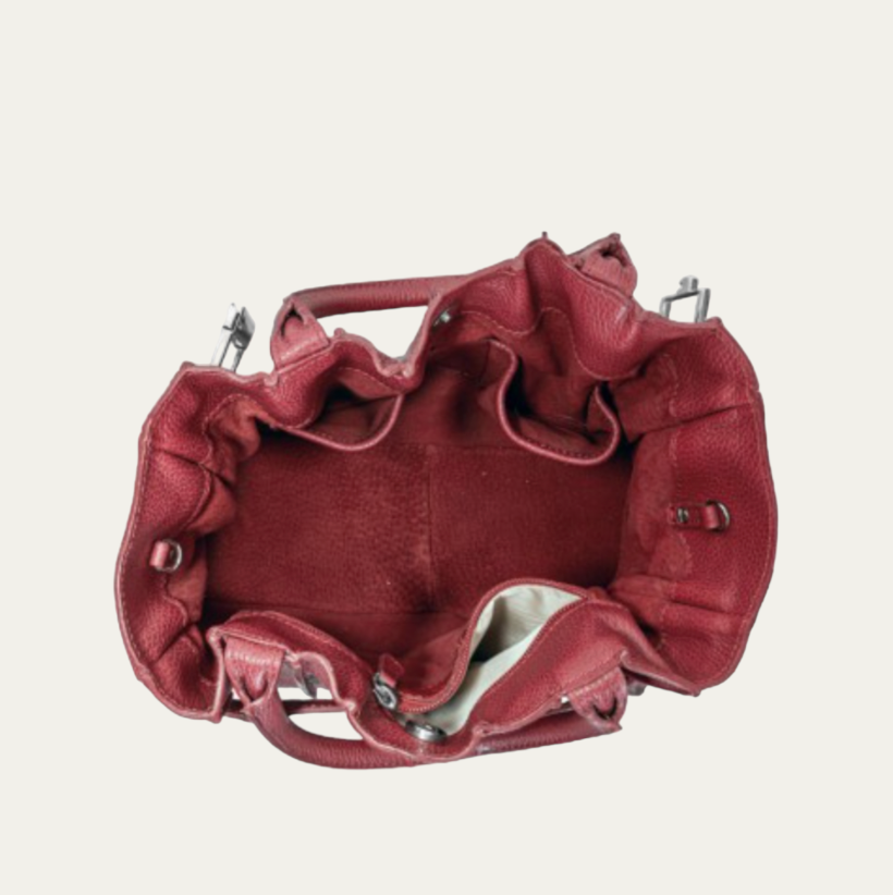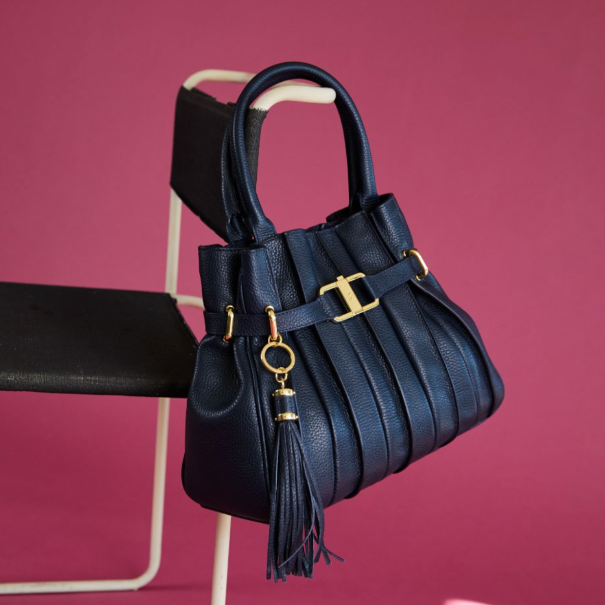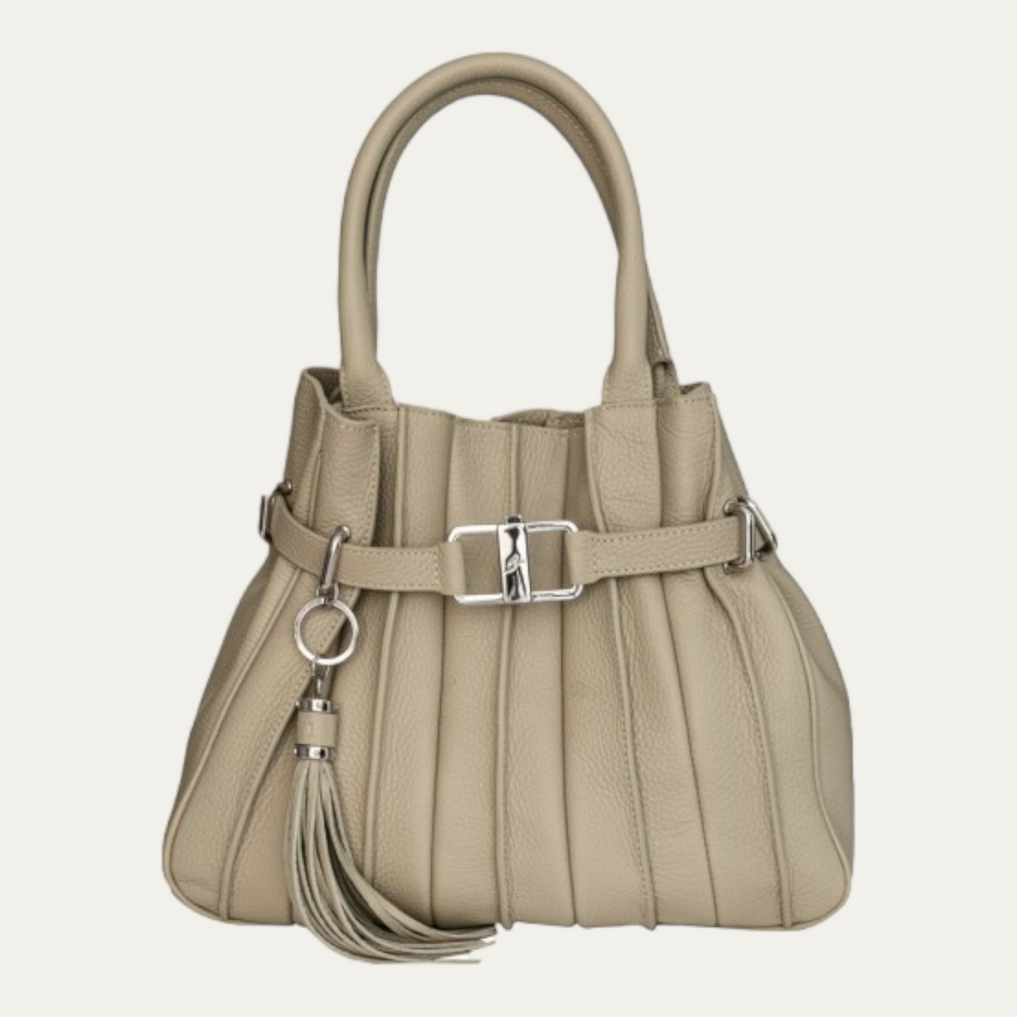 This stylish handbag is handcrafted from vegetable tanned leather with a grained print. It has a pleated design and a leather loop belt with a clasp, as well as top leather handles with a magnetic closure and a statement Buti tassel. The detachable and adjustable strap allows it to be worn cross-body. The spacious interior is plain lined with a side pocket. With a variety of gorgeous colors and textures available, this bag is a must-have accessory for every day. Plus, customizations are available upon request.