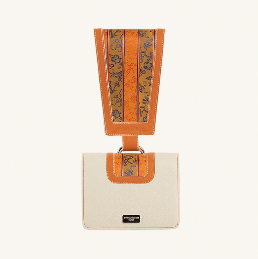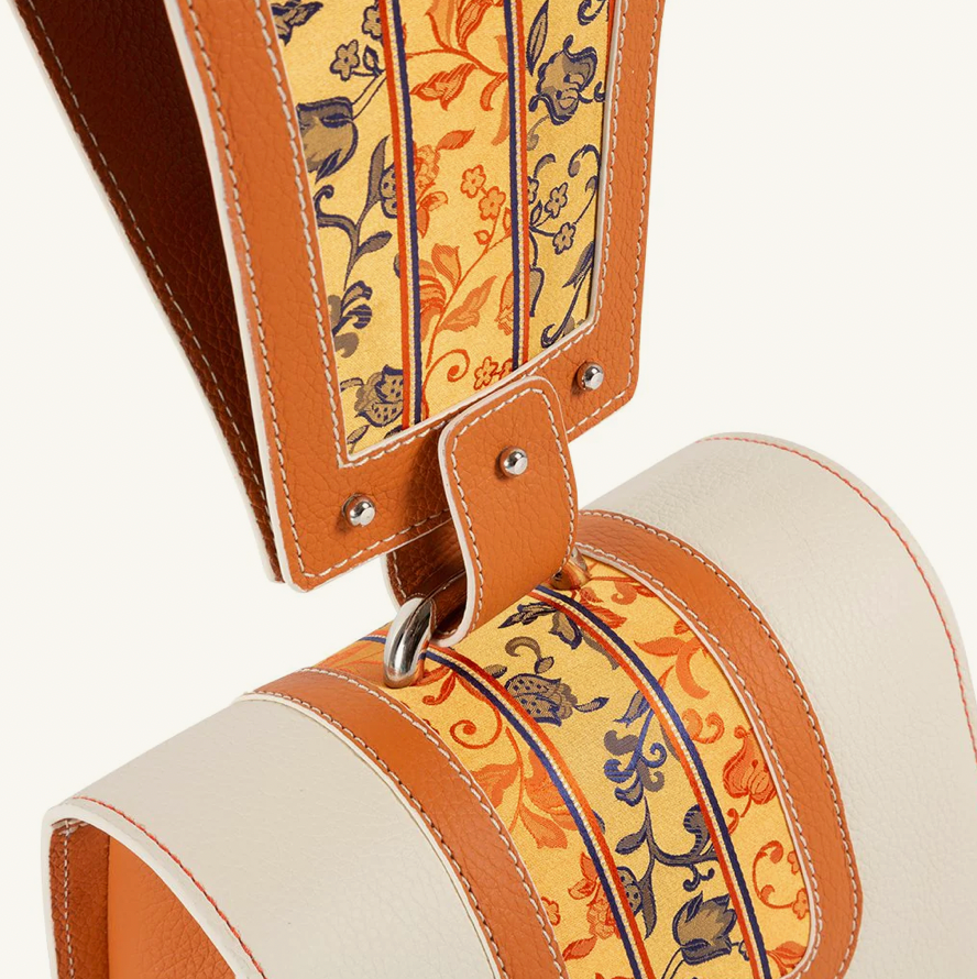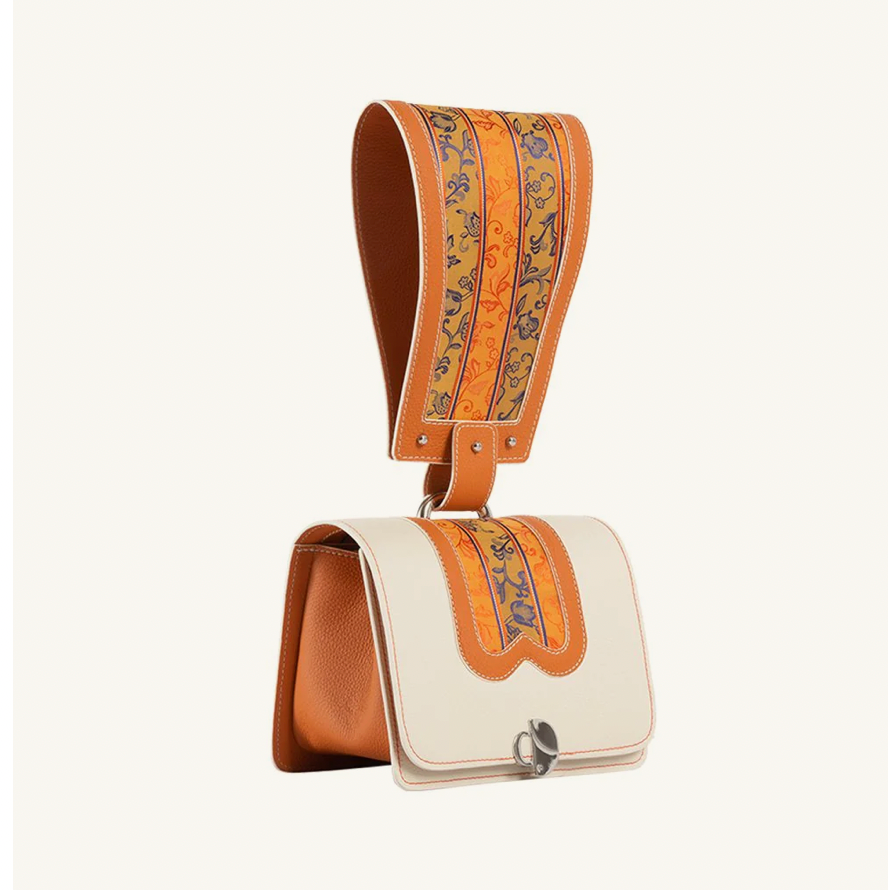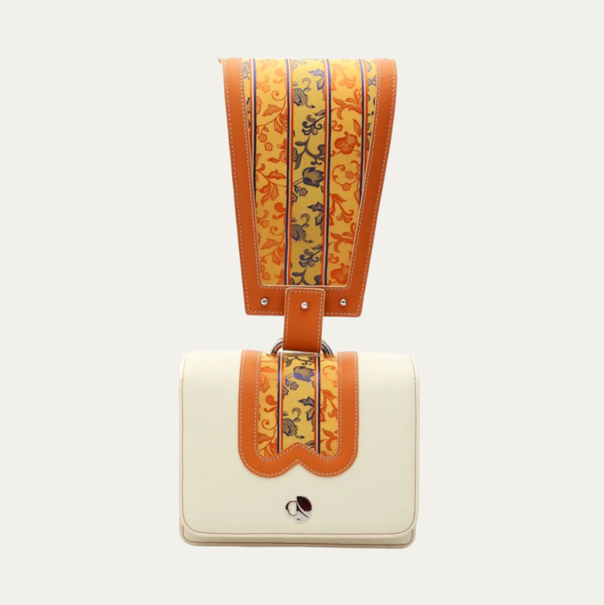 The iconic Glo Glon handbag designed by Chiara is the perfect blend of Milanese urban elegance and the designer’s love of Tyrolean culture. Inspired by the typical cowbells that ring in the mountains, Chiara creates this model with an innovative and practical design, further enhanced by unique details and luxurious materials. The pure silk sleeve allows the bag to be carried comfortably on the arm or in the hand.