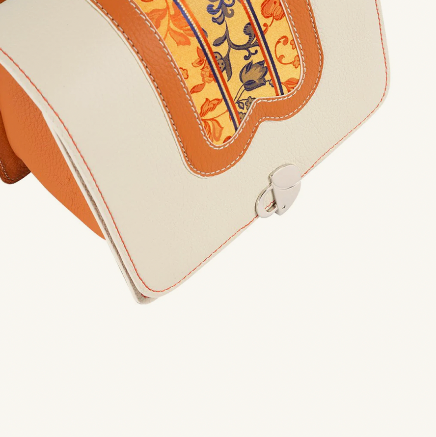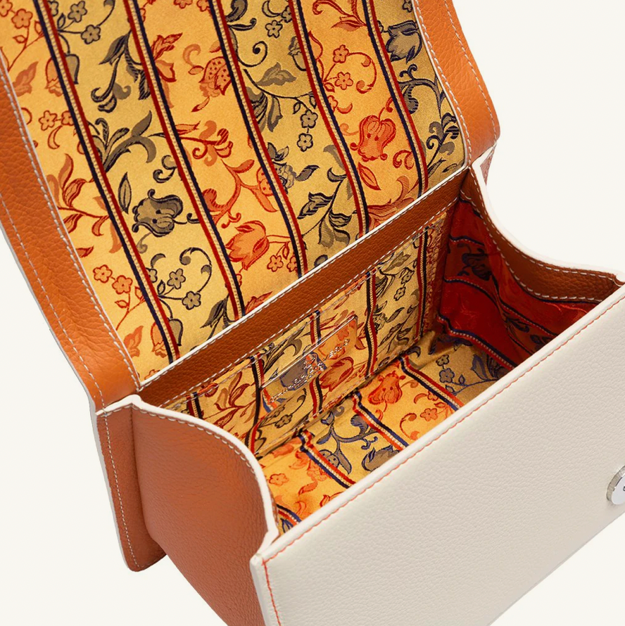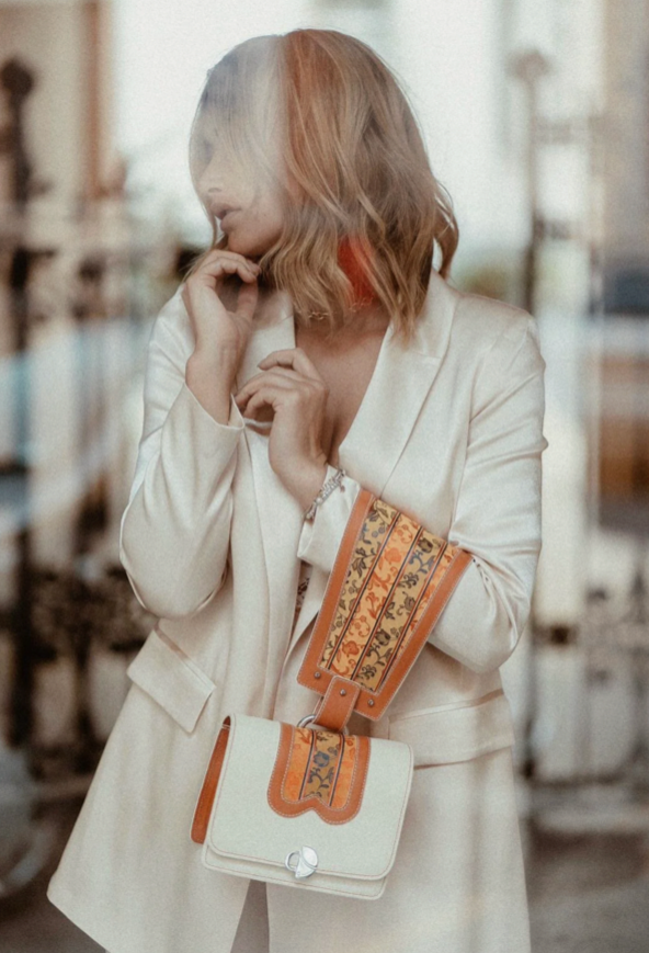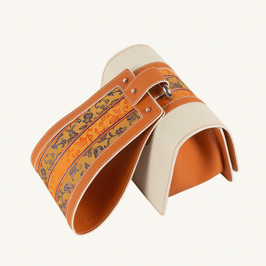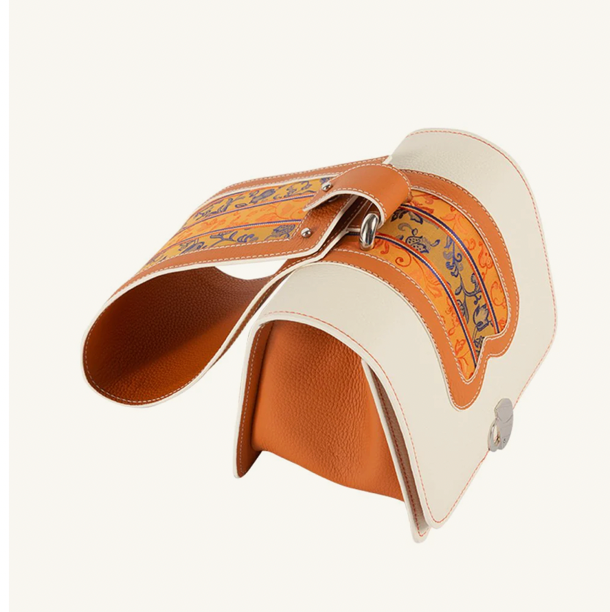 The iconic Glo Glon handbag designed by Chiara is the perfect blend of Milanese urban elegance and the designer’s love of Tyrolean culture. Inspired by the typical cowbells that ring in the mountains, Chiara creates this model with an innovative and practical design, further enhanced by unique details and luxurious materials. The pure silk sleeve allows the bag to be carried comfortably on the arm or in the hand.