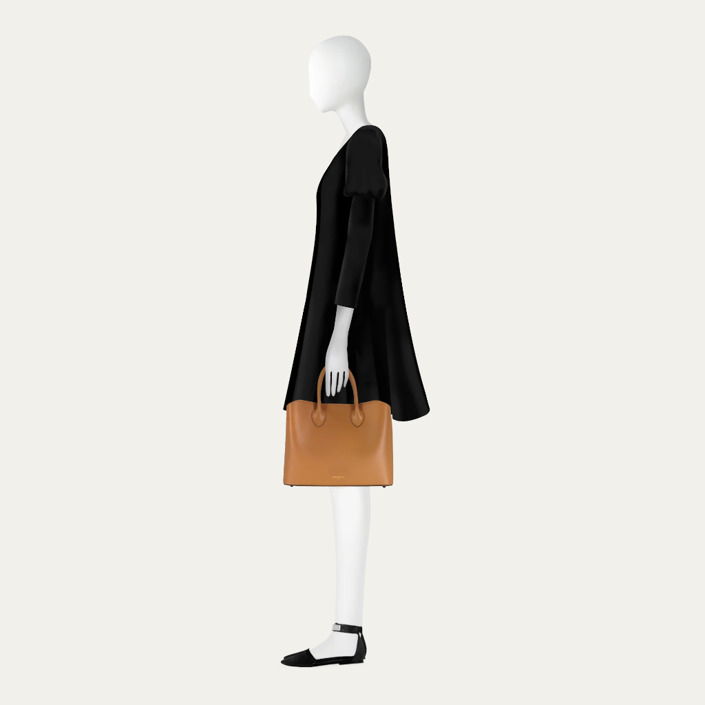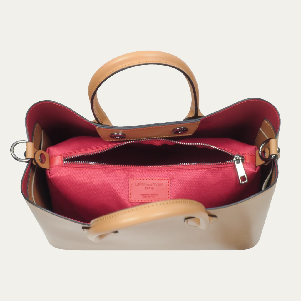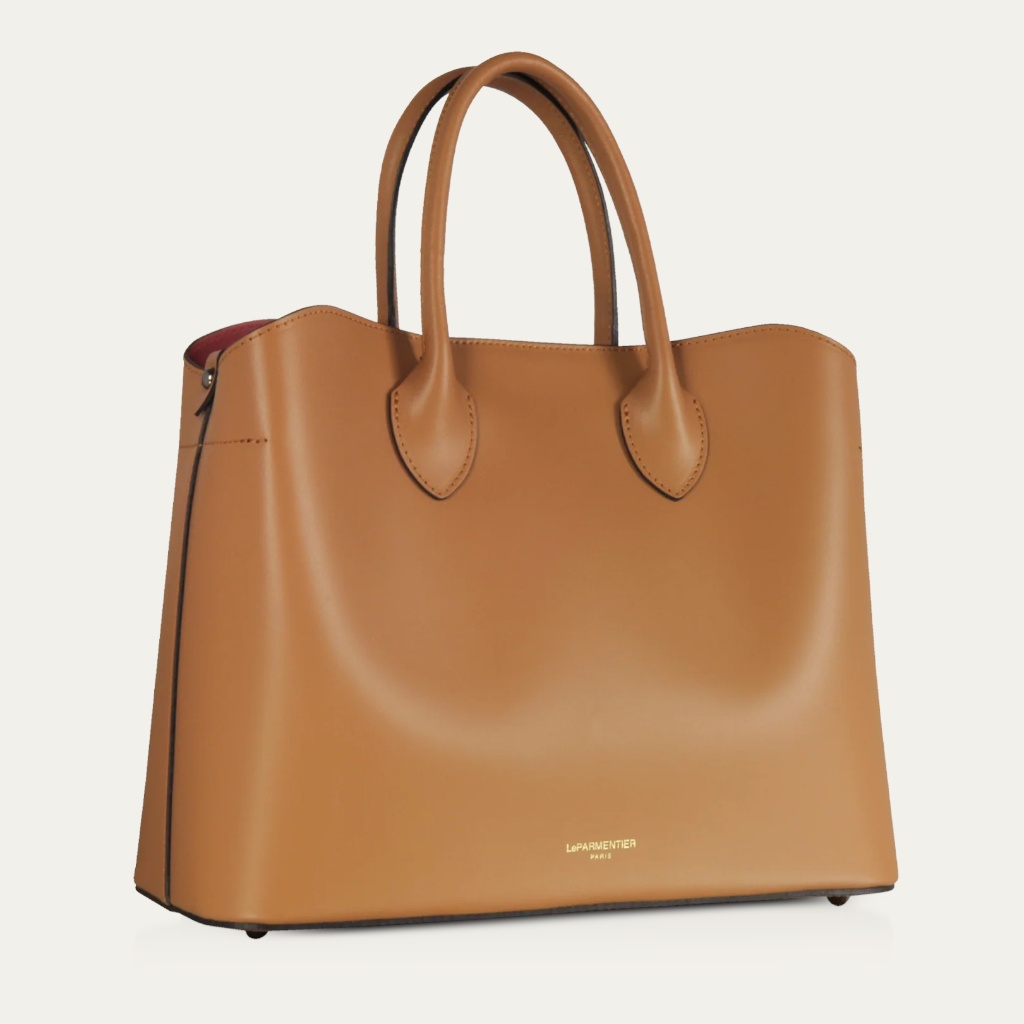 Jackie Leather Tote Bag crafted in neutral hued smooth genuine Italian calf leather, has simple design elements that create a refined aesthetic sure to compliment your wardrobe. Featuring double rolled handles, snap magnetic closure, contrast interior, center detachable zip pouch, flat bottom for stability with protective feet, and gunmetal hardware. Made in Italy.