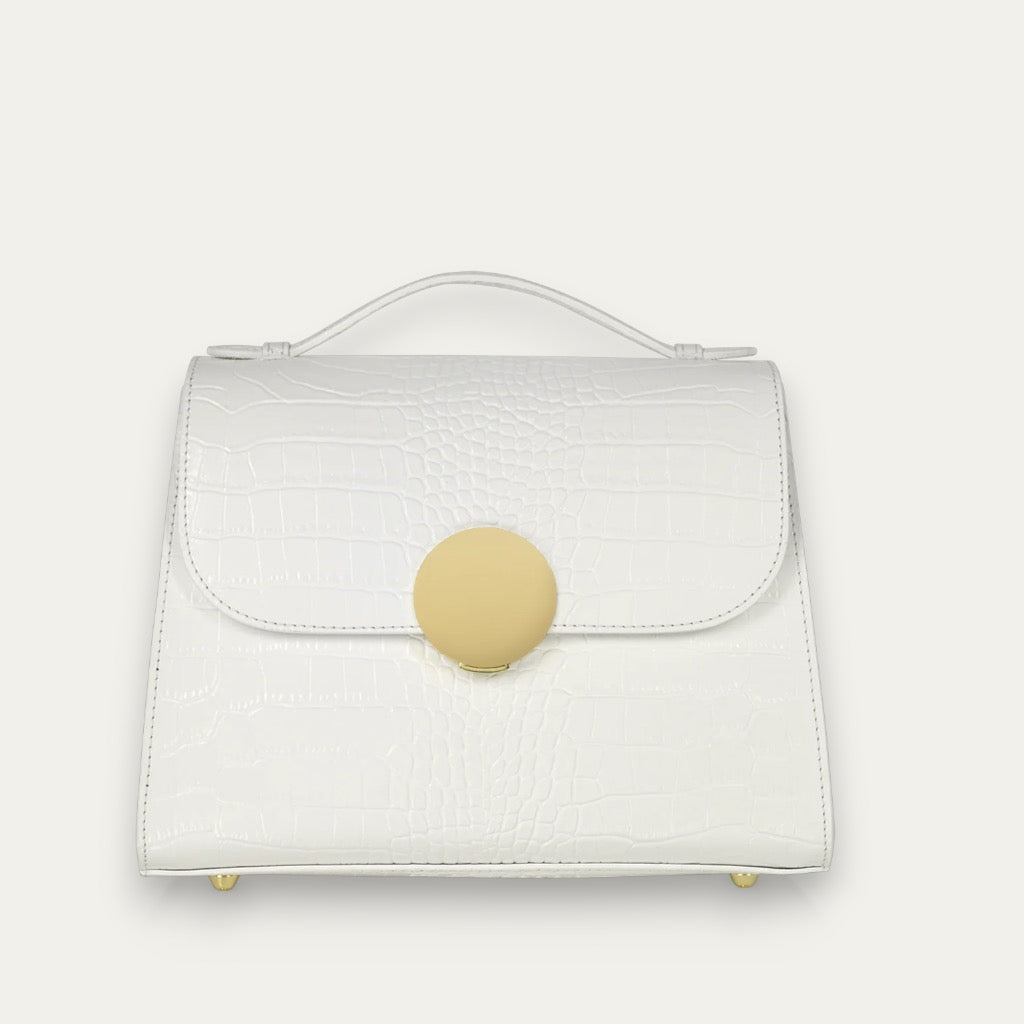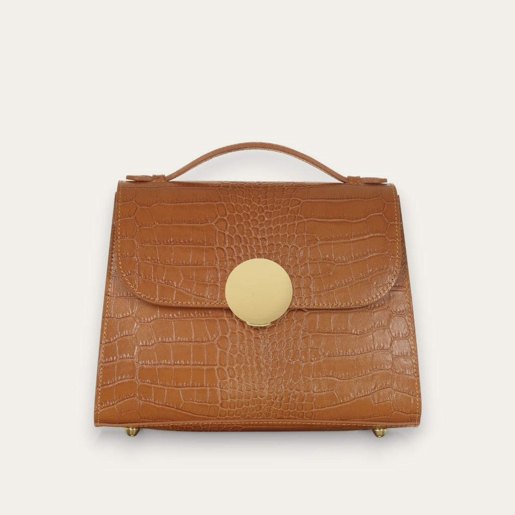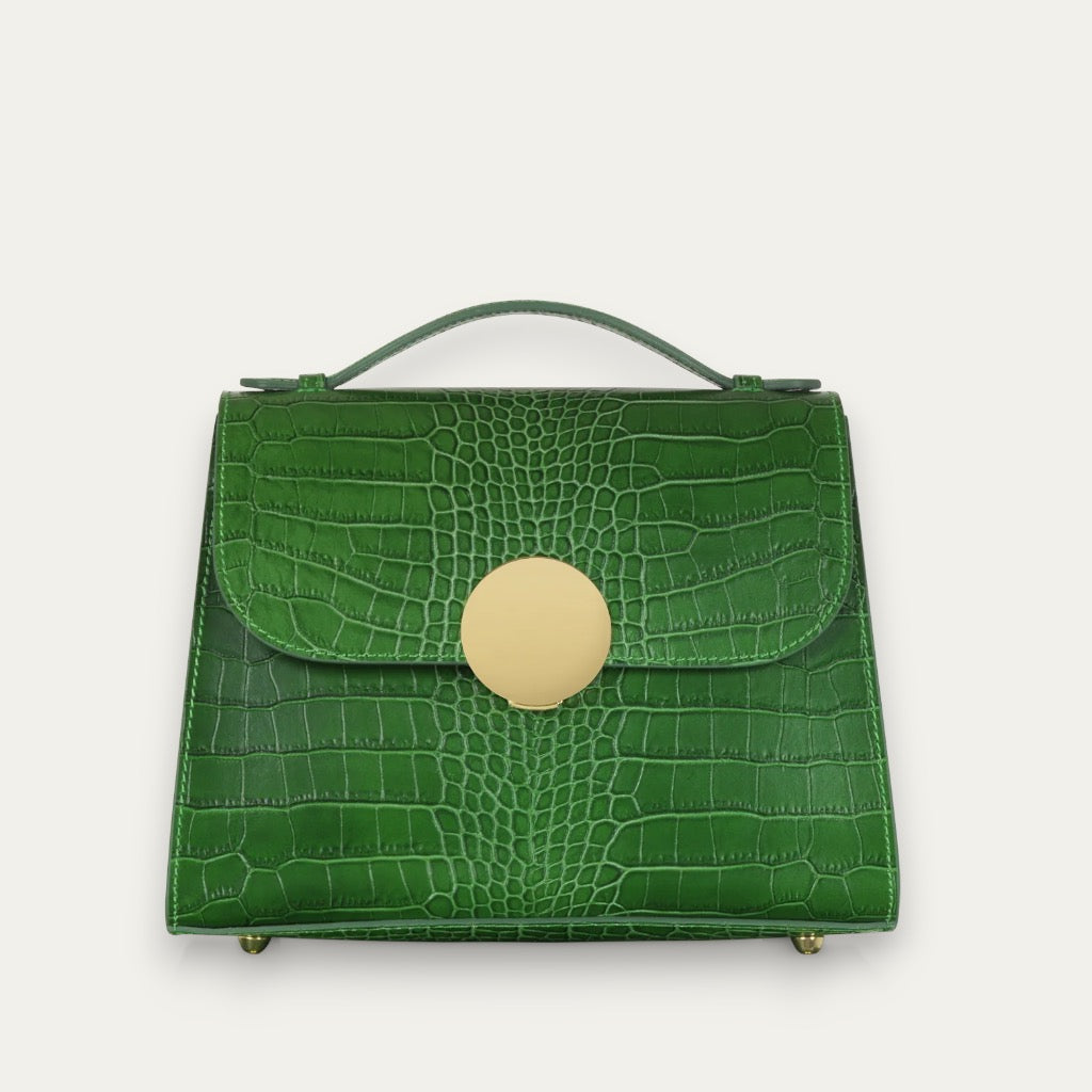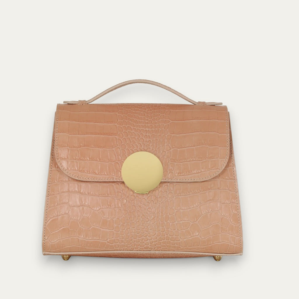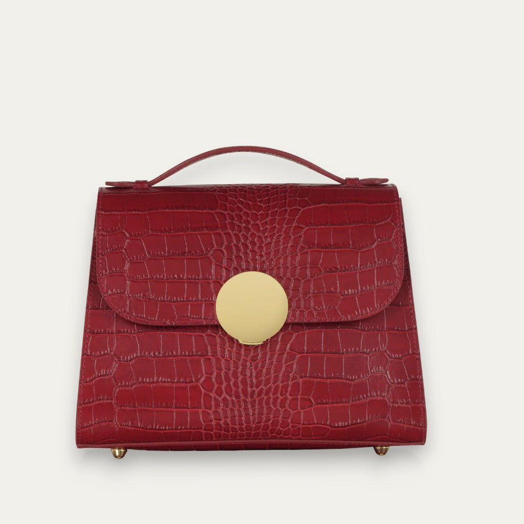 Vintage glamour coupled with impeccable craftsmanship, the Bombo Top-Handle Satchel Bag will add polish to every occasion. Crafted in croco embossed leather, the bag features flap push button clasp close with geometric hardware, top handle, detachable strap to go hands free, internal zip pocket, protective feet, and gold tone hardware. Handmade in Italy.