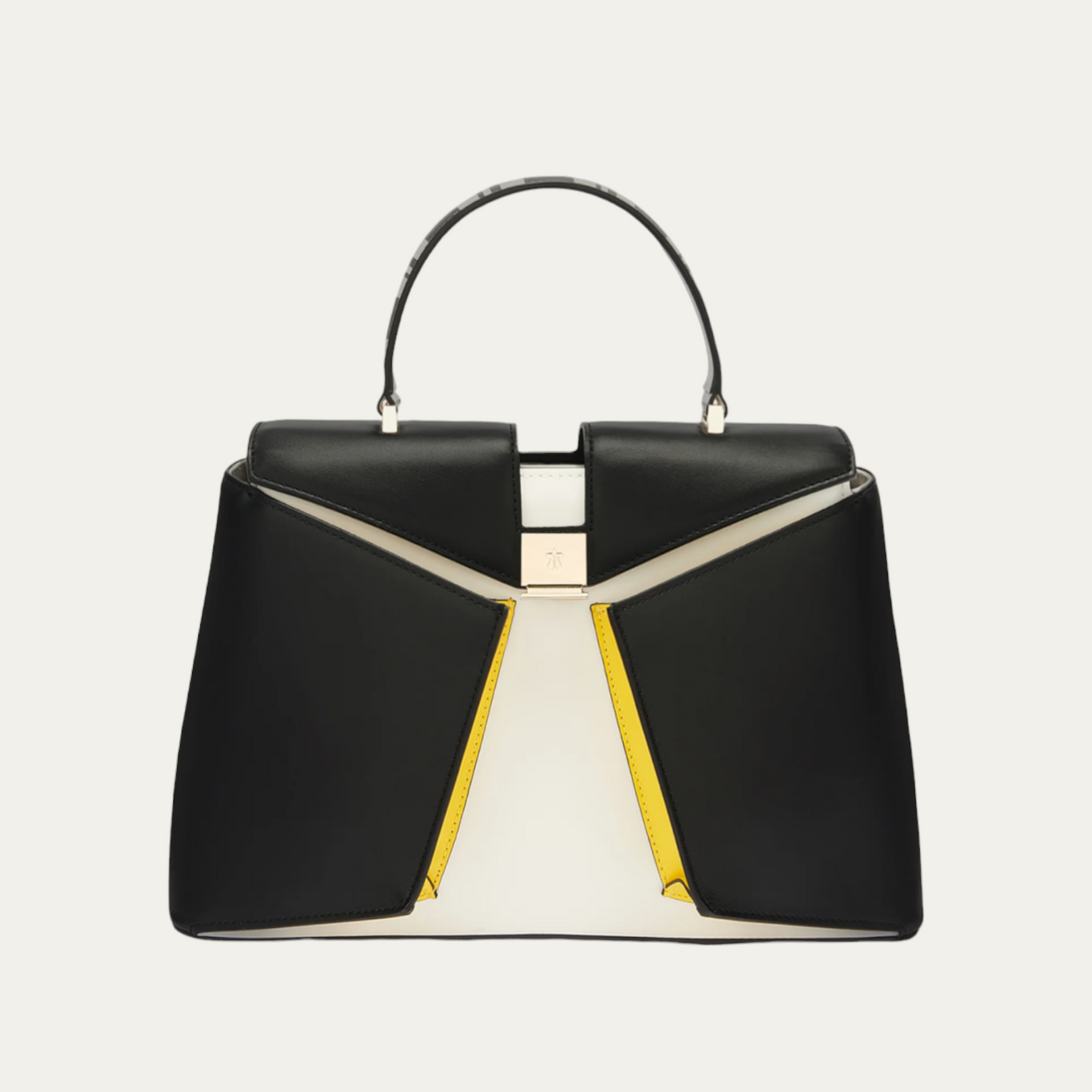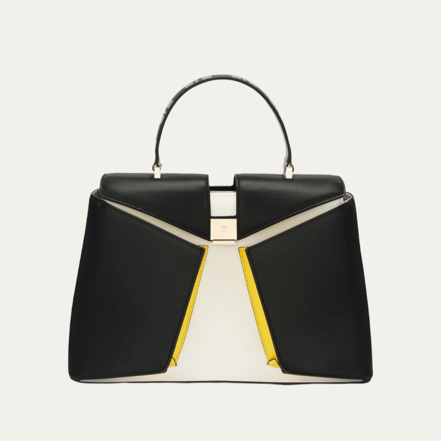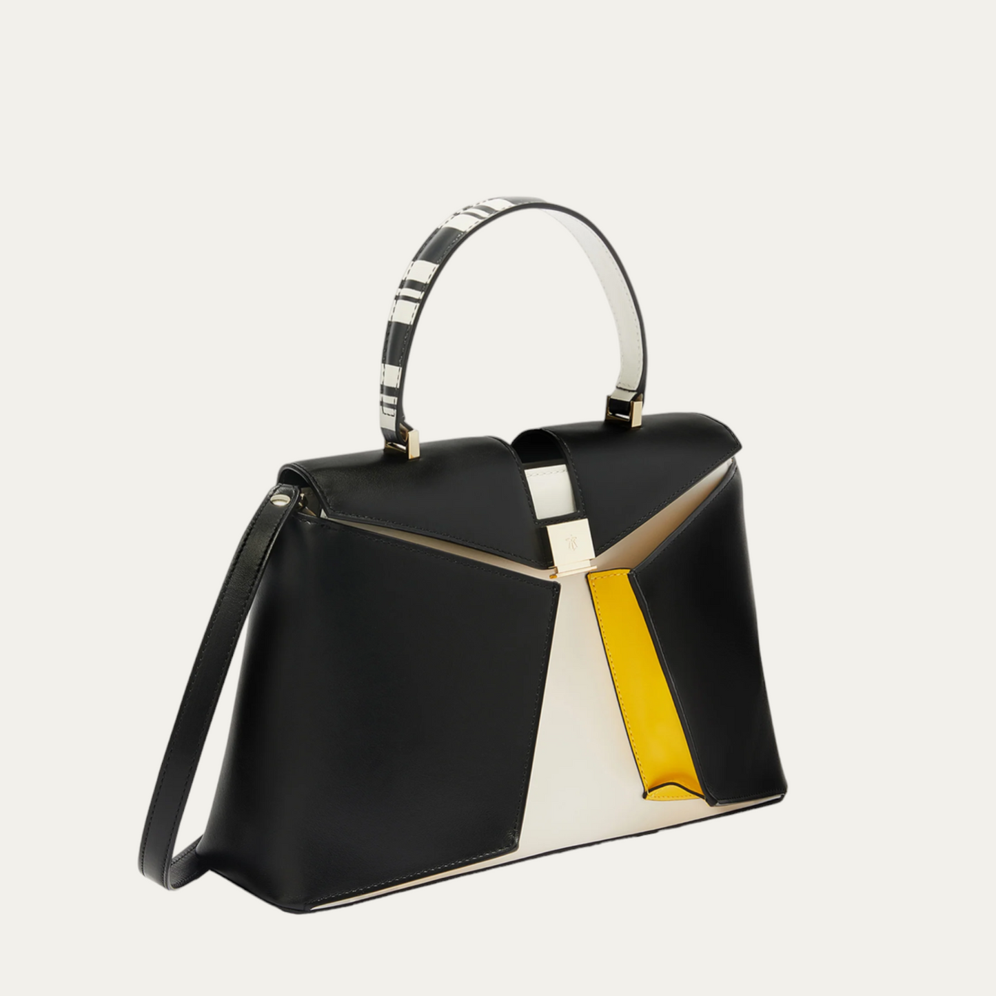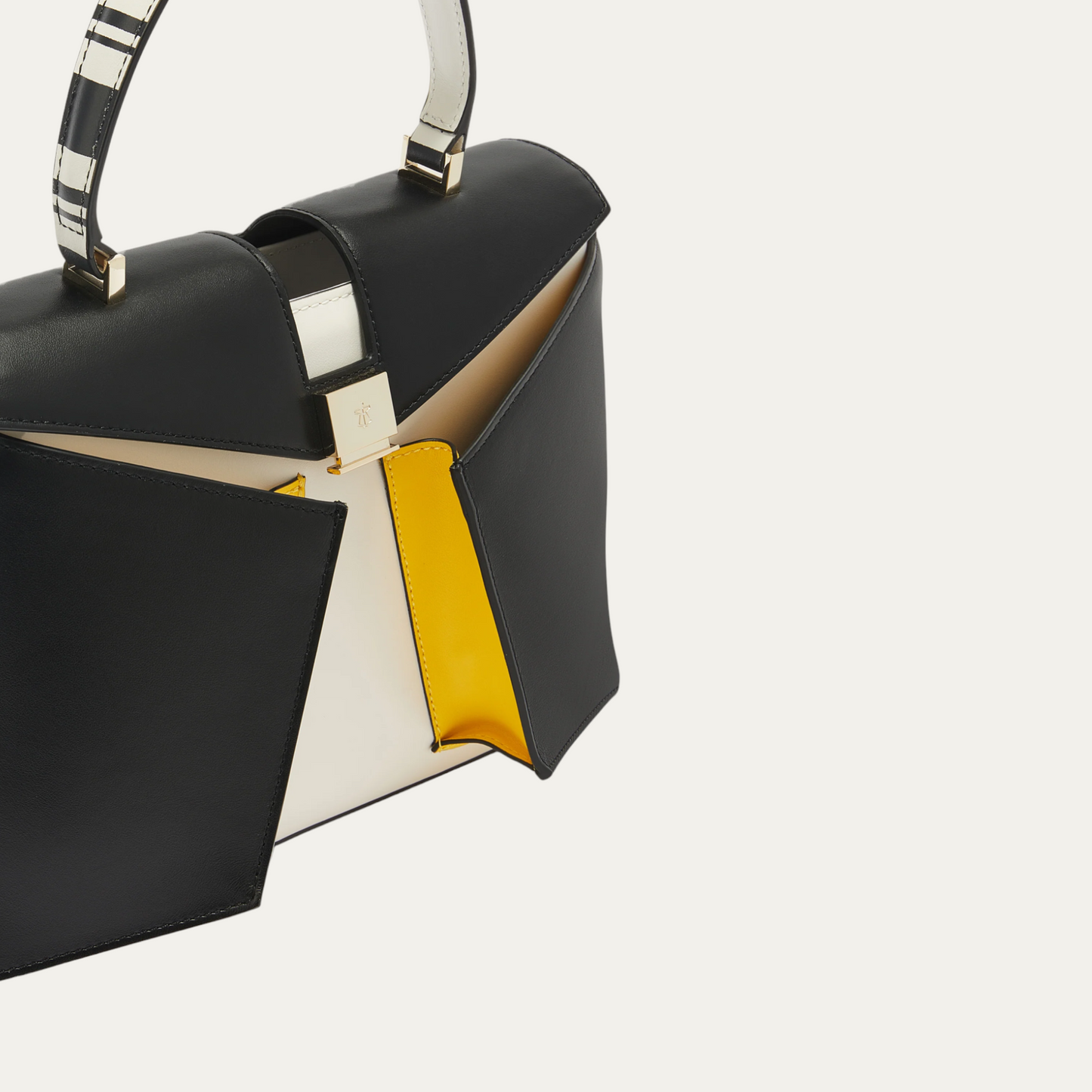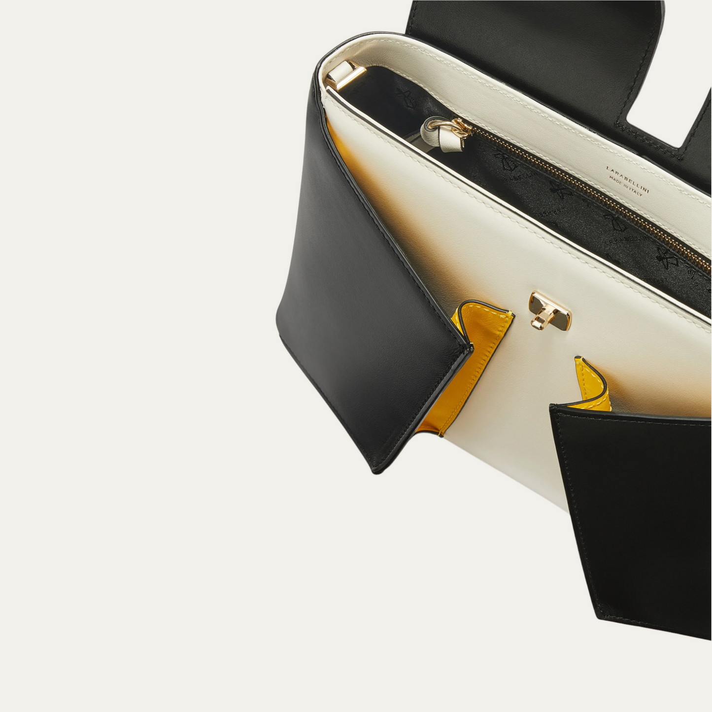 The flap covers the main compartment by embracing the two front pockets and accentuating the geometric play of the volumes.