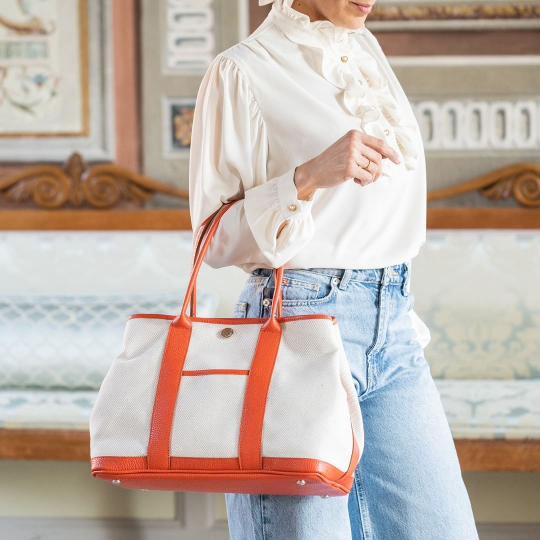 This total cotton tote features 100% calfskin details, creating a chic textural and colorful contrast. Marina B boasts a sturdy silhouette and offers plenty of space, perfect for the office during spring/summer.