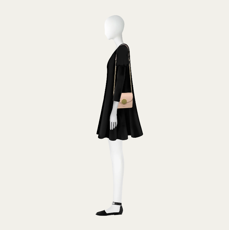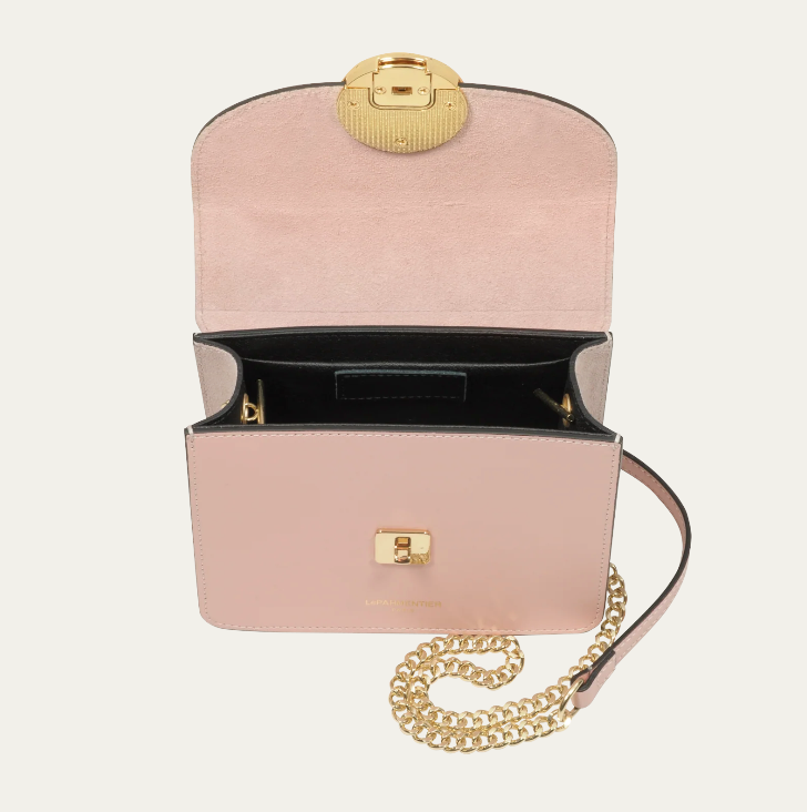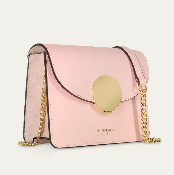 New Ondina Mini Shoulder Bag crafted in smooth genuine Italian calf leather, is the elegant choice with its modern lined silhouette and petite form for all of your little necessities day or night. Featuring flap top circular push lock closure, chain and leather shoulder strap, internal pocket, tonal stitching and gold tone hardware. Hand made in Italy.