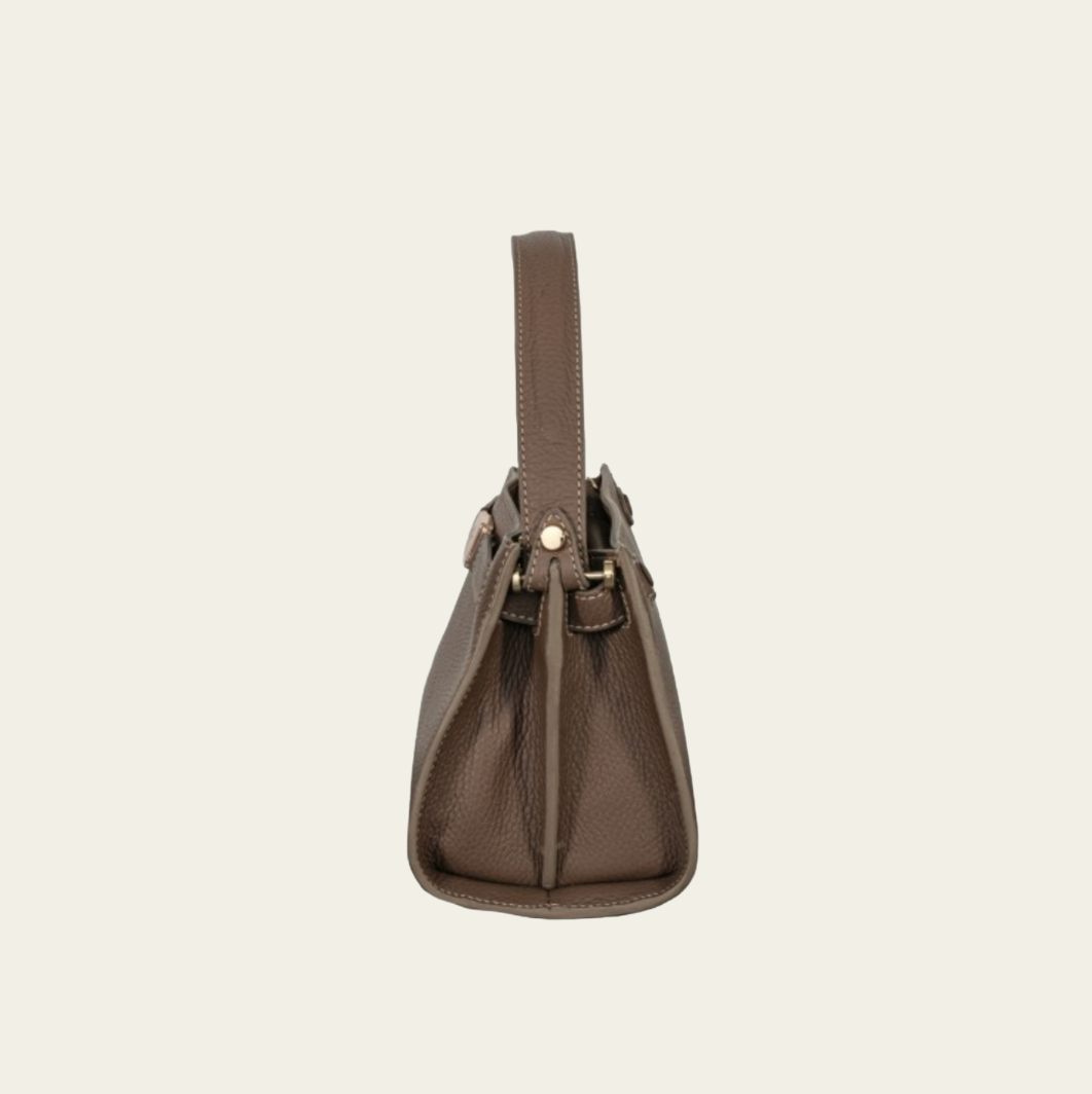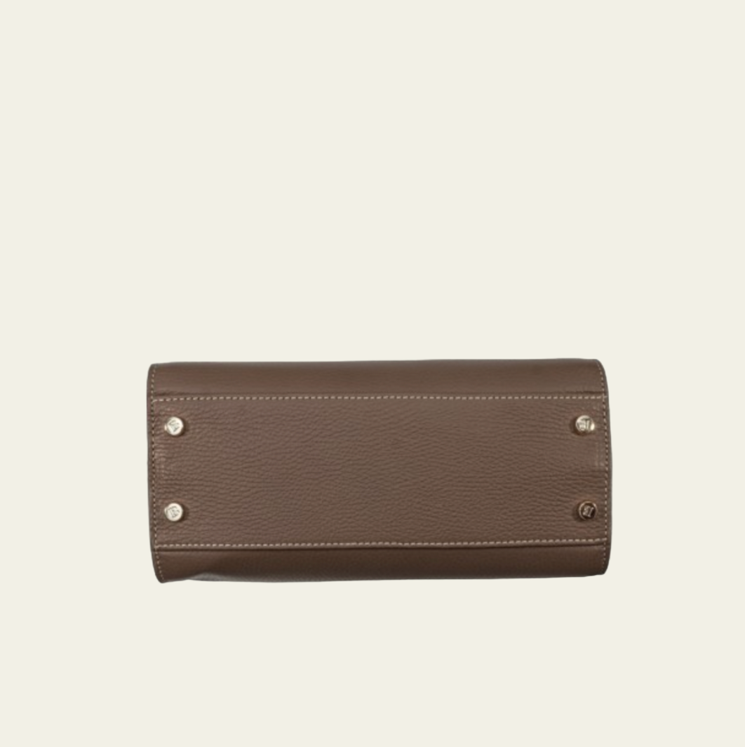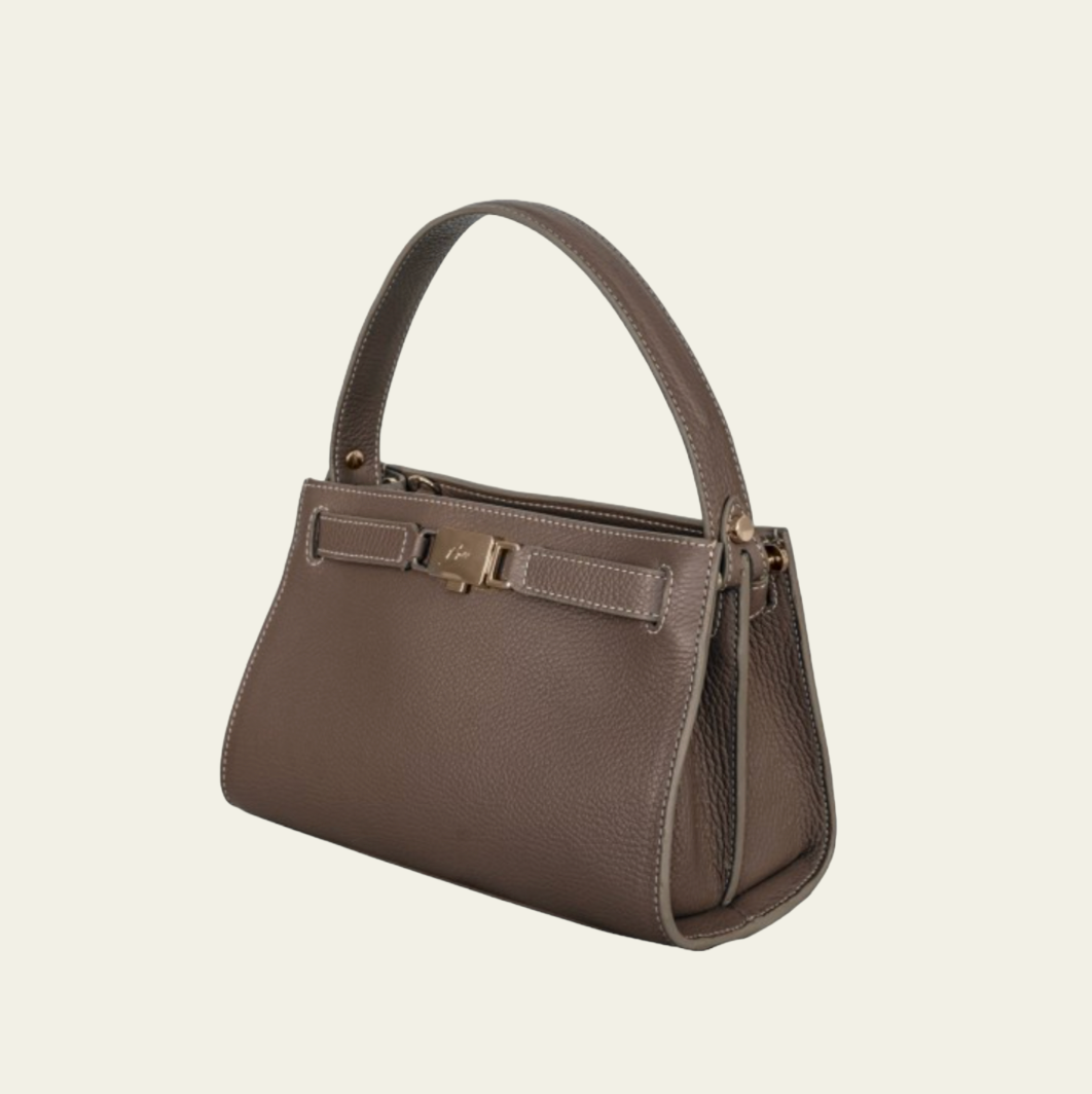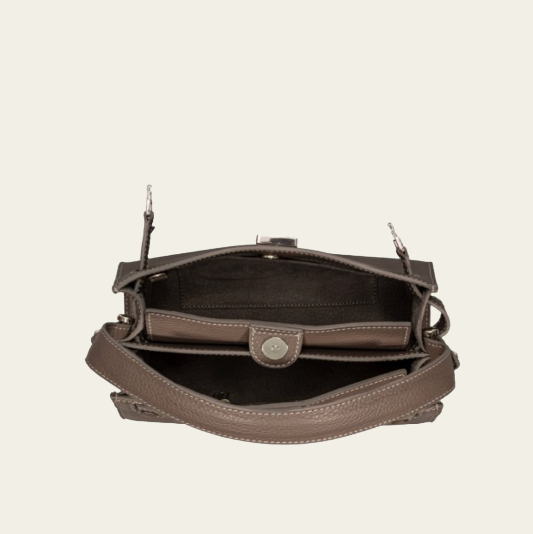 Olivia 26, created by Buti Pelletterie, is a statement-making addition to any day outfit. Handcrafted in Italy from vegetable-tanned leather and lined with luxurious suede, this classically stylish bag features a single top handle, two flaps closures and an adjustable and removable leather strap. Additionally, it has an interior zippered pocket, slip pocket, and four metal feet.