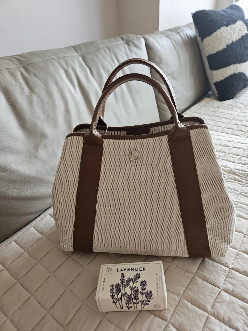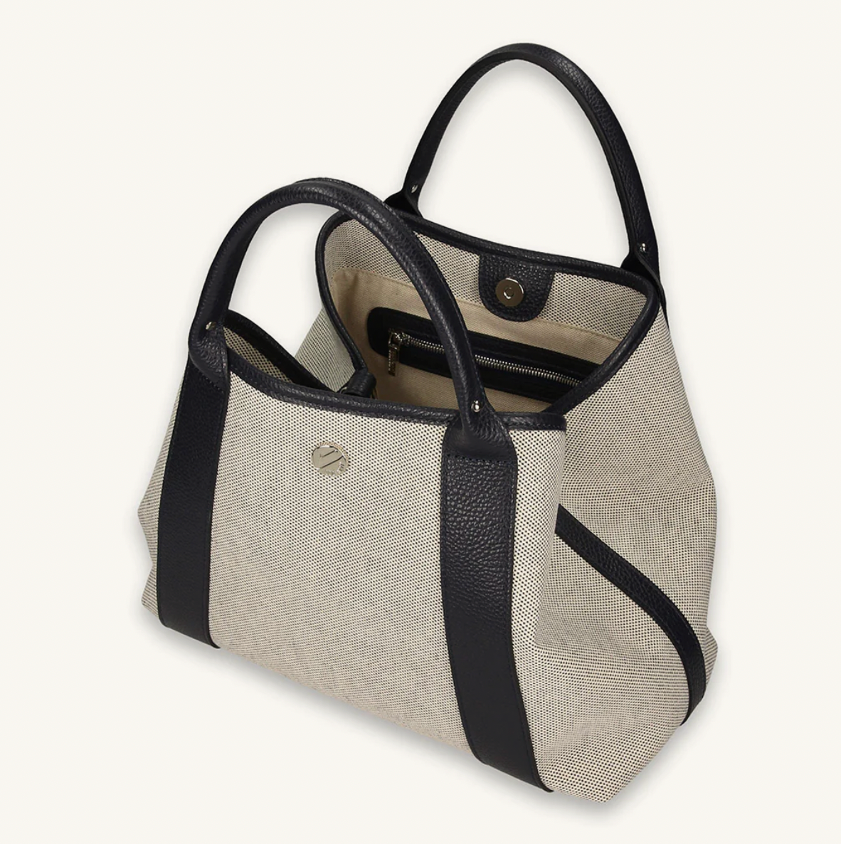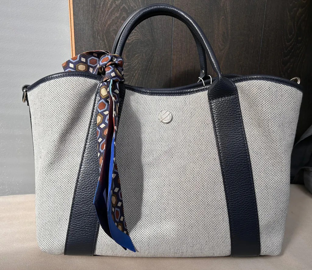 Onda B is a top handle bag composed of cotton canvas and calfskin made by Bonfanti.