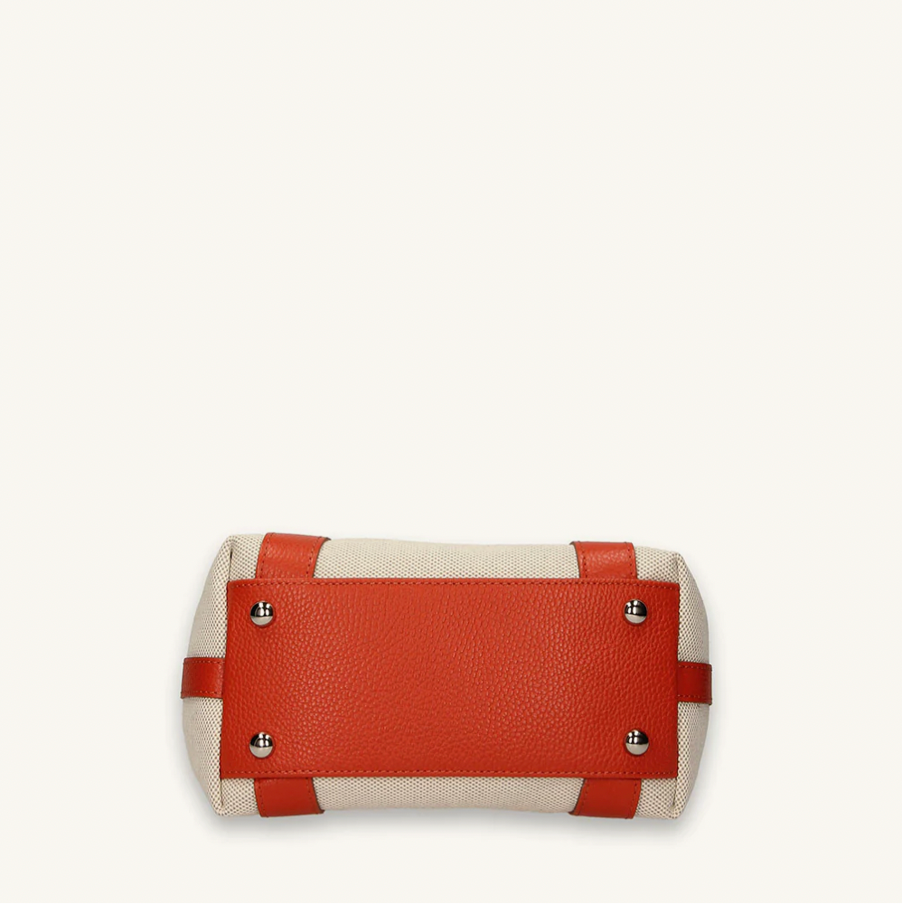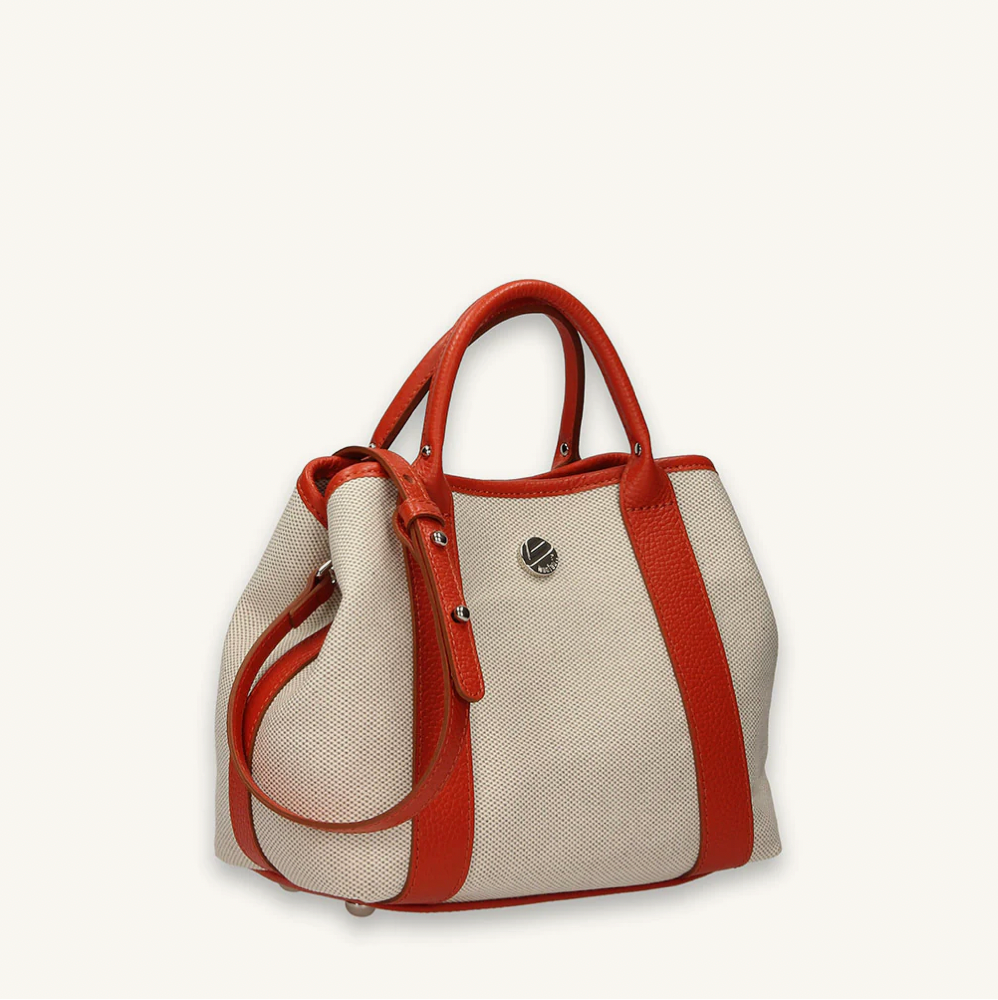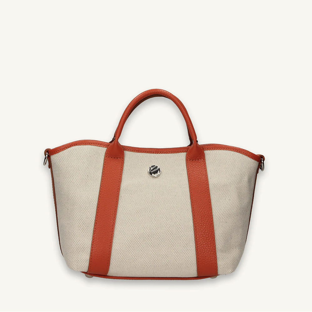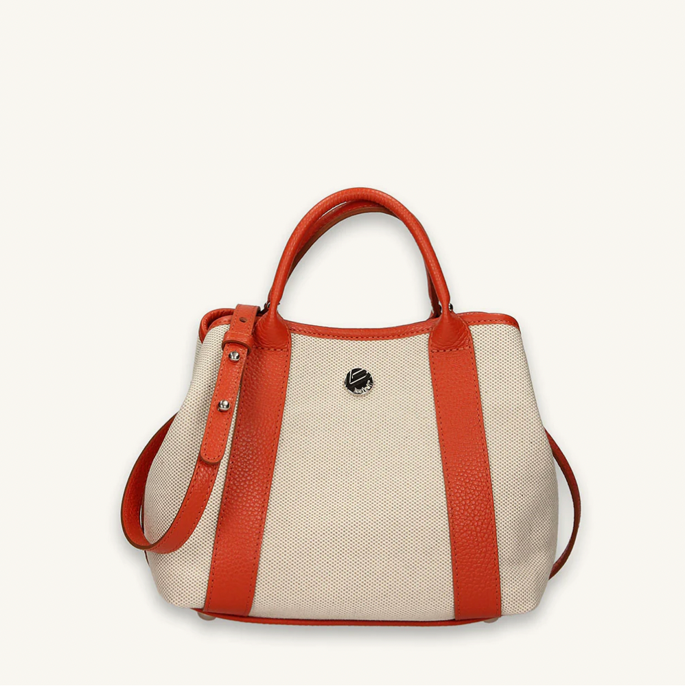 Ondina B is a top handle bag composed of cotton canvas and calfskin made by Bonfanti.