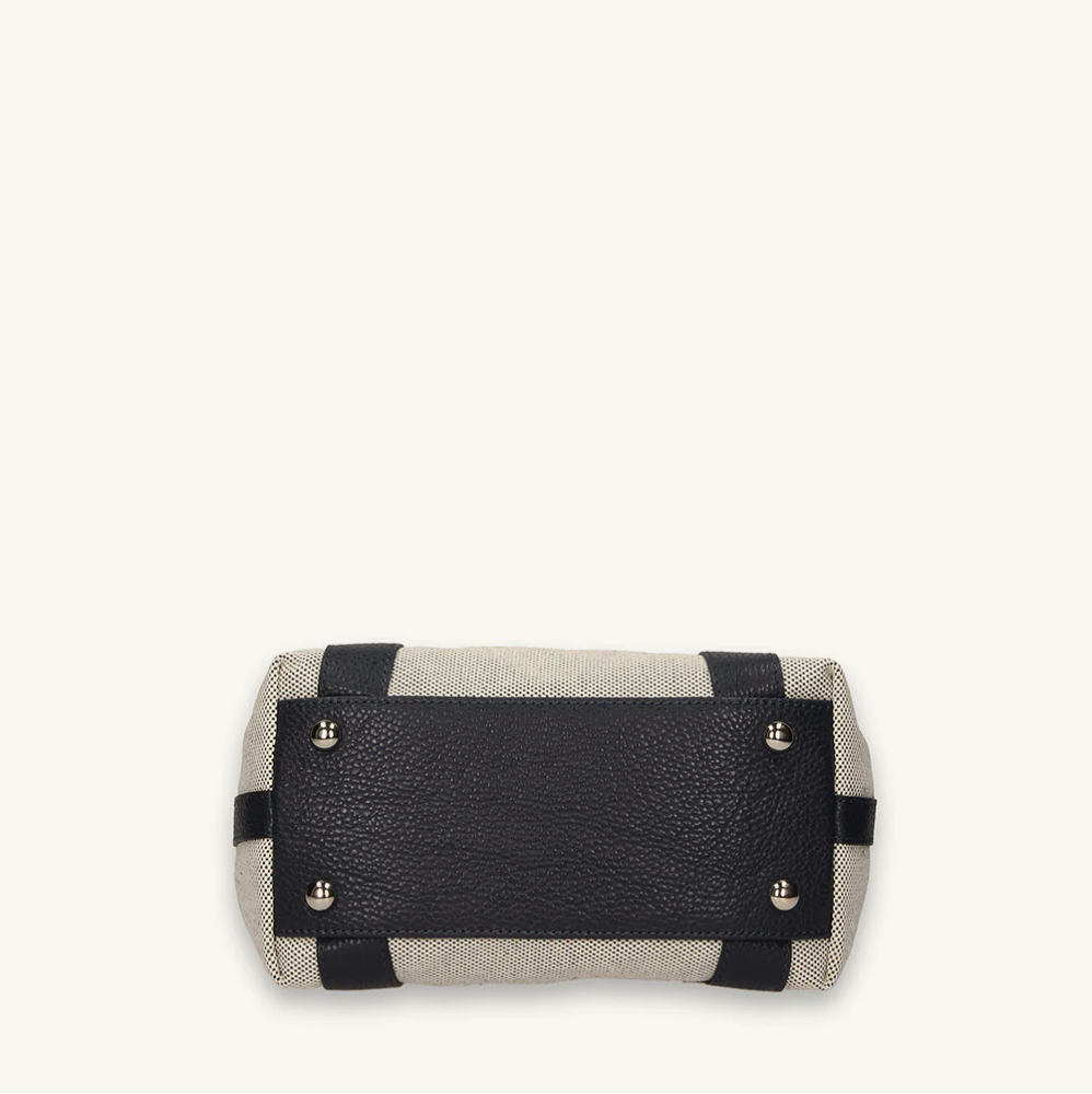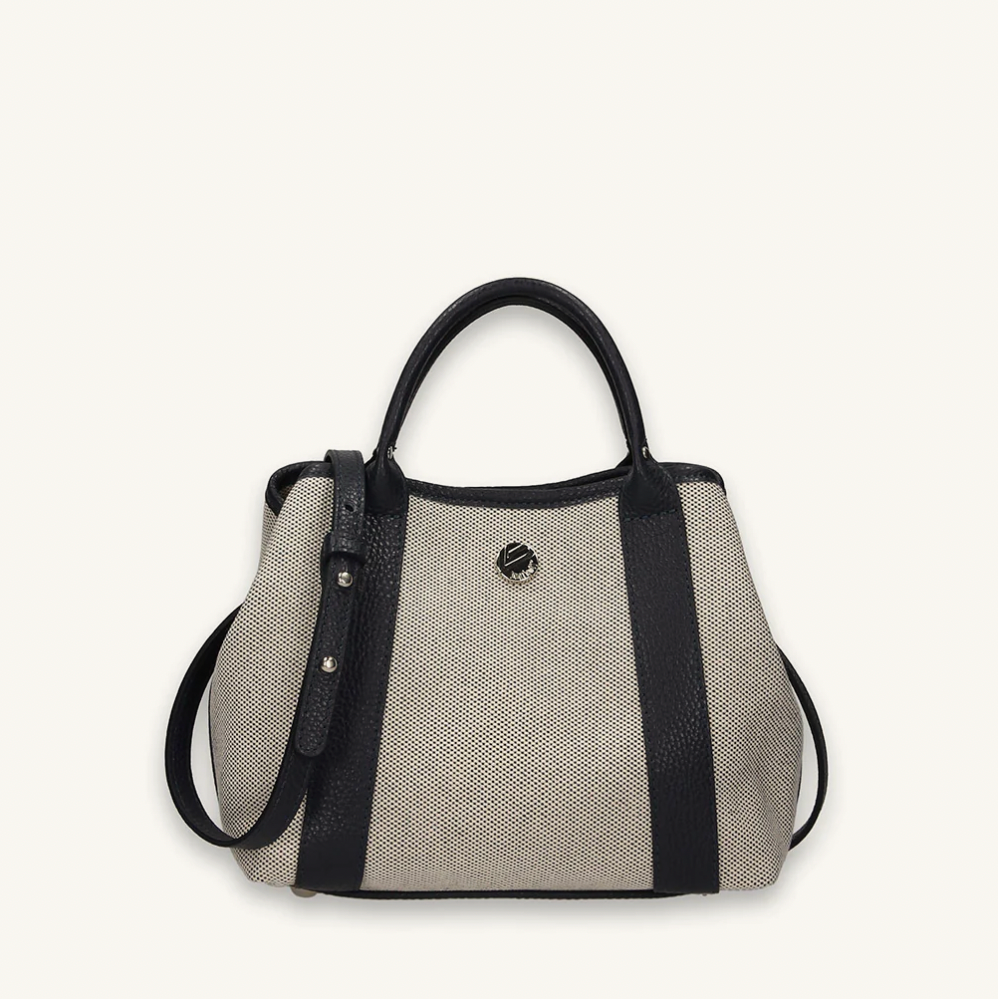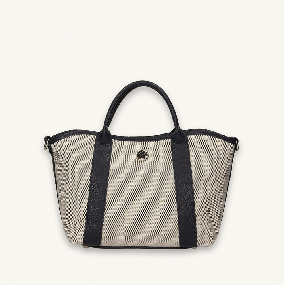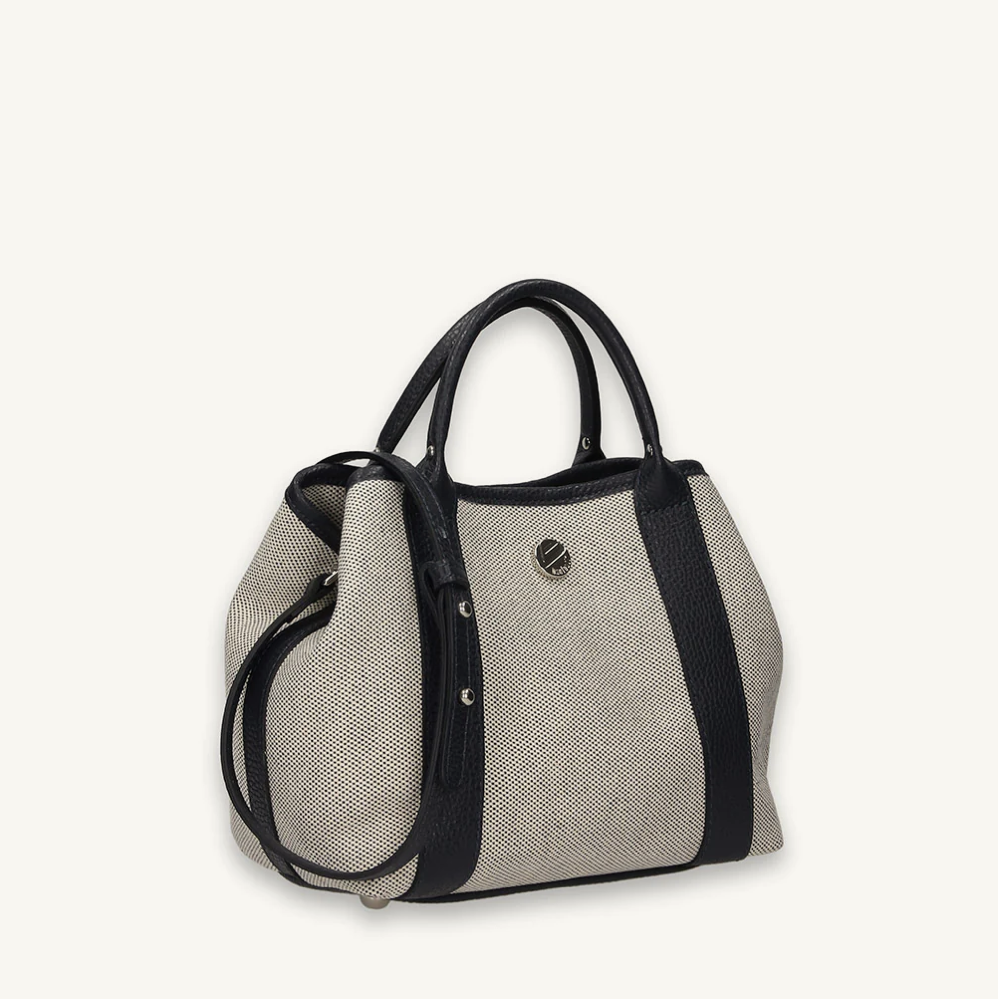 Ondina B is a top handle bag composed of cotton canvas and calfskin made by Bonfanti.