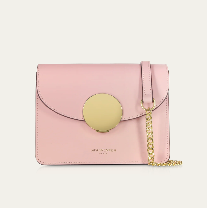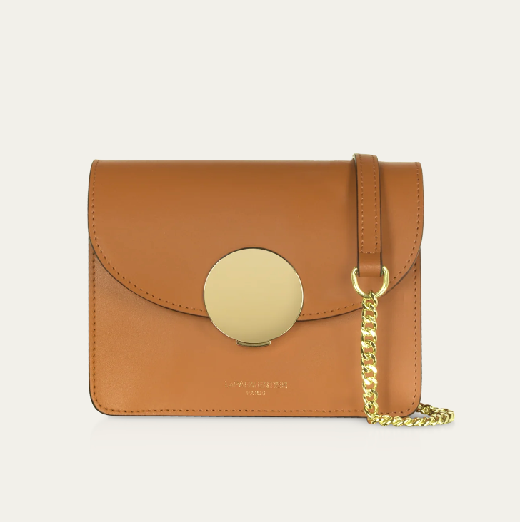 New Ondina Mini Shoulder Bag crafted in smooth genuine Italian calf leather, is the elegant choice with its modern lined silhouette and petite form for all of your little necessities day or night. Featuring flap top circular push lock closure, chain and leather shoulder strap, internal pocket, tonal stitching and gold tone hardware. Hand made in Italy.