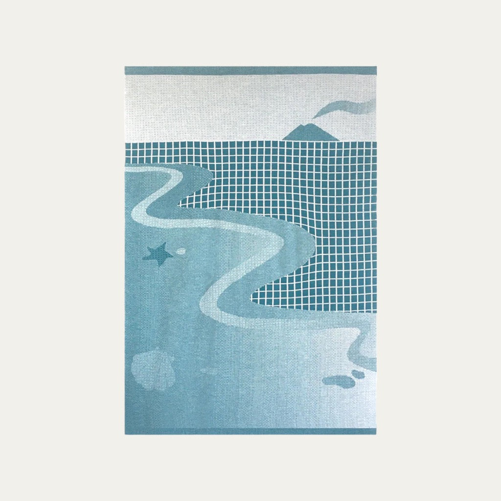 This luxurious 100% Merino wool throw blanket, designed by Serena Confalonieri, can be utilized for both comfort and decor. This artistic piece displays a captivating abstract interpretation of a mountain and ocean landscape, woven together in varying shades of blue. Perfect for adding a cosy and decorative touch to a sofa or bed.