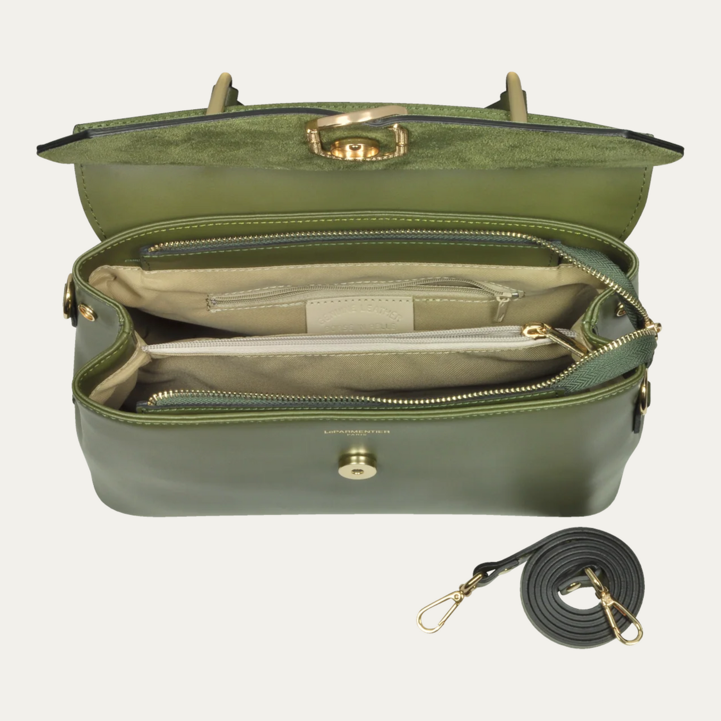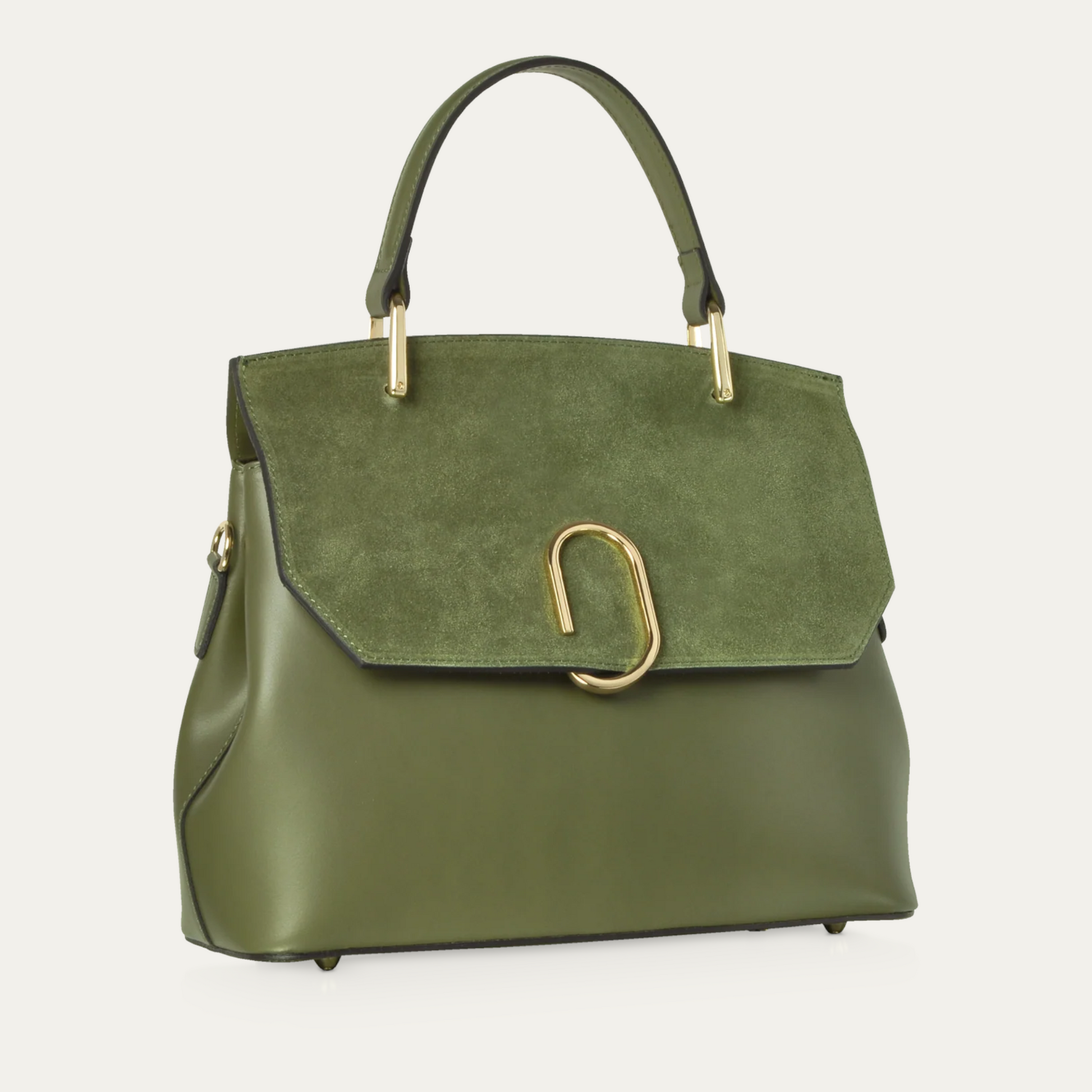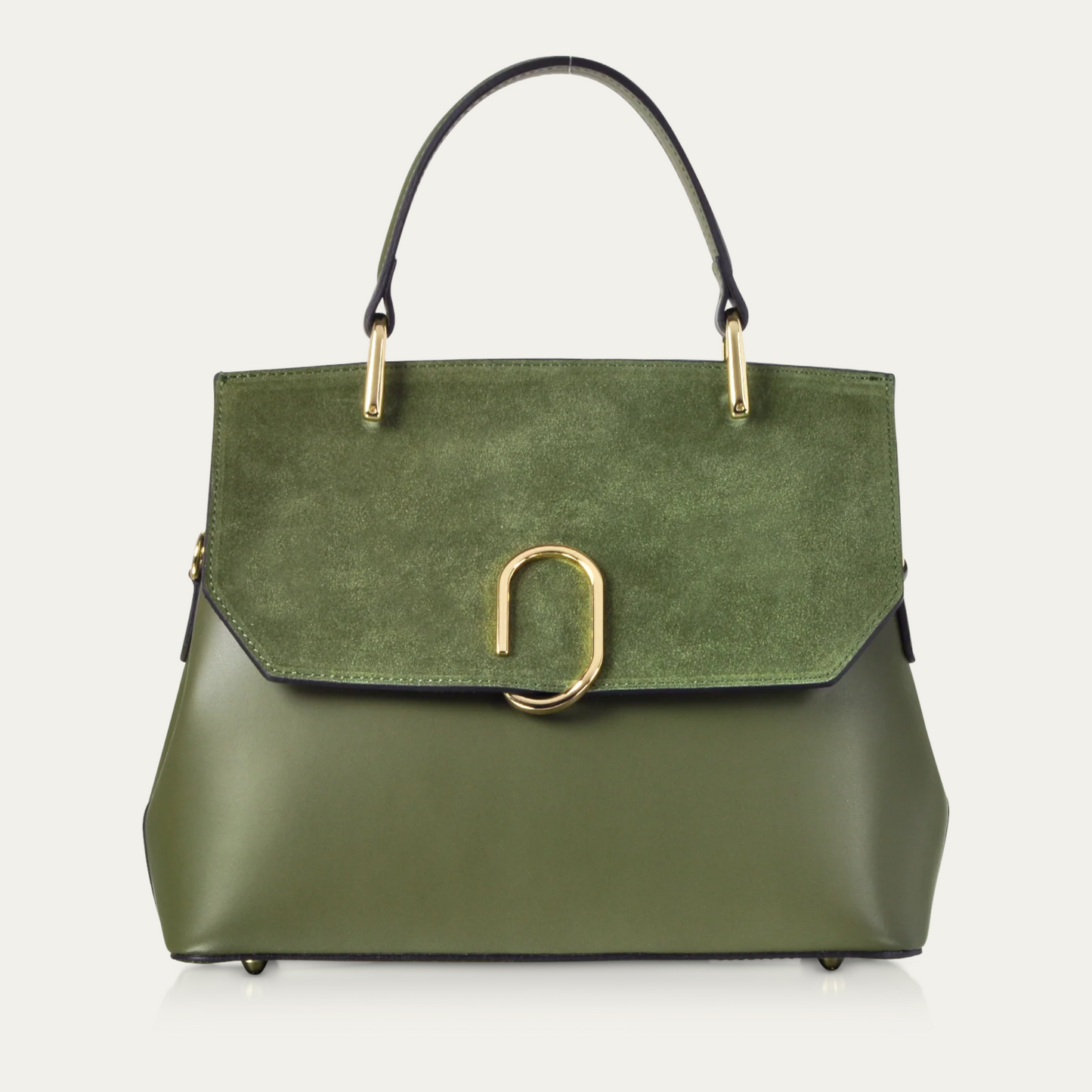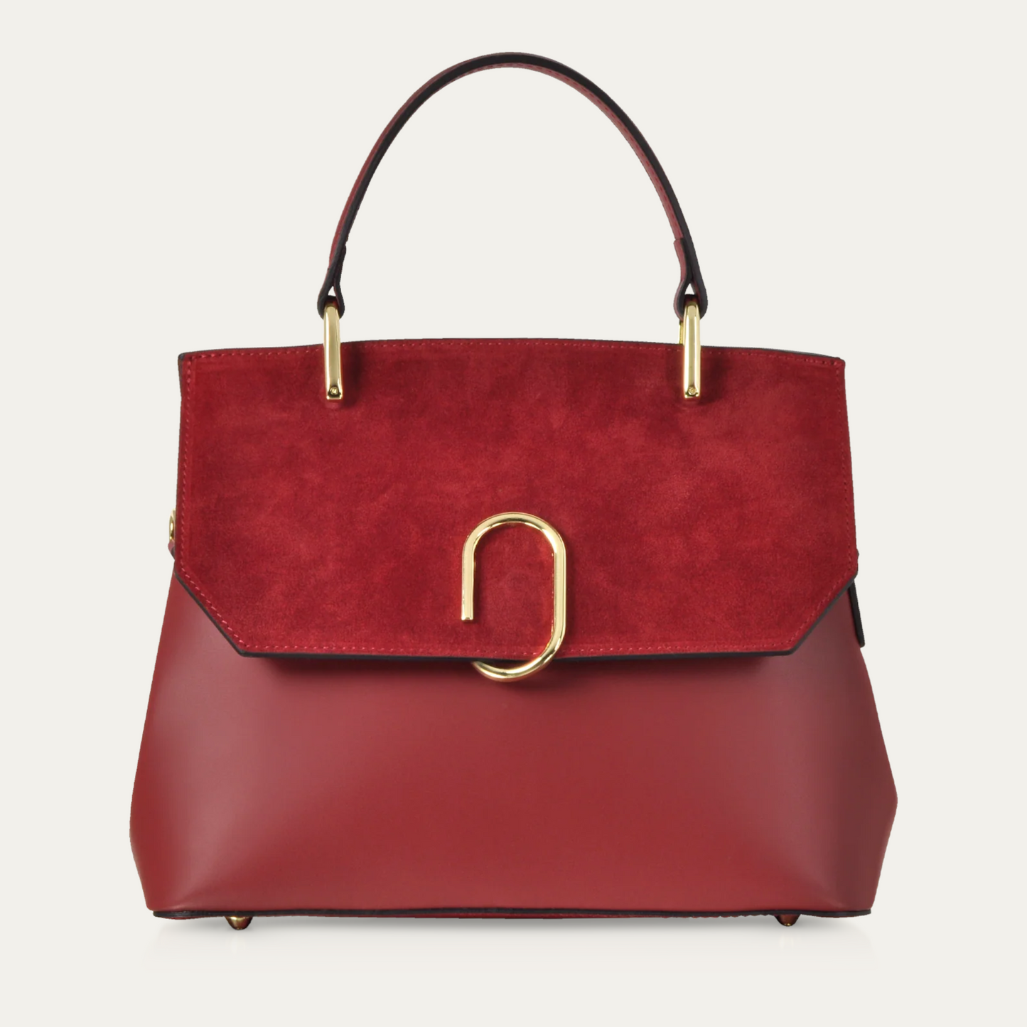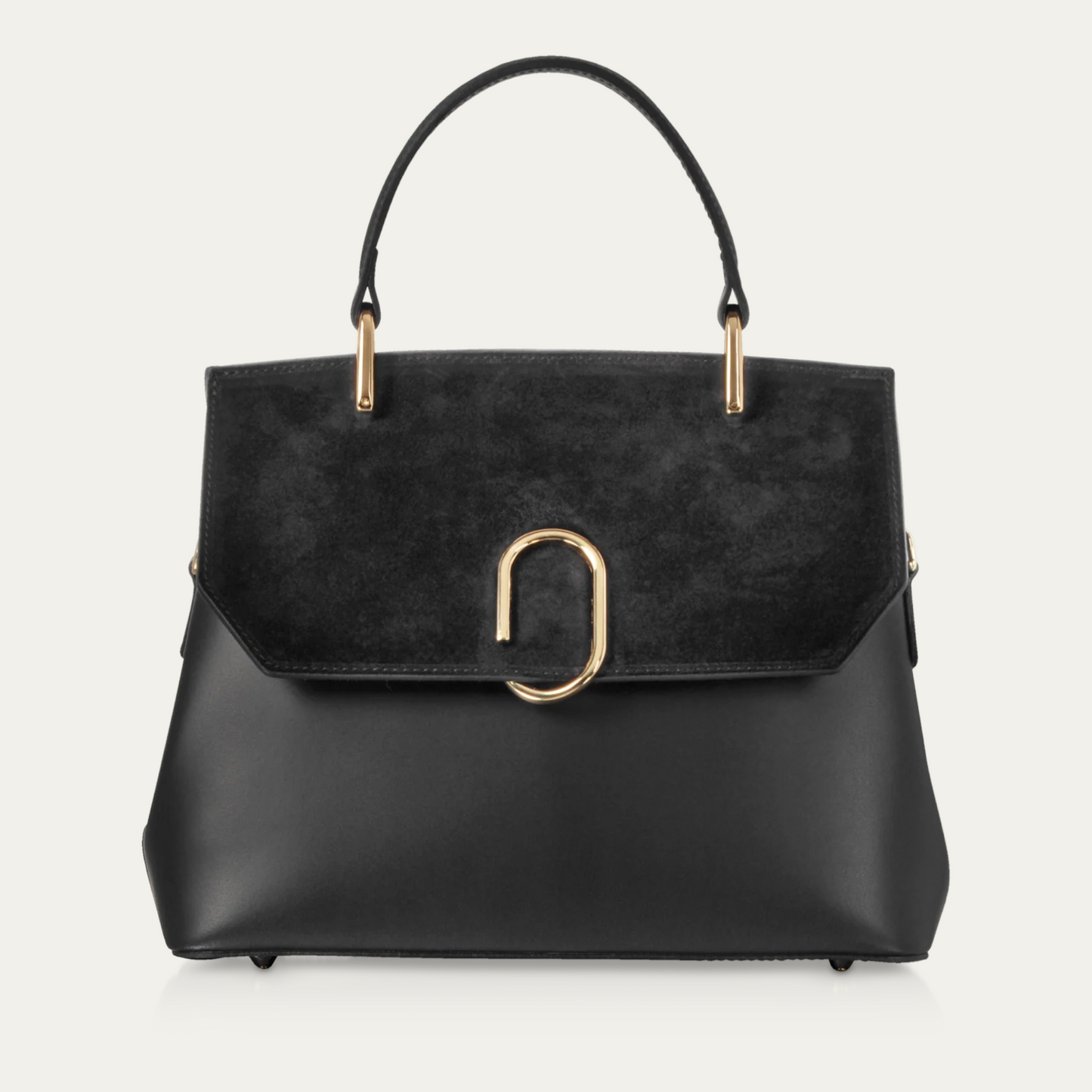 Thais Satchel Bag crafted in smooth genuine Italian calf leather and velvety suede, has a classic structured silhouette with a contemporary design that keeps you discreetly organized day to night. Featuring flap top magnetic snap closure with bold hardware detail, single top handle, zip top and open pocket under flap, two compartments with center zip divider pocket, walled zip pocket, detachable shoulder strap, tonal protective feet, and gold tone hardware detail.
