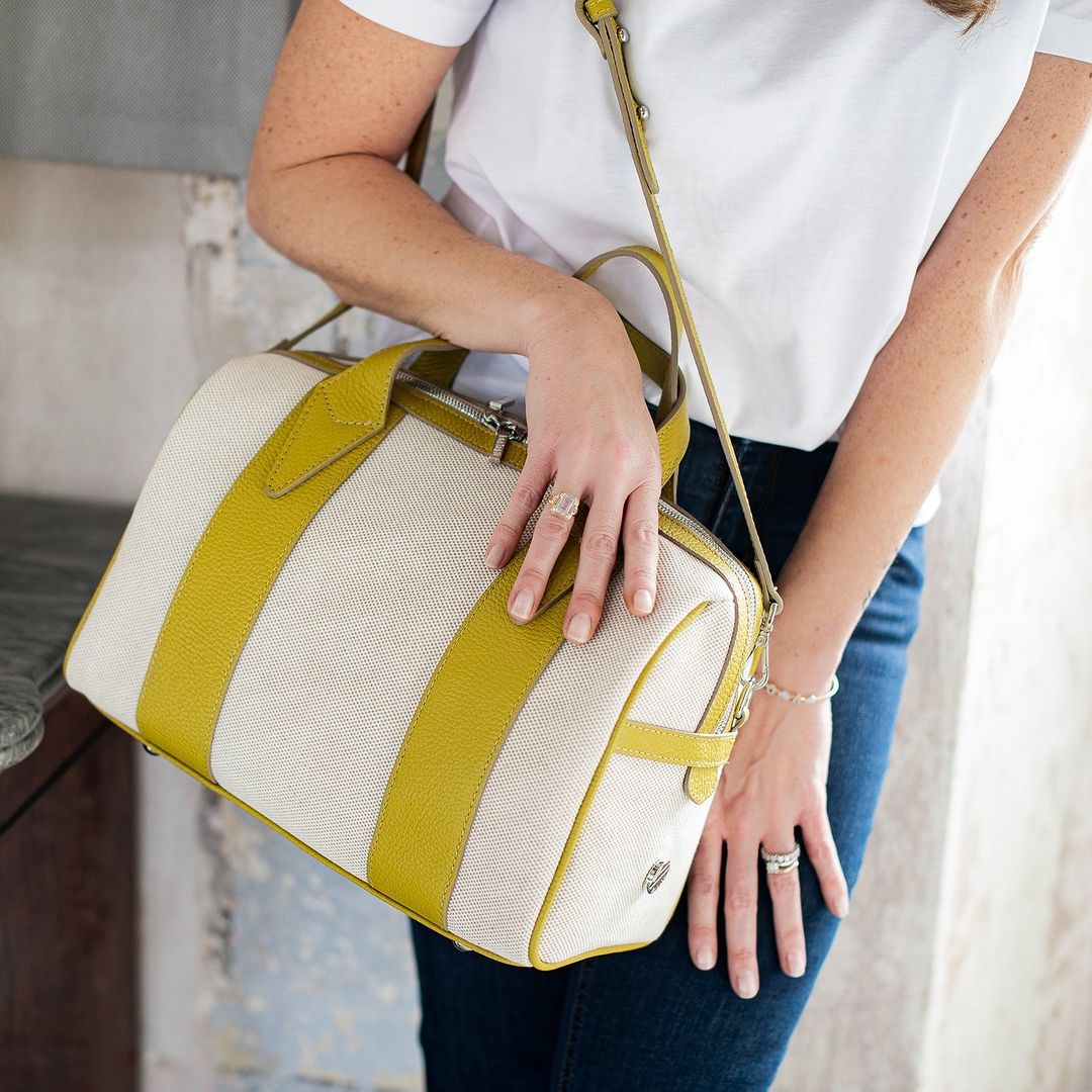 VANITY GRANDE is a Boston bag made of a neutral textured canvas with dear printed contrasting calf Trimmings declined in bright tones. The perfect combination of style and function, this Made in Italy bag features an adjustable shoulder strap, high quality leathers and meticulous craftsmanship, ensuring years of durability and dependable use.