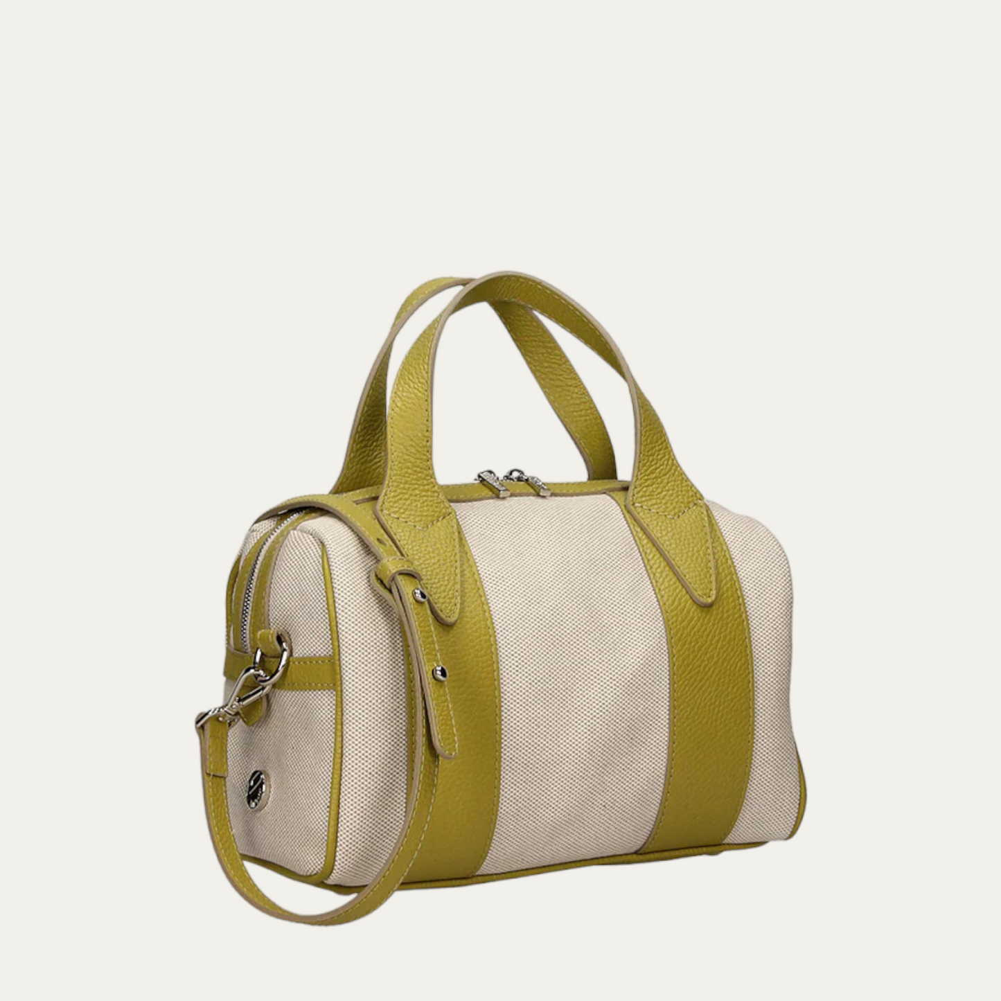 Vanity small is a Boston bag made of a neutral textured canvas with dear printed contrasting calf Trimmings declined in bright tones. The perfect combination of style and function, this Made in Italy bag features an adjustable shoulder strap, high quality leathers and meticulous craftsmanship, ensuring years of durability and dependable use. Perfect for those who prefer classical shapes and small bags.