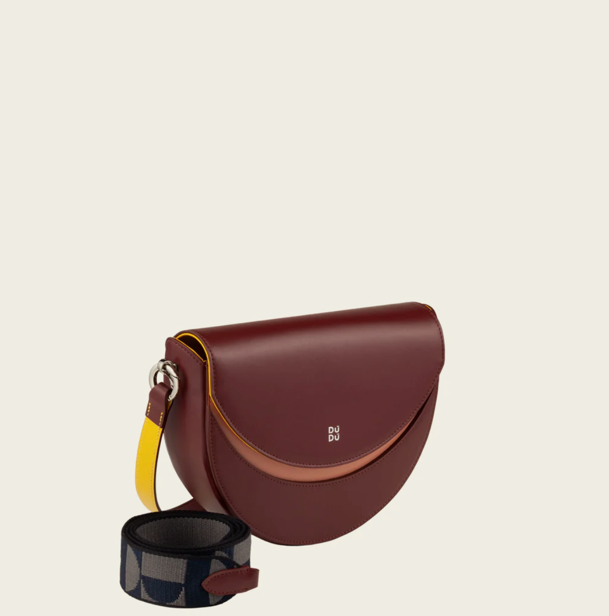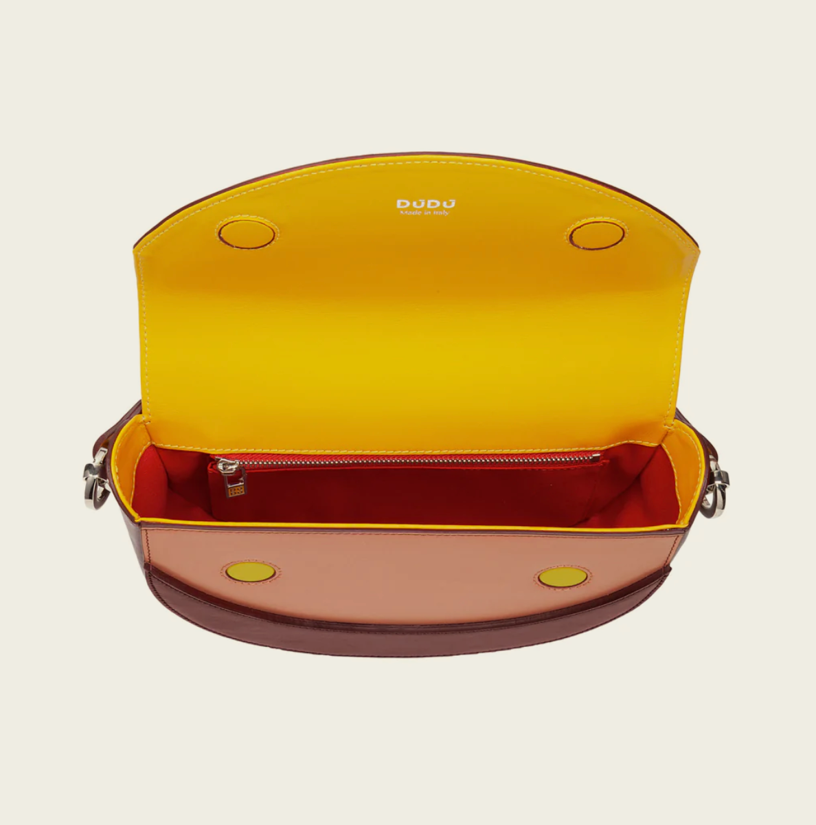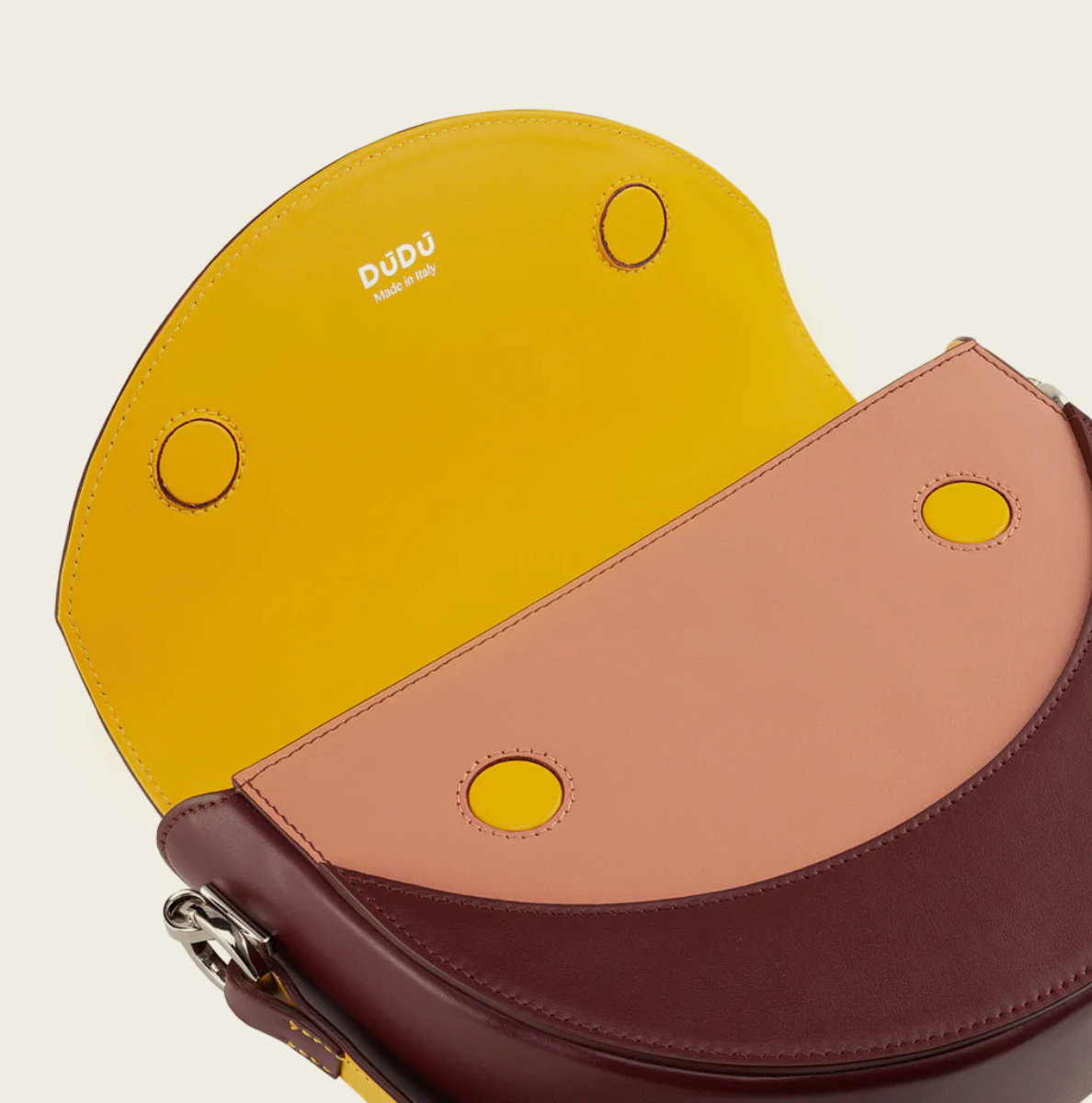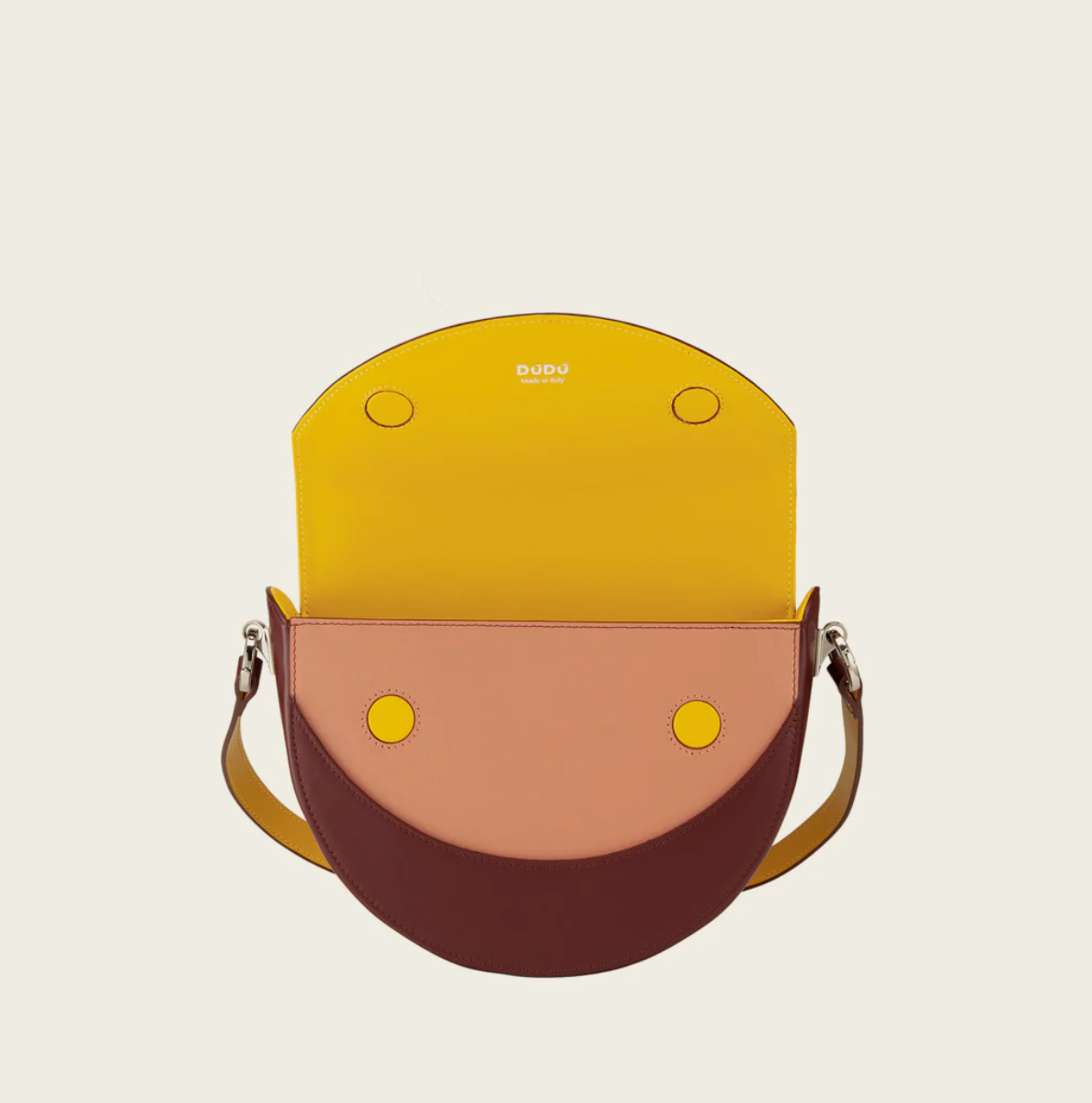 With its rounded shapes and playful spirit, our Venezia saddle bag is the it-bag of the Made in Italy collection. The modern and feminine attitude of the bag is reinforced by its distinctive details: its half moon shape, the contrasts of color for a pop look and its double shoulder strap, one in leather and one in recycled cotton polyester with geometric designs. A model that will surprise you, with a unique touch, full of fantasy, femininity and liveliness, perfectly in the spirit of Dudu.