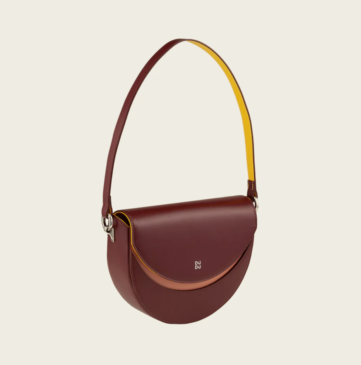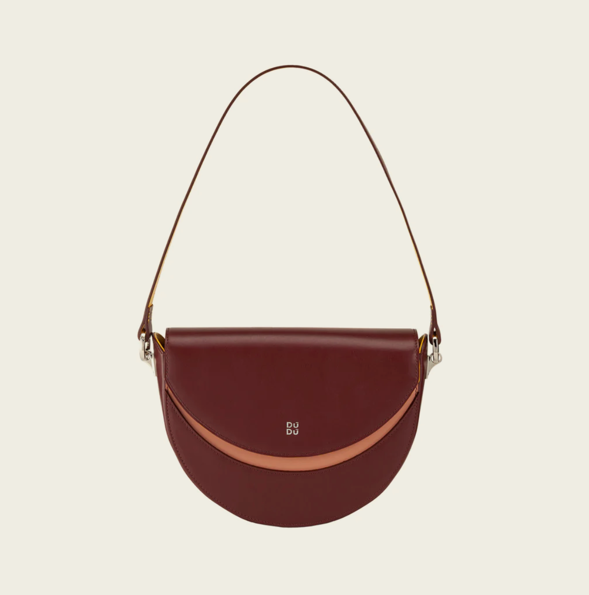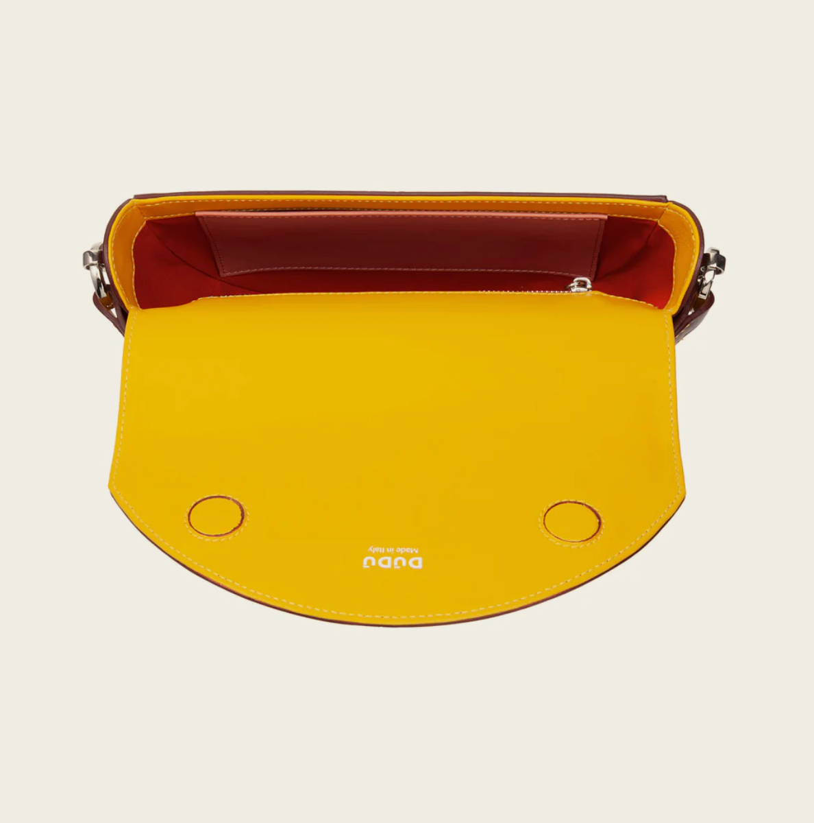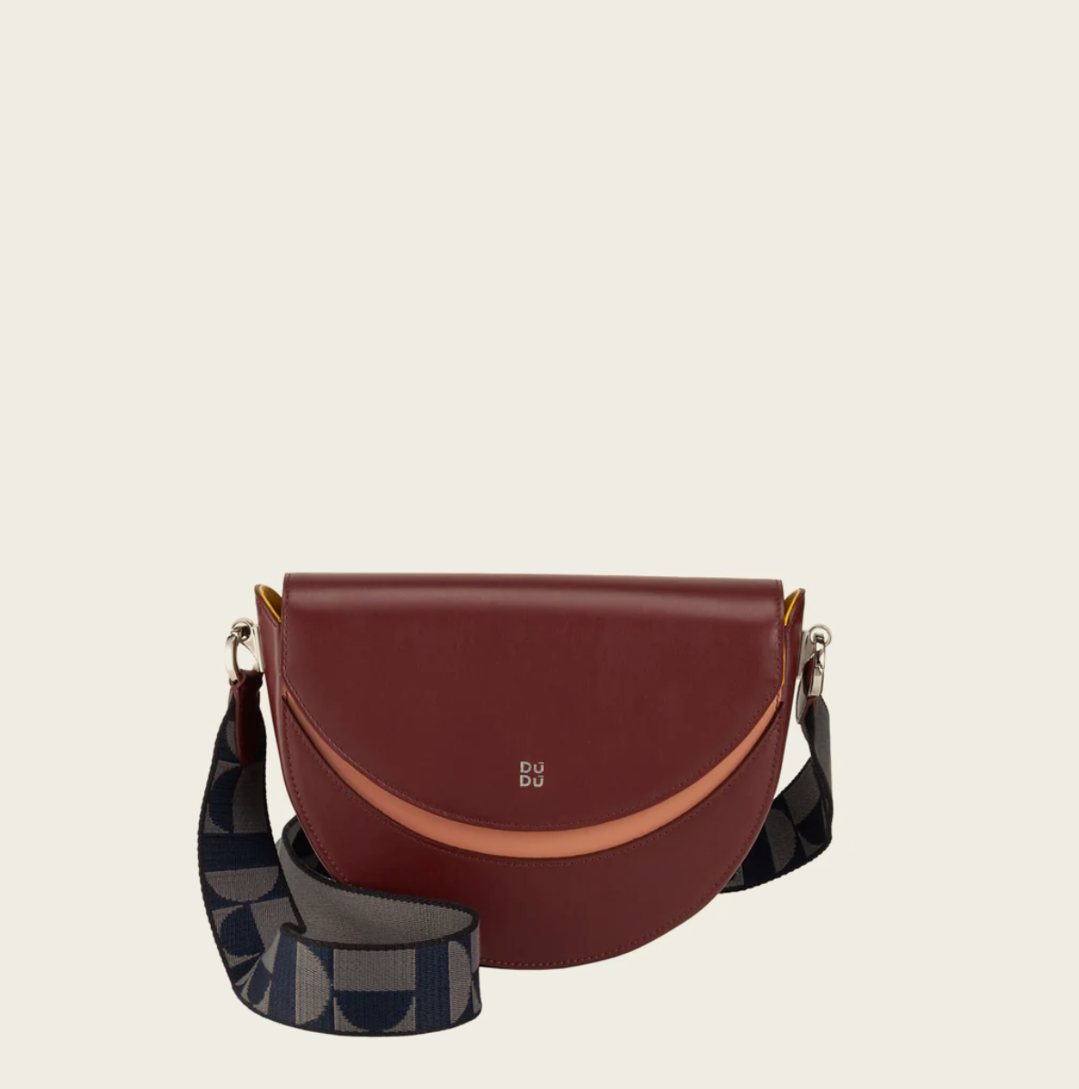 With its rounded shapes and playful spirit, our Venezia saddle bag is the it-bag of the Made in Italy collection. The modern and feminine attitude of the bag is reinforced by its distinctive details: its half moon shape, the contrasts of color for a pop look and its double shoulder strap, one in leather and one in recycled cotton polyester with geometric designs. A model that will surprise you, with a unique touch, full of fantasy, femininity and liveliness, perfectly in the spirit of Dudu.