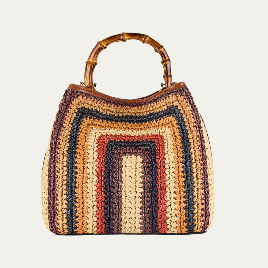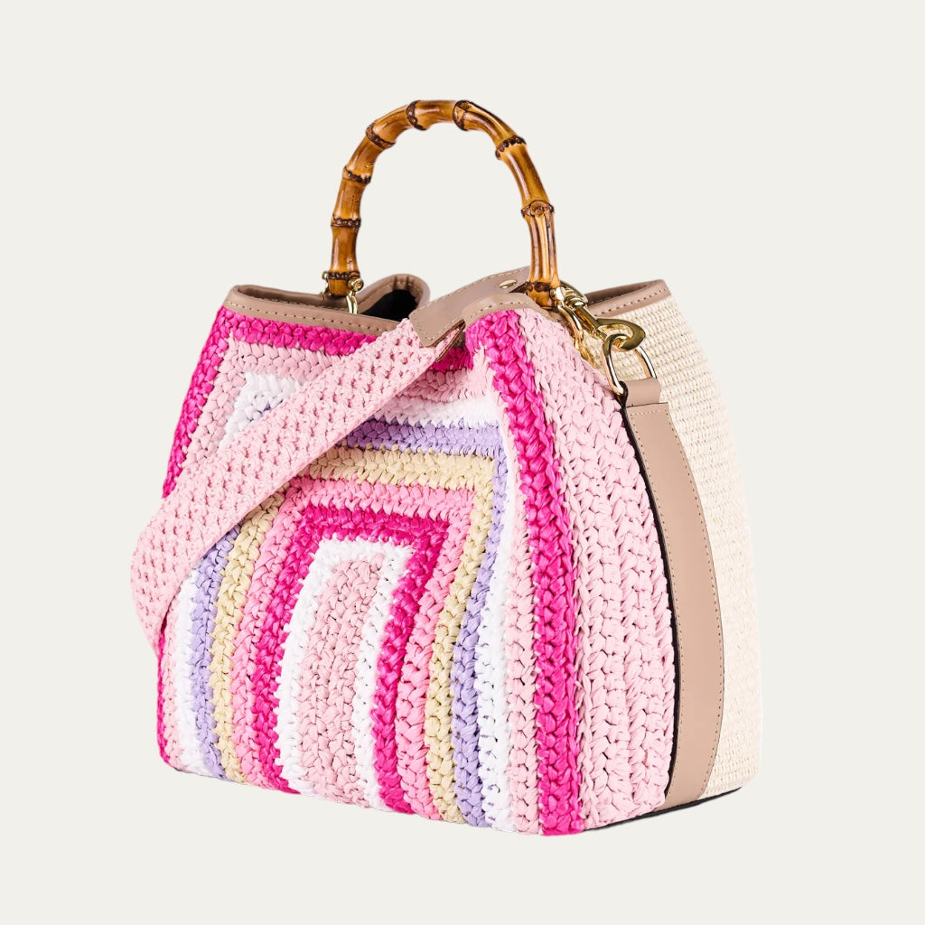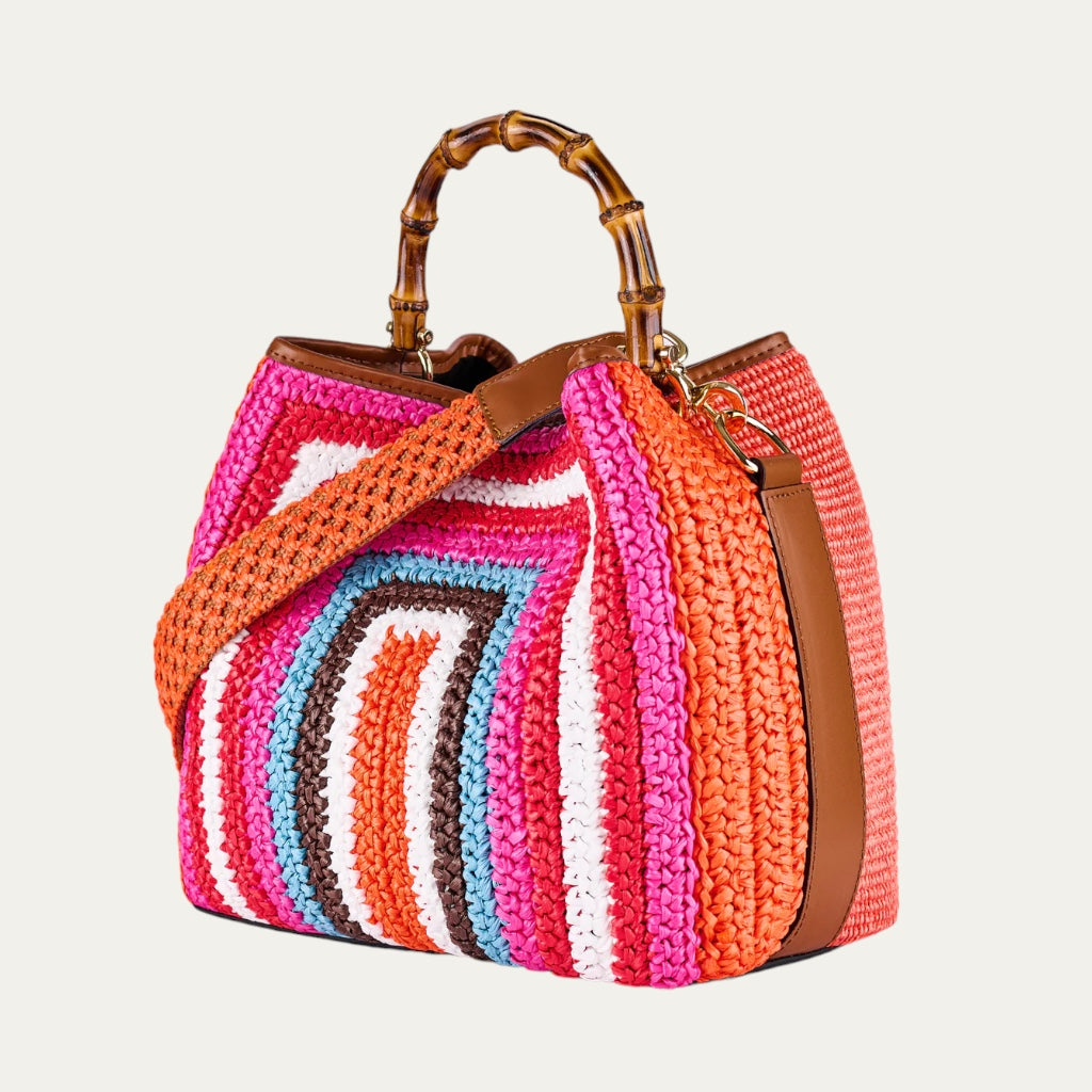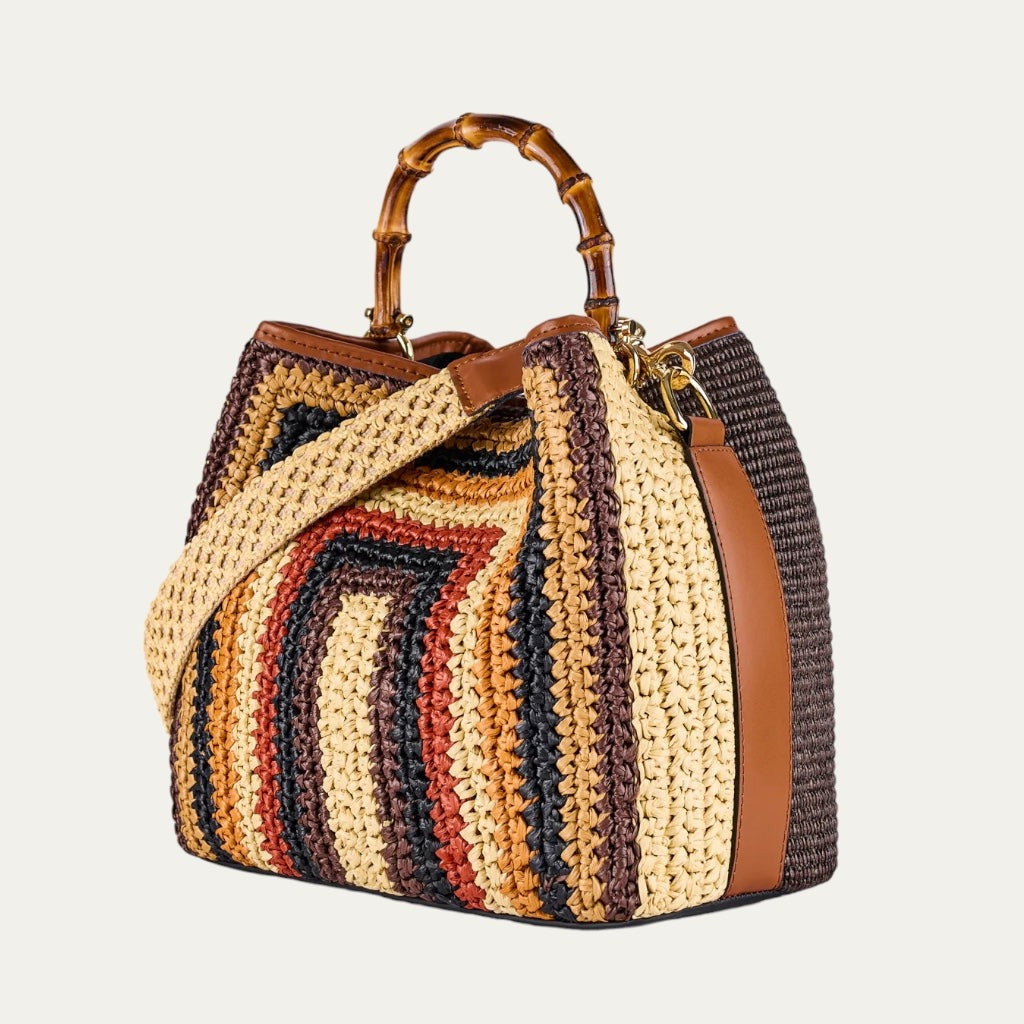 Handmade raffia bucket bag with leather details, bamboo handle, inside pocket and removable raffia shoulder strap with suede details.